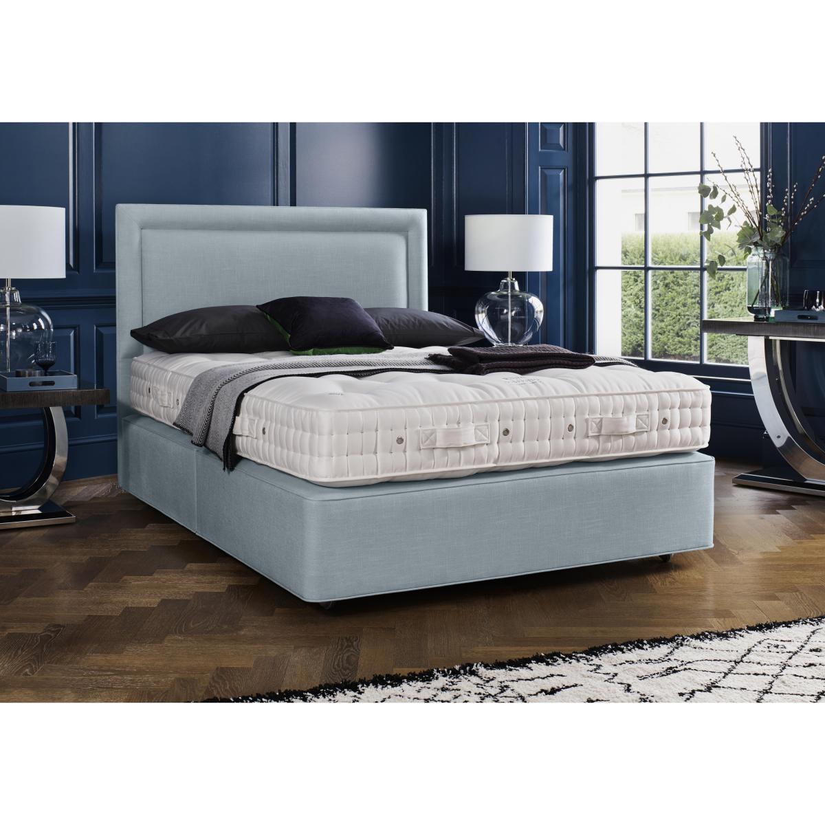 Headboard is an optional extra. Experience true luxury with the Vispring Elite pocket sprung divan set. Beautifully handcrafted in Britain, this divan set pairs the 21 cm deep Vispring Elite mattress with a solid timber-framed base. The base has 600 hand-nested pocket springs in King size for superb support and is filled with coir and blended Platinum Certified British fleece wool and cotton. Shown here in. Gem Celestial - Light Blue (2029. ) Available in 3 different tensions, the accompanying hand-tufted mattress has 1254 vanadium steel hand nested pocket springs in King size, and features cooling all-natural fillings that include bonded Platinum Certified British fleece wool and cotton. It’s covered in fine ticking and has wool-upholstered borders, handles and air vents. The Vispring Elite pocket sprung divan set is one of several gorgeous Vispring divan and mattress sets available at Furniture Village. Product images are representative. Find out more. Did you know?. The mattress should be aired for four hours after delivery to freshen and remove any aroma from storage. It may take time for your mattress to attain its full size once the springs have settled to the correct position. This is due to the mattress being upright during transit. Settlement of fillings and indentations caused by body weight compressing the fillings are natural and not considered defects. This can be minimised by regular rotating (unless yours is a dual tension mattress).