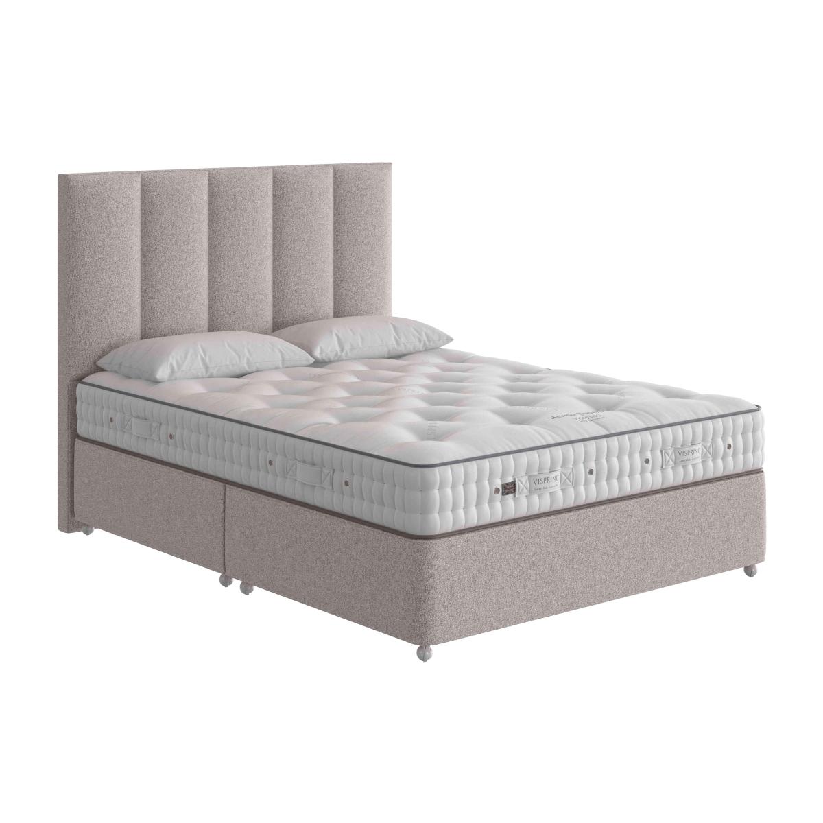 If you’re investing in a great night’s sleep, choose the handcrafted luxury of Vispring. Each Herald Superb bed combines a cabinet quality divan base with a luxurious pocket sprung mattress. The mattresses generously layer all natural British fleece wool, horsehair and cotton around hand nested vanadium pocket springs. The sprung divan bases are upholstered in fine fabric and include a choice of drawer storage. Headboard shown available separately. The Vispring Herald Superb divan set has luxurious British fleece wool and cotton fillings. Superbly sprung, for responsive support where you need it most. Why you’ll love it Vispring luxury with a contemporary oak-legged base. Choose from four comfort levels. With natural British fleece wool, cotton, and horsehair. Vispring’s vanadium pocket springs offer responsive support. Finest quality ticking, hand tufted with wool washers. 2 rows of hand side-stitching for edge to edge support. Strong, wool-upholstered borders with air vents and handles. Drawer storage options are available. Base is in a wide choice of beautiful Vispring fabrics. What you need to know Mattress type: Pocket spring. Mattress depth: 21cm + 6cm doming Mattress firmness:Soft, Medium, Firm, Extra Firm. Split tension available in King and Super King size. Mattress springs: 1476 vanadium steel, 6 turn pocket springs in king size, in calico pockets. Mattress fillings: Bonded British fleece wool and cotton, horsehair, blended British fleece wool and cotton. Mattress cover:High quality ticking. Sizes: Super king, king, double, small double, single. Requires turning: Yes. Turn with the seasons for optimum performance. Base construction: Traditional sprung platform base. Solid timber frame, FSC certified. Base springs: 950 hand nested pocket springs in king size. Base fillings: Coir, blended British fleece wool and cotton. Mattress care:Air for 4 hours before using to remove any odour. Allow at least 4 hours for springs to settle and for mattress to attain its full size. Indentations caused by settlement of fillings or body weight are normal and are not considered defects. Rotate regularly, turn seasonally.