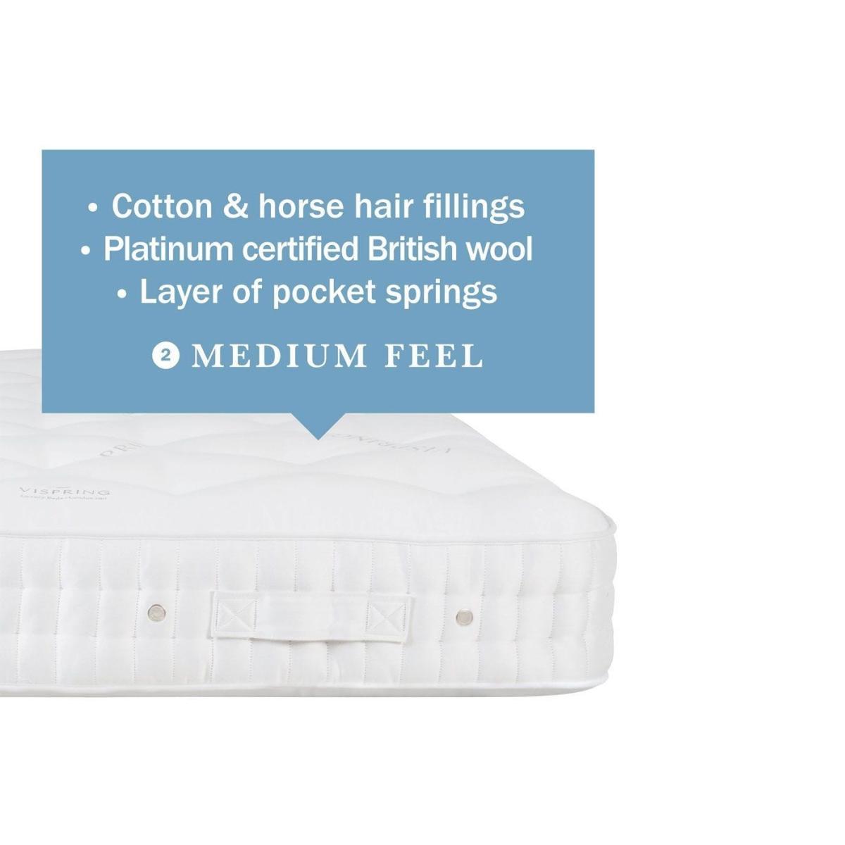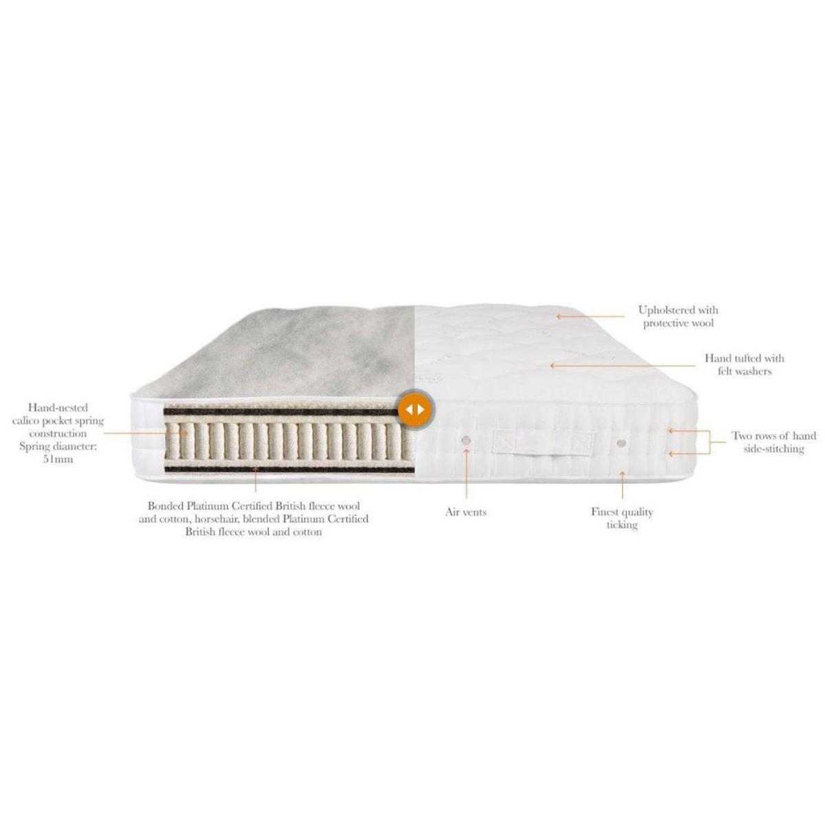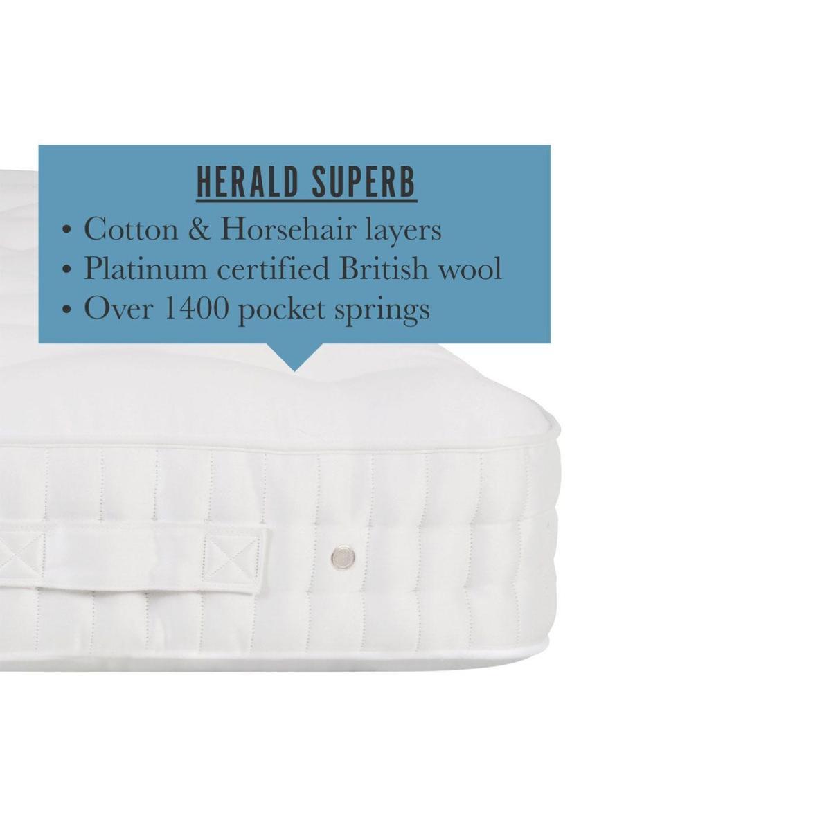 Truly tailored from start to finish, every Herald Superb is hand made by expert craftsmen within Vi-Spring's workshop on the South West coast. Comprising a mixture of bonded and blended platinum certified British fleece wool, Turkish long-fibre cotton and durable horsehair, each mattress wicks away humidity thanks to its breathable materials. At the core of a king size mattress sits 1,475 hand-nested calico pocketed springs. These are able to move independently from one another providing a supportive sleep by moulding to the contours of the body. To ensure optimum comfort, this mattress comes in a choice of tensions from soft to firm, to suit every kind of sleeper. While inferior quality mattresses require a metal frame to provide shape, the Herald Superb relies on two rows of masterful hand side-stitching that bonds the body to the spring unit giving the mattress a naturally supportive and resilient structure. Upholstered in an exquisite Belgian ticking of bonded British wool, this mattress is finished with matching piping and hand tufted felt washers that hold the core elements in place and create the trademark domed surface. Understanding that a true piece of craft also requires care, eight horizontal handles allow for easy installation and turning while a series of ventilated gauze roundels ensure a breathable interior.