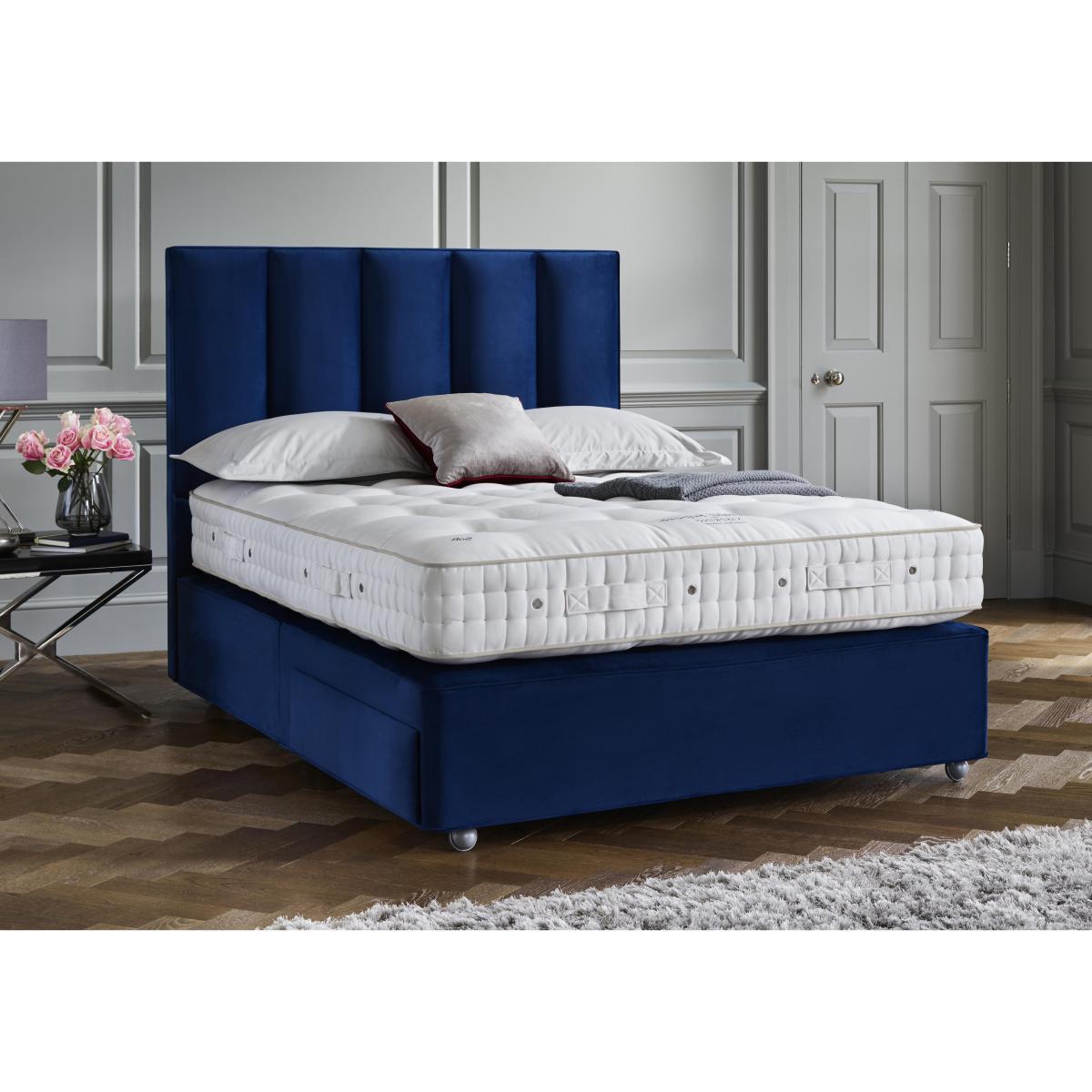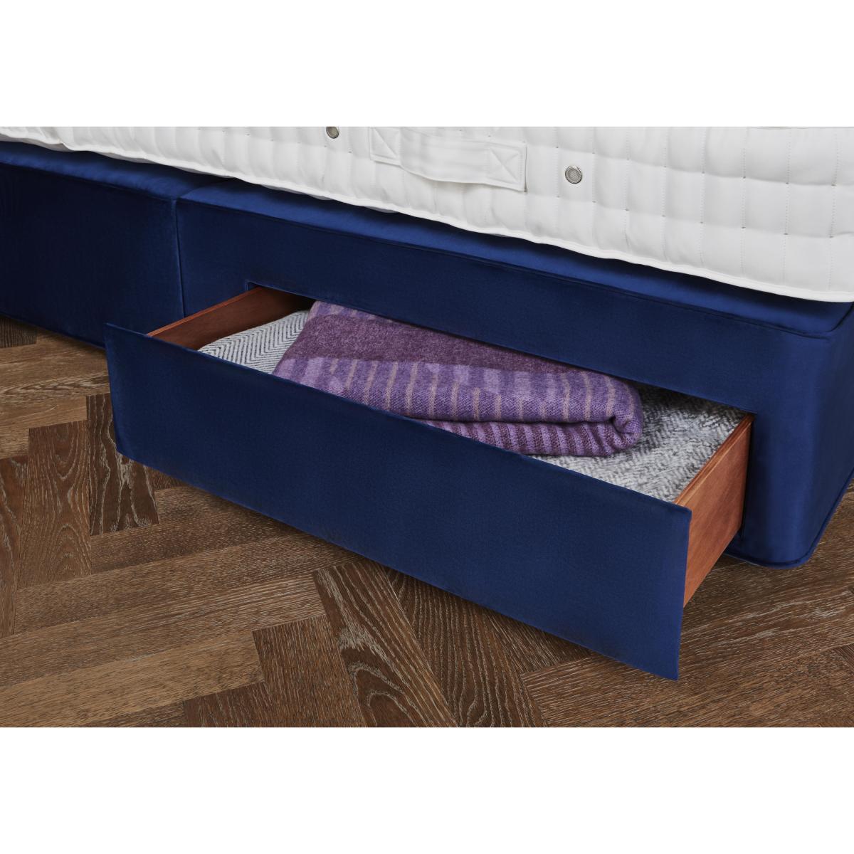 If you’re investing in a great night’s sleep, choose the handcrafted luxury of Vispring. Each Herald Superb bed combines a cabinet quality divan base with a luxurious pocket sprung mattress. The mattresses generously layer all natural British fleece wool, horsehair and cotton around hand nested vanadium pocket springs. The sprung divan bases are upholstered in fine fabric and include a choice of drawer storage. Headboard is an optional extra. The handcrafted Vispring Herald Superb pocket sprung divan set is, by any measure, superb. It features a 21 cm deep hand tufted mattress with 1476 six-coil vanadium steel pocket springs in King size, hand nested in calico. It’s filled with bonded Platinum Certified British fleece wool and cotton, horsehair, and blended Platinum Certified British fleece wool and cotton. Finished with a wool worsted ticking cover, this luxury mattress has wool borders, two rows of hand side-stitching, air vents and handles. Contemporary in style, the timber-framed upholstered sprung divan base is set on taller oak feet and has optional storage drawers. With 950 hand nested springs in King size, it’s filled with coir and a blend of British fleece wool and cotton. Shown here in. Plush Royal- Dark Blue (2115. ) The Vispring Herald Superb divan set is one of several handcrafted Vispring divan sets. Product images are representative. Find out more. Did you know?. The mattress should be aired for four hours after delivery to freshen and remove any aroma from storage. It may take time for your mattress to attain its full size once the springs have settled to the correct position. This is due to the mattress being upright during transit. Settlement of fillings and indentations caused by body weight compressing the fillings are natural and not considered defects. This can be minimised by regular rotating (unless yours is a dual tension mattress).