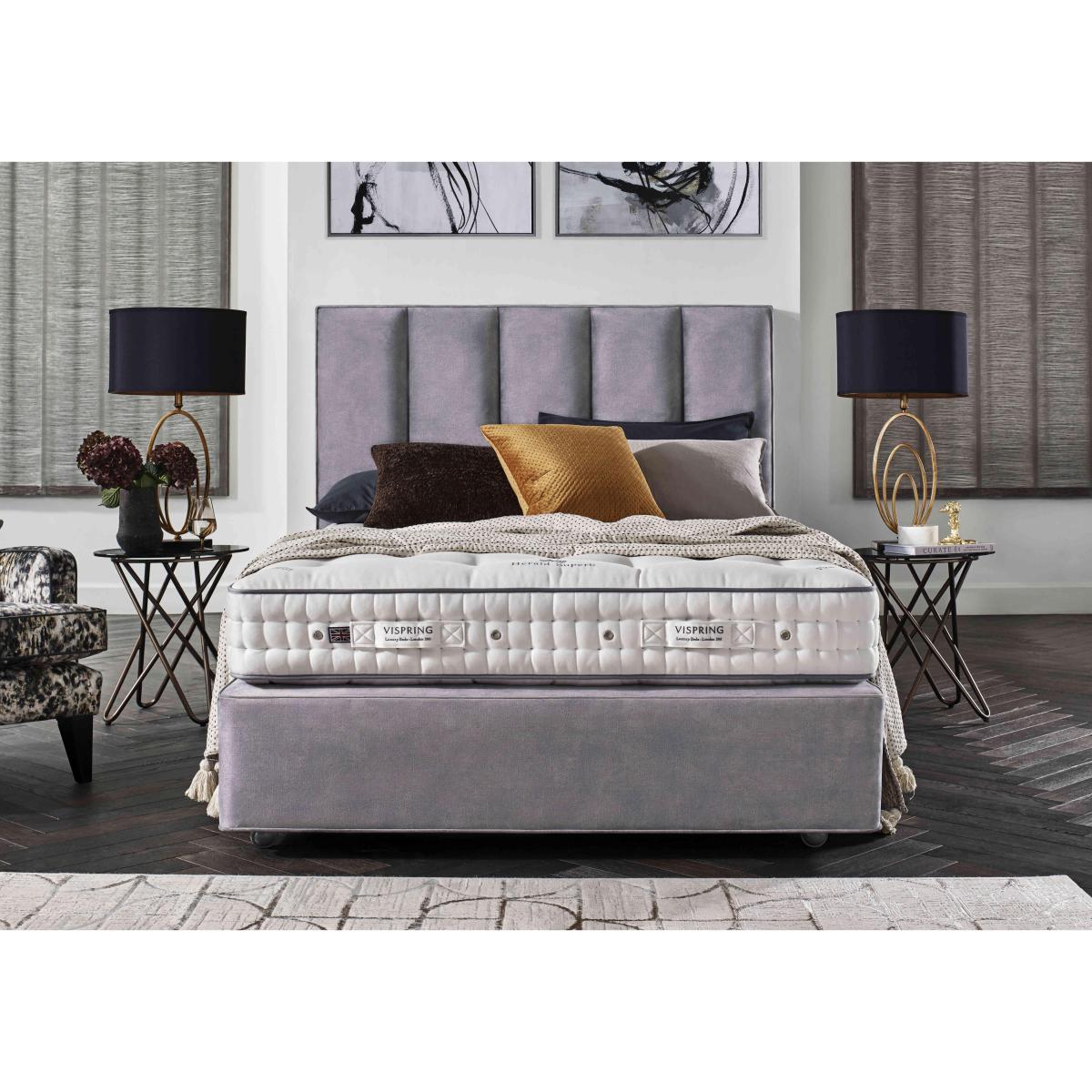 If you’re investing in a great night’s sleep, choose the handcrafted luxury of Vispring. Each Herald Superb bed combines a cabinet quality divan base with a luxurious pocket sprung mattress. The mattresses generously layer all natural British fleece wool, horsehair and cotton around hand nested vanadium pocket springs. The sprung divan bases are upholstered in fine fabric and include a choice of drawer storage. Headboard shown available separately. The Vispring Herald Superb divan set has luxurious British fleece wool and cotton fillings. Superbly sprung, for responsive support where you need it most. Why you’ll love it Vispring luxury with a contemporary oak-legged base. Choose from four comfort levels. With natural British fleece wool, cotton, and horsehair. Vispring’s vanadium pocket springs offer responsive support. Finest quality ticking, hand tufted with wool washers. 2 rows of hand side-stitching for edge to edge support. Strong, wool-upholstered borders with air vents and handles. Drawer storage options are available. Base is in a wide choice of beautiful Vispring fabrics. What you need to know Mattress type: Pocket spring. Mattress depth: 21cm + 6cm doming Mattress firmness:Soft, Medium, Firm, Extra Firm. Split tension available in King and Super King size. Mattress springs: 1476 vanadium steel, 6 turn pocket springs in king size, in calico pockets. Mattress fillings: Bonded British fleece wool and cotton, horsehair, blended British fleece wool and cotton. Mattress cover:High quality ticking. Sizes: Super king, king, double, small double, single. Requires turning: Yes. Turn with the seasons for optimum performance. Base construction: Traditional sprung platform base. Solid timber frame, FSC certified. Base springs: 950 hand nested pocket springs in king size. Base fillings: Coir, blended British fleece wool and cotton. Mattress care:Air for 4 hours before using to remove any odour. Allow at least 4 hours for springs to settle and for mattress to attain its full size. Indentations caused by settlement of fillings or body weight are normal and are not considered defects. Rotate regularly, turn seasonally.
