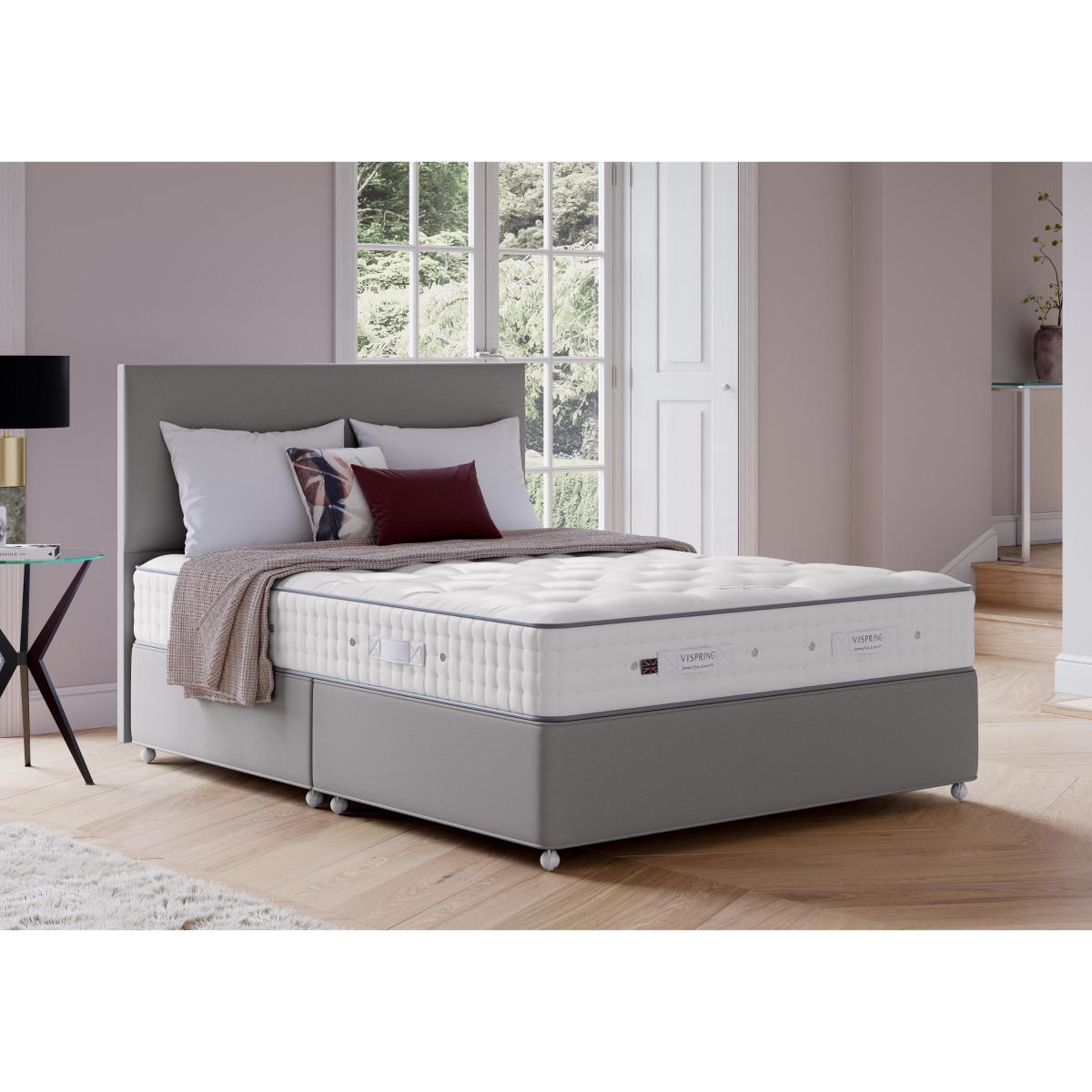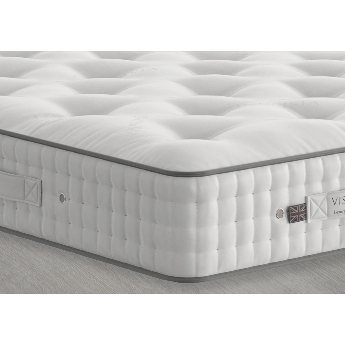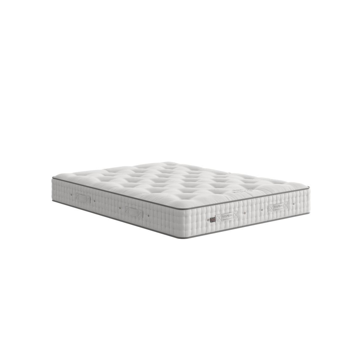 Another masterpiece from Vispring. The luxurious Kingsbridge mattress boasts all natural, wool and horsetail fillings and those famous vanadium steel pocket springs. Why you’ll love it. Deeply luxurious pocket sprung mattress from Vispring. In a choice of comfort levels. Hand-teased horsetail fillings blended with Devonshire wool. Feel the support of Vispring’s famous vanadium pocket springs. Hand tufted with felt washers, 3 rows of hand side-stitching. Protective wool-upholstered borders with air vents and handles. What you need to know. Mattress type: Pocket spring. Depth: 23cm + 6cm doming. Firmness: Soft, Medium, Firm, Extra Firm. Split tension available in King and Super King size. 2030 vanadium steel, 6 turn pocket springs in king size, in calico pockets. Fillings: British fleece wool, hand-teased horsetail blended with Devonshire wool. Cover: fine quality ticking. Sizes: Super king, king, double, small double, single. Requires turning: Yes. Turn with the seasons for optimum performance. Mattress care: Air for 4 hours before using to remove any odour. Allow at least 4 hours for springs to settle and for mattress to attain its full size. Indentations caused by settlement of fillings or body weight are normal and are not considered defects. If used on a slatted bed frame, slats must be no more than 7 cm apart. Rotate regularly.