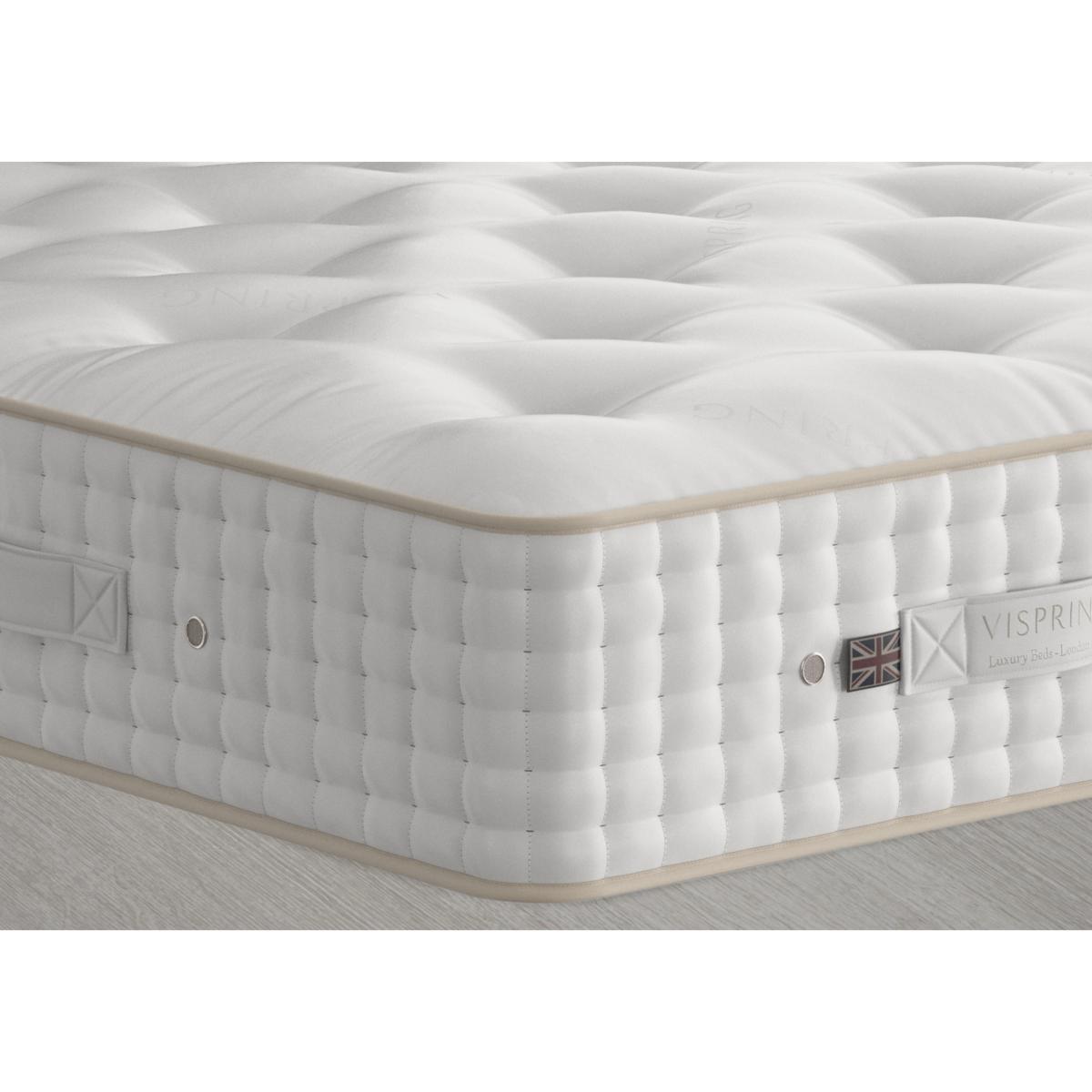 The Vispring Magnificence mattress boasts all natural fillings including Moosburger® horsetail, cotton, cashmere, mohair and real Shetland wool. Sumptuous and luxurious. Why you’ll love it. Magnificently luxurious fillings. In a choice of comfort levels. All natural fillings include Moosburger® horsetail, cashmere and mohair. Vispring’s famous vanadium springs. Hand-tied woollen tufts, 5 rows of hand side stitching. Protective wool and coir upholstered borders with air vents and handles. What you need to know. Mattress type: Pocket spring. Depth: 23cm + 6cm doming. Firmness: Soft, Medium, Firm, Extra Firm. Split tension available in King and Super King size. 2812 vanadium steel, 6 turn pocket springs in king size, in calico pockets. Fillings: hand-opened Austrian Moosburger® horsetail, hand-teased real Shetland wool blended with cashmere, mohair, and cotton. Cover: Finest quality ticking. Sizes: Super king, king, double, small double, single. Requires turning: Yes. Turn with the seasons for optimum performance. Mattress care: Air for 4 hours before using to remove any odour. Allow at least 4 hours for springs to settle and for mattress to attain its full size. Indentations caused by settlement of fillings or body weight are normal and are not considered defects. If used on a slatted bed frame, slats must be no more than 7 cm apart. Rotate regularly.
