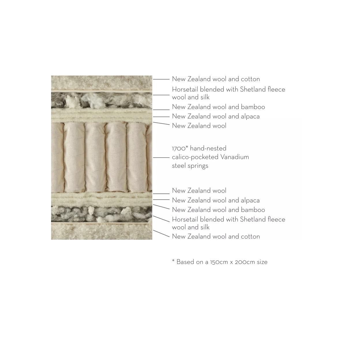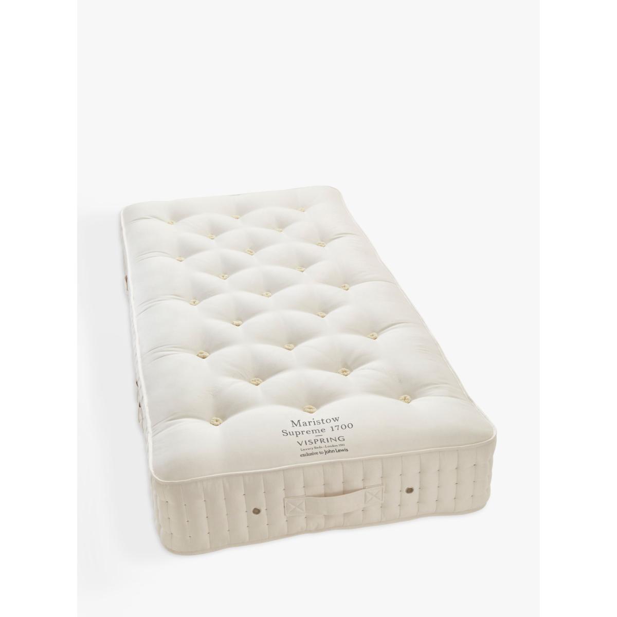 Made in the UK The Maristow Supreme 1700 range of mattreses from Vispring are designed with layers of natural materials alongside a pocketed Vanadium steel spring system. Handmade in Plymouth with a total of 1700 pocket springs in the king size model, this range offers tailored support each night and a medium tension level of comfort. Natural Materials Designed with generous layers of natural fillings, that include; Shetland fleece wool, silk and bamboo, as well as breathable pure cotton, this mattress maintains a natural airflow throughout the night. Providing a resilient and durable feel, sustainably-sourced natural materials absorb humidity so that you feel cool and comfortable, while ensuring that your sleep environment stays hygienic. Vanadium Steel Pocket Springs This support system is designed with hand-nested springs in a honeycomb formation, to offer tailored, responsive and effective support for your entire body. Enveloped by the natural fillings, pocket springs also help to maintain the structure of your mattress. M-PURE Cover M-PURE is an exclusive, sustainable and chemical-free flame retardant ticking. This cover has passed rigourous testing that's required by the British Safety & Fire Regulations. Made from a natural, bio-based raw material, it continues to reduce the environmental footprint of Vispring products throughout their full life cycle. Cotton felt tufts and 3 rows of hand side-stitching offer a premium finishing touch. Vispring 30 Year Guarantee To register your guarantee, please click Try before you buy This is an important purchase and it’s worthwhile to try your choice of mattress in store to make sure it's right for you. Our store Partners will be able to tell you more about its benefits, and recommend options based on your needs.