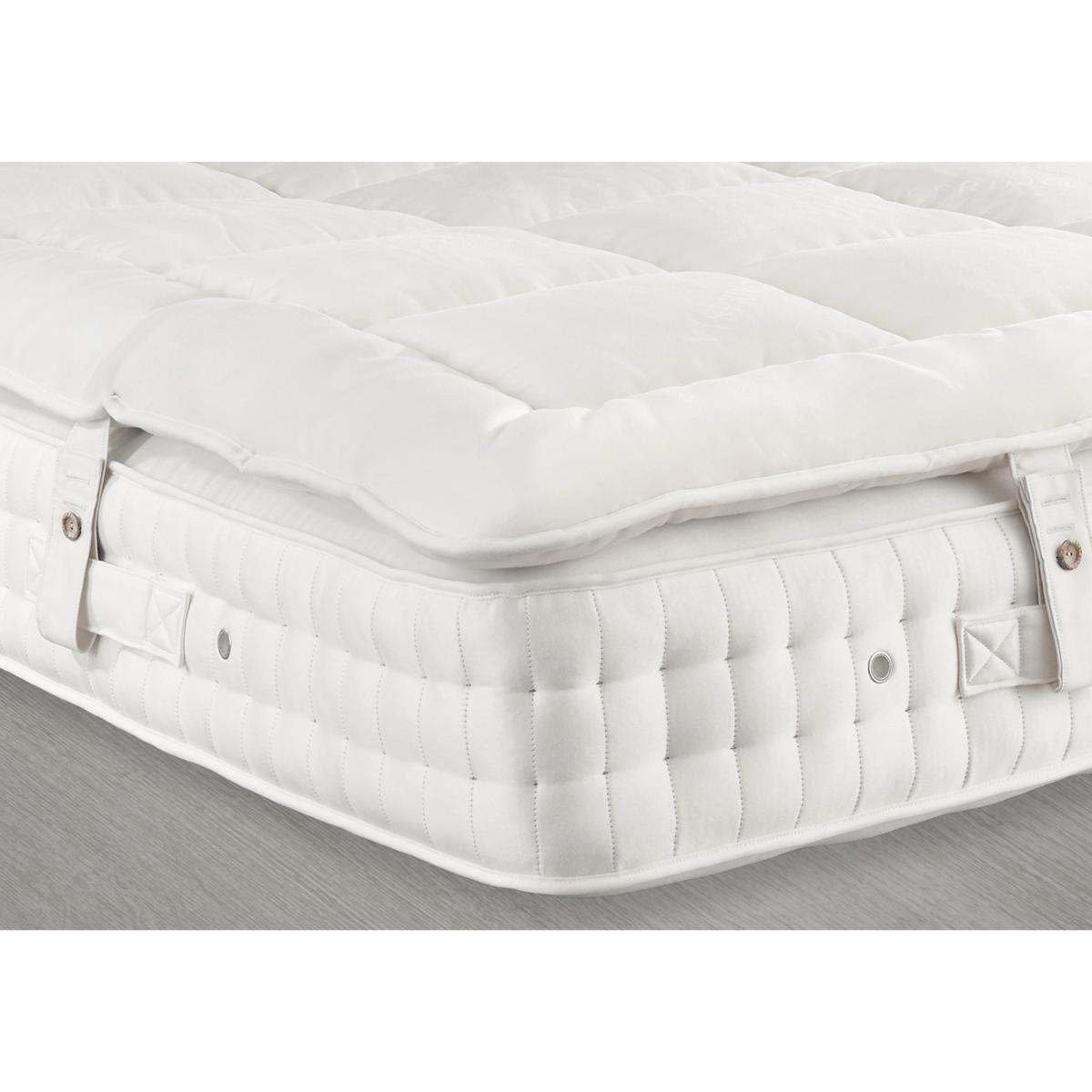 Handcrafted by Vispring in Britain. Cushioned with natural wool, cotton, cashmere and silk fillings. Gives your mattress the feel of Vispring luxury. Make your Vispring mattress even more comfortable with the Vispring pillowtop topper. This wonderful topper has all the feel of a pillowtop mattress thanks to its careful construction and wonderful natural fillings. Filled with a cushioning blend of wool, cotton, cashmere and silk, the Vispring pillowtop topper is so luxurious. It’s also very practical, and an easy way to make any mattress more versatile. Turning a mattress increases its lifespan – but can’t be done if your mattress has a built in pillow top. With the Vispring pillowtop topper, you can turn your mattress and replace the pillowtop topper on top of the other side of the mattress for added longevity as well as fabulous comfort. Like everything made by Vispring, the Vispring pillowtop topper is handcrafted in Britain. It’s available in a wide range of mattress sizes from single to super king, and can be used with any brand of mattress. Please note. Your topper may have a faint odour which will dissipate after airing. Settlement of fillings and indentations caused by body weight compressing the fillings are natural and not considered defects. This can be minimised by regularly turning and rotating the topper.