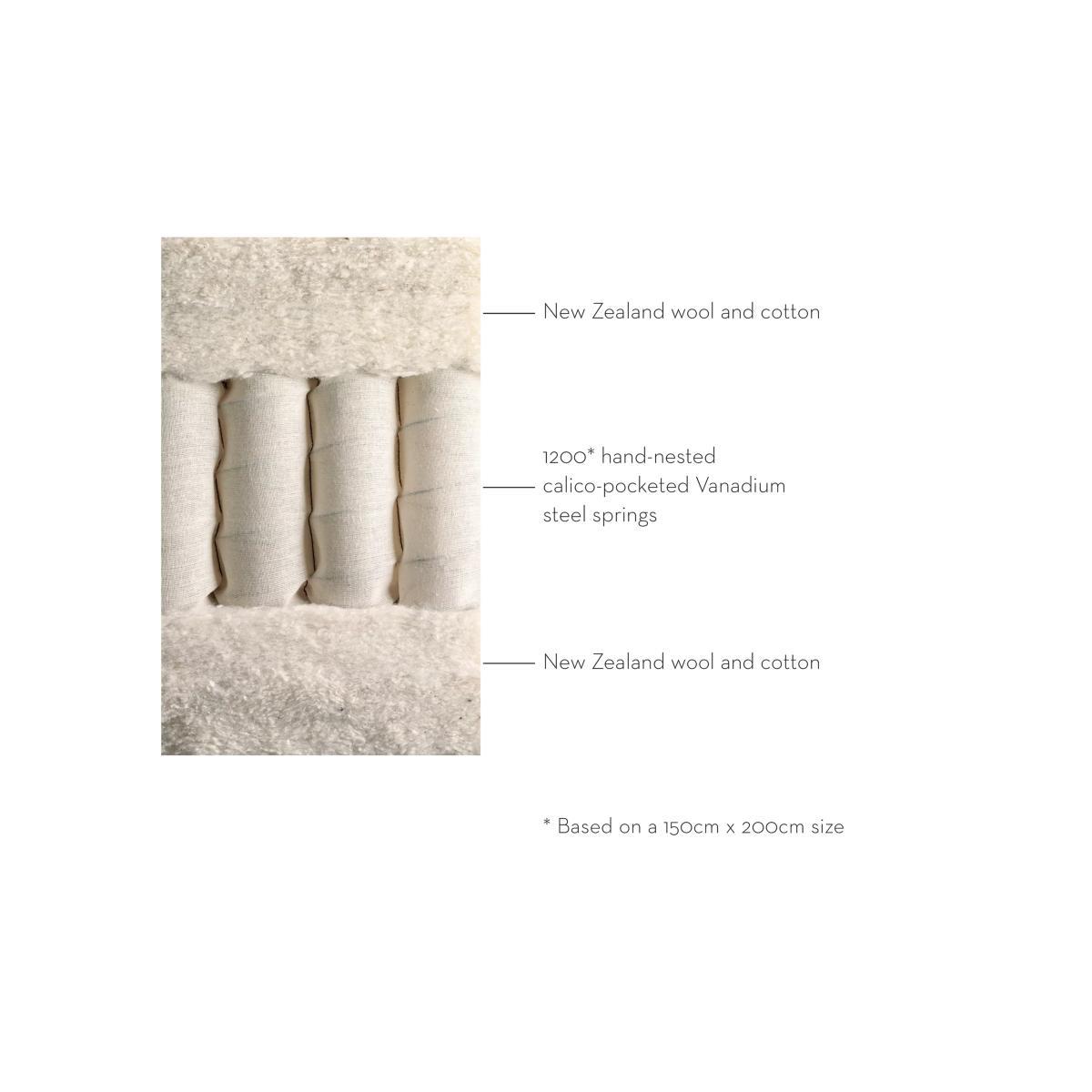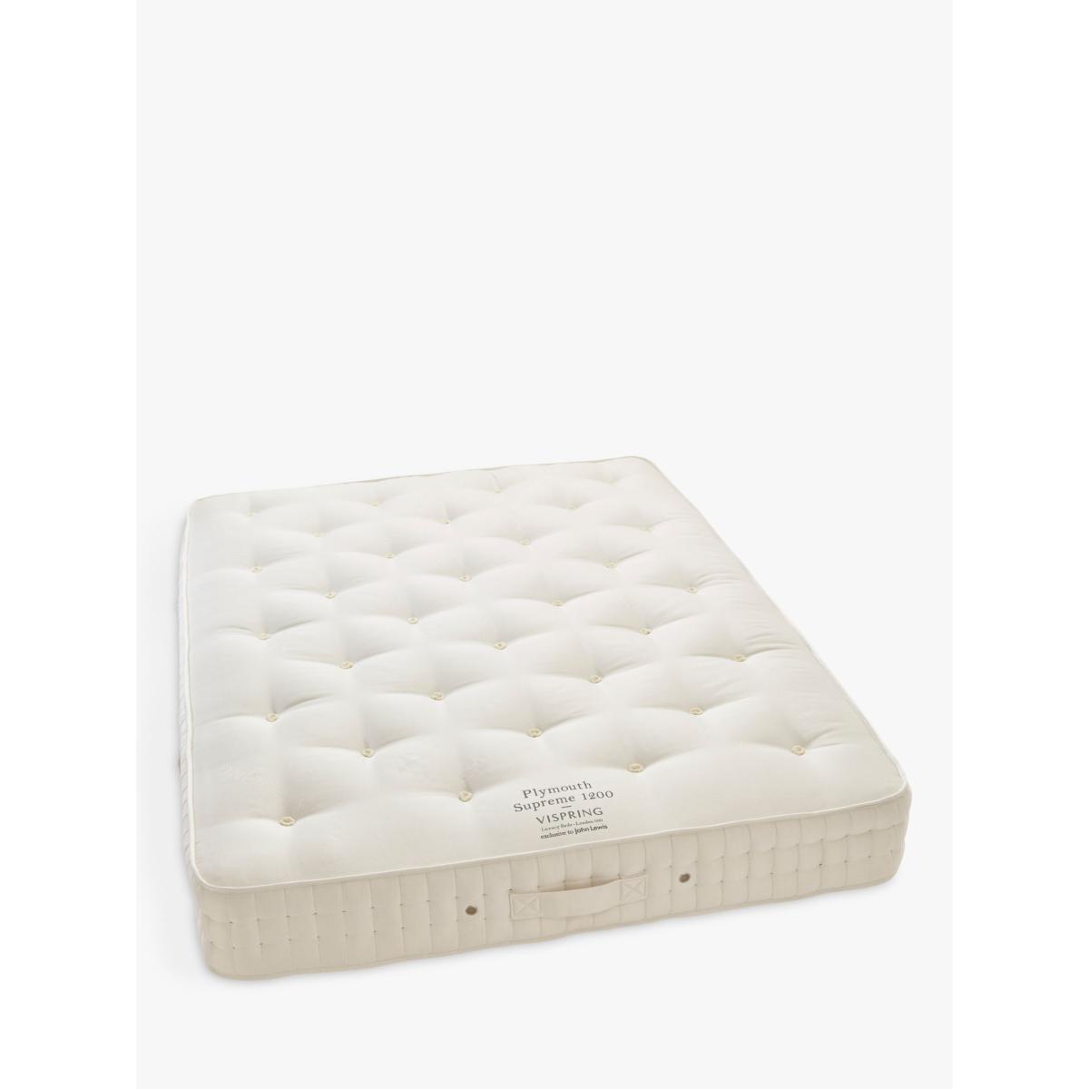 Made in the UK The Plymouth Supreme 1200 range of mattreses from Vispring are designed with layers of natural materials alongside a pocketed Vanadium steel spring system. Handmade in Plymouth with a total of 1200 pocket springs in the king size model, this range offers tailored support each night and a medium tension level of comfort. Natural Materials Filled with generous layers of insulating New Zealand wool and breathable pure cotton, this mattress maintains a natural airflow throughout the night. Providing a cushioned and supportive feel, sustainably-sourced natural materials also wick moisture away while you sleep, so that you feel cool and comfortable, while ensuring that your sleep environment stays hygienic. Vanadium Steel Pocket Springs This support system is designed with hand-nested springs in a honeycomb formation, to offer tailored, responsive and effective support for your entire body. Enveloped by the natural fillings, pocket springs also help to maintain the structure of your mattress. M-PURE Cover M-PURE is an exclusive, sustainable and chemical-free flame retardant ticking. This cover has passed rigourous testing that's required by the British Safety & Fire Regulations. Made from a natural, bio-based raw material, it continues to reduce the environmental footprint of Vispring products throughout their full life cycle. Cotton felt tufts and 2 rows of hand side-stitching offer a premium finishing touch. Vispring 30 Year Guarantee To register your guarantee, please click Try before you buy This is an important purchase and it’s worthwhile to try your choice of mattress in store to make sure it's right for you. Our store Partners will be able to tell you more about its benefits, and recommend options based on your needs.