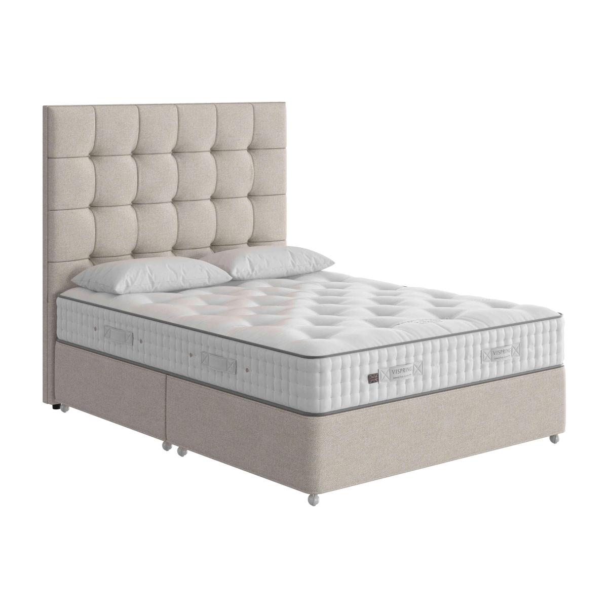It’s the vanadium springs, each with 6 coils, that make the Vispring Regal Superb divan beds so profoundly comfortable. Each individual spring is hand-nested within a honeycomb of calico pockets, surrounded by layers of luxurious fillings include fleece wool, Shetland wool, South American long stranded horsetail and cotton. The sprung bases are upholstered in a wide choice of Vispring’s finest fabrics, with the option of drawer storage. Beautifully handcrafted here in the UK.Headboard shown available separately. Choose the handcrafted Vispring Regal Superb divan set for pocket sprung, responsive comfort for years to come. In a choice of comfort levels, with all natural, luxury fillings. Why you’ll love it Soft and springy support, luxuriously stylish too. Handcrafted in the UK, in a choice of comfort levels. With British fleece wool, Shetland wool, horsetail and cotton. 6-turn vanadium pocket springs for body responsive support. Fine-quality, soft touch mattress ticking. Hand tufted with felt washers, 3 rows of hand side-stitching. Strong, wool-upholstered borders with air vents and handles. Drawer storage options are available. Divan base in a choice of luxury fabrics. What you need to know Mattress type: Pocket spring. Mattress depth: 23cm + 6cm doming. Mattress firmness:Soft, Medium, Firm, Extra Firm. Split tension available in King and Super King size. Mattress springs: 1720 vanadium steel, 6 turn pocket springs in king size, in calico pockets. Mattress fillings: Bonded British fleece wool and cotton, South American long stranded horsetail blended with British fleece wool, blended real Shetland wool and cotton. Mattress cover:Fine quality ticking. Sizes: Super king, king, double, small double, single. Requires turning: Yes. Turn with the seasons for optimum performance. Base construction: Traditional sprung platform base. Solid timber frame, FSC certified. Base springs: 950 hand nested pocket springs in king size. Base fillings: Coir, British fleece wool and cotton. Mattress care:Air for 4 hours before using to remove any odour. Allow at least 4 hours for springs to settle and for mattress to attain its full size. Indentations caused by settlement of fillings or body weight are normal and are not considered defects. Rotate regularly, turn seasonally.