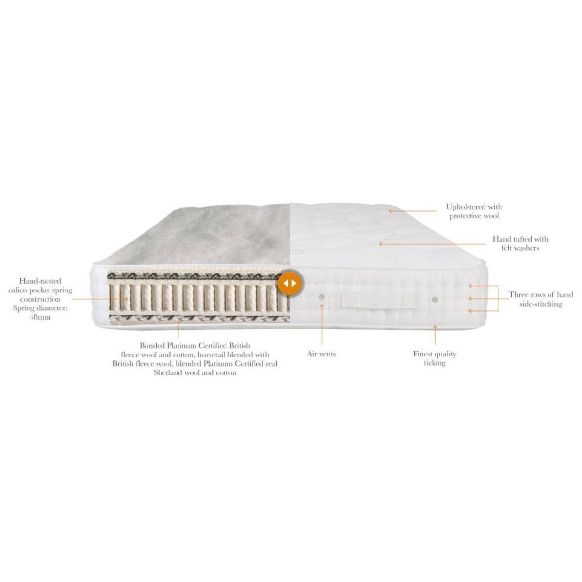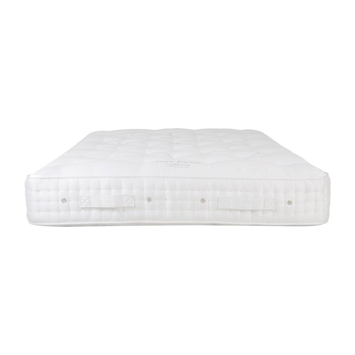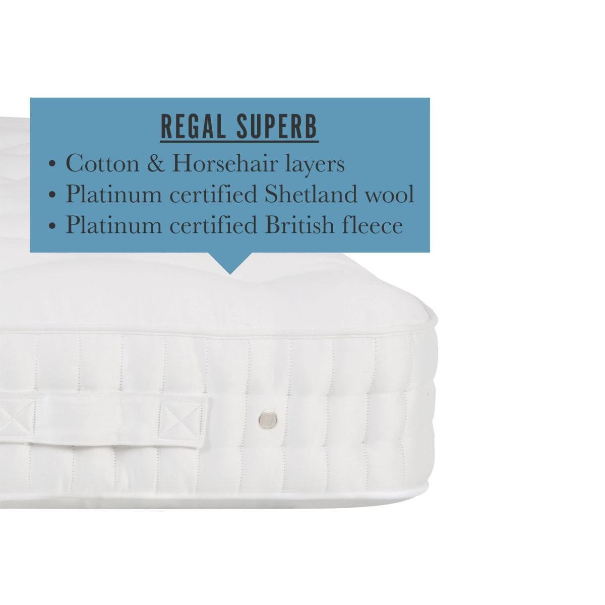 Unlike other mattress manufacturers, Vi-Spring produce all of their own springs using supple alloy coated steel coils that adjust to the body while retaining their original shape. At the core of each mattress, 960 hand-nested calico pocketed springs are able to freely move independently from one another providing a supportive night's sleep that moulds to the contours of the body. To ensure optimum comfort, the springs come in a choice of tensions from soft to firm, to suit every kind of sleeper. Around this honeycomb structure, Vi-Spring fill the Regal Superb with a mix of the finest quality materials including a layer of ultra-resilient horsetail that enhances the bounce of the springs. From the inside out, the materials are layered in a specific order of platinum certified British fleece wool, Turkish long-fibre cotton, Austrian horsetail and hand-teased platinum certified real Shetland wool before being upholstered in an exquisite Belgian ticking with matching piping. While inferior quality mattresses require a metal frame to provide shape, the Regal relies on three rows of masterful hand side-stitching that bonds the body to the spring unit giving the mattress a naturally supportive and resilient structure. To preserve the elegant fillings, the Regal Superb has eight horizontal handles that allow for turning and a series of gauze roundel air vents providing breathability for the open structure of the horsehair and fleeces.