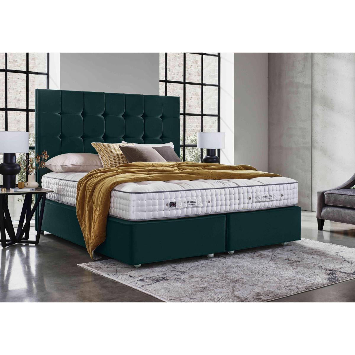 It’s the vanadium springs, each with 6 coils, that make the Vispring Regal Superb divan beds so profoundly comfortable. Each individual spring is hand-nested within a honeycomb of calico pockets, surrounded by layers of luxurious fillings include fleece wool, Shetland wool, South American long stranded horsetail and cotton. The sprung bases are upholstered in a wide choice of Vispring’s finest fabrics, with the option of drawer storage. Beautifully handcrafted here in the UK.Headboard shown available separately. Choose the handcrafted Vispring Regal Superb divan set for pocket sprung, responsive comfort for years to come. In a choice of comfort levels, with all natural, luxury fillings. Why you’ll love it Soft and springy support, luxuriously stylish too. Handcrafted in the UK, in a choice of comfort levels. With British fleece wool, Shetland wool, horsetail and cotton. 6-turn vanadium pocket springs for body responsive support. Fine-quality, soft touch mattress ticking. Hand tufted with felt washers, 3 rows of hand side-stitching. Strong, wool-upholstered borders with air vents and handles. Drawer storage options are available. Divan base in a choice of luxury fabrics. What you need to know Mattress type: Pocket spring. Mattress depth: 23cm + 6cm doming. Mattress firmness:Soft, Medium, Firm, Extra Firm. Split tension available in King and Super King size. Mattress springs: 1720 vanadium steel, 6 turn pocket springs in king size, in calico pockets. Mattress fillings: Bonded British fleece wool and cotton, South American long stranded horsetail blended with British fleece wool, blended real Shetland wool and cotton. Mattress cover:Fine quality ticking. Sizes: Super king, king, double, small double, single. Requires turning: Yes. Turn with the seasons for optimum performance. Base construction: Traditional sprung platform base. Solid timber frame, FSC certified. Base springs: 950 hand nested pocket springs in king size. Base fillings: Coir, British fleece wool and cotton. Mattress care:Air for 4 hours before using to remove any odour. Allow at least 4 hours for springs to settle and for mattress to attain its full size. Indentations caused by settlement of fillings or body weight are normal and are not considered defects. Rotate regularly, turn seasonally.