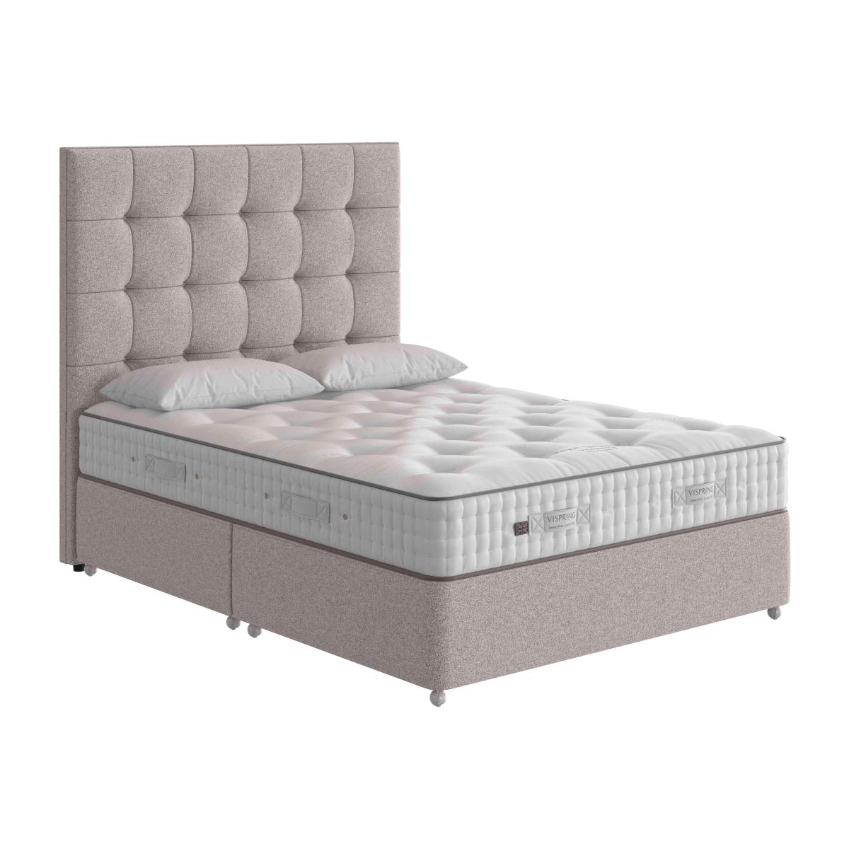 It’s the vanadium springs, each with 6 coils, that make the Vispring Regal Superb divan beds so profoundly comfortable. Each individual spring is hand-nested within a honeycomb of calico pockets, surrounded by layers of luxurious fillings include fleece wool, Shetland wool, South American long stranded horsetail and cotton. The sprung bases are upholstered in a wide choice of Vispring’s finest fabrics, with the option of drawer storage. Beautifully handcrafted here in the UK.Headboard shown available separately. Choose the handcrafted Vispring Regal Superb divan set for pocket sprung, responsive comfort for years to come. In a choice of comfort levels, with all natural, luxury fillings. Why you’ll love it Soft and springy support, luxuriously stylish too. Handcrafted in the UK, in a choice of comfort levels. With British fleece wool, Shetland wool, horsetail and cotton. 6-turn vanadium pocket springs for body responsive support. Fine-quality, soft touch mattress ticking. Hand tufted with felt washers, 3 rows of hand side-stitching. Strong, wool-upholstered borders with air vents and handles. Drawer storage options are available. Divan base in a choice of luxury fabrics. What you need to know Mattress type: Pocket spring. Mattress depth: 23cm + 6cm doming. Mattress firmness:Soft, Medium, Firm, Extra Firm. Split tension available in King and Super King size. Mattress springs: 1720 vanadium steel, 6 turn pocket springs in king size, in calico pockets. Mattress fillings: Bonded British fleece wool and cotton, South American long stranded horsetail blended with British fleece wool, blended real Shetland wool and cotton. Mattress cover:Fine quality ticking. Sizes: Super king, king, double, small double, single. Requires turning: Yes. Turn with the seasons for optimum performance. Base construction: Traditional sprung platform base. Solid timber frame, FSC certified. Base springs: 950 hand nested pocket springs in king size. Base fillings: Coir, British fleece wool and cotton. Mattress care:Air for 4 hours before using to remove any odour. Allow at least 4 hours for springs to settle and for mattress to attain its full size. Indentations caused by settlement of fillings or body weight are normal and are not considered defects. Rotate regularly, turn seasonally.