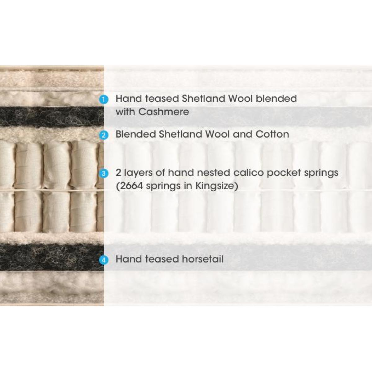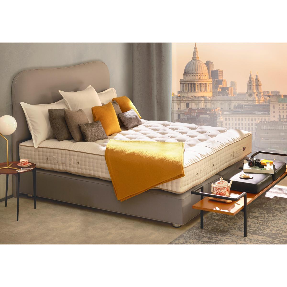 In this pocket sprung divan set with natural fillings, the Vispring Signatory mattress is paired with a beautifully upholstered divan base, in a choice of fine fabrics and colours. Why you’ll love it. This Vispring divan set has luxurious natural fillings. In a choice of comfort levels. Fillings include Austrian Moosburger® horsetail, cashmere and Shetland wool. Feel the support of Vispring’s famous vanadian springs. Hand-tied woollen tufts, 4 rows of hand side stitching. Protective wool and coir upholstered borders with air vents and handles. Drawer storage options are available. Divan base is upholstered in a choice of fine fabrics. What you need to know. Mattress type: Pocket spring. Mattress depth: 23cm + 6cm doming. Mattress firmness: Soft, Medium, Firm, Extra Firm. Split tension available in King and Super King size. Mattress springs: 2664 vanadium steel, 6 turn pocket springs in king size, in calico pockets. Mattress fillings: hand-opened Austrian Moosburger® horsetail, hand-teased real Shetland wool blended with cashmere and cotton. Mattress cover: finest quality ticking. Sizes: Super king, king, double, small double, single. Requires turning: Yes. Turn with the seasons for optimum performance. Base construction: Traditional sprung platform base. Solid timber frame, FSC certified. Base springs: 2010 hand nested pocket springs in 2 layers in king size. Base fillings: Horsehair, blended British fleece wool and cotton. Mattress care: Air for 4 hours before using to remove any odour. Allow at least 4 hours for springs to settle and for mattress to attain its full size. Indentations caused by settlement of fillings or body weight are normal and are not considered defects. If used on a slatted bed frame, slats must be no more than 7 cm apart. Rotate regularly.