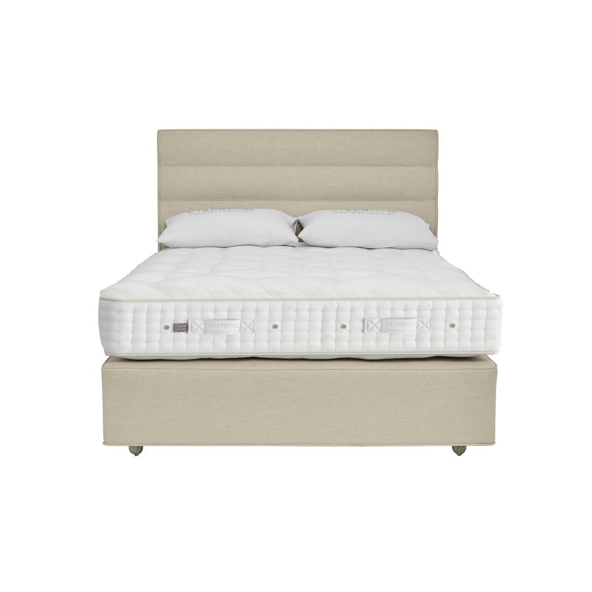 The Sublime Superb from Vispring is a luxuriously handcrafted divan bed like no other. The mattress pampers you with exclusive, all-natural fillings including horsetail, cotton, silk, mohair and Shetland wool. Within the mattress, two layers of Vispring’s famous 6 turn vanadium steel springs offer responsive support. The mattress rests on a solid timber sprung base in a wide choice of fine upholstery. Headboard is an optional extra. Handcrafted divan bed with a luxuriously filled Vispring mattress. All natural fillings include horsetail, cotton, silk, mohair and Shetland wool. With 2520 vanadium steel pocket springs in 2 layers (5 foot size). Soft ticking upholstery, hand tufted, 4 rows of hand side-stitching. Wool and coir upholstered borders with air vents and handles. Divan base with solid timber frame and 1344 hand-nested springs. Base fillings are coir, British fleece wool and cotton. The divan is upholstered in your choice of luxury fabrics. Did you know?. The mattress should be aired for four hours after delivery to freshen and remove any aroma from storage. It may take time for your mattress to attain its full size once the springs have settled to the correct position. This is due to the mattress being upright during transit. Settlement of fillings and indentations caused by body weight compressing the fillings are natural and not considered defects. This can be minimised by regular rotating (unless yours is a dual tension mattress). Product images are representative. Find out more.