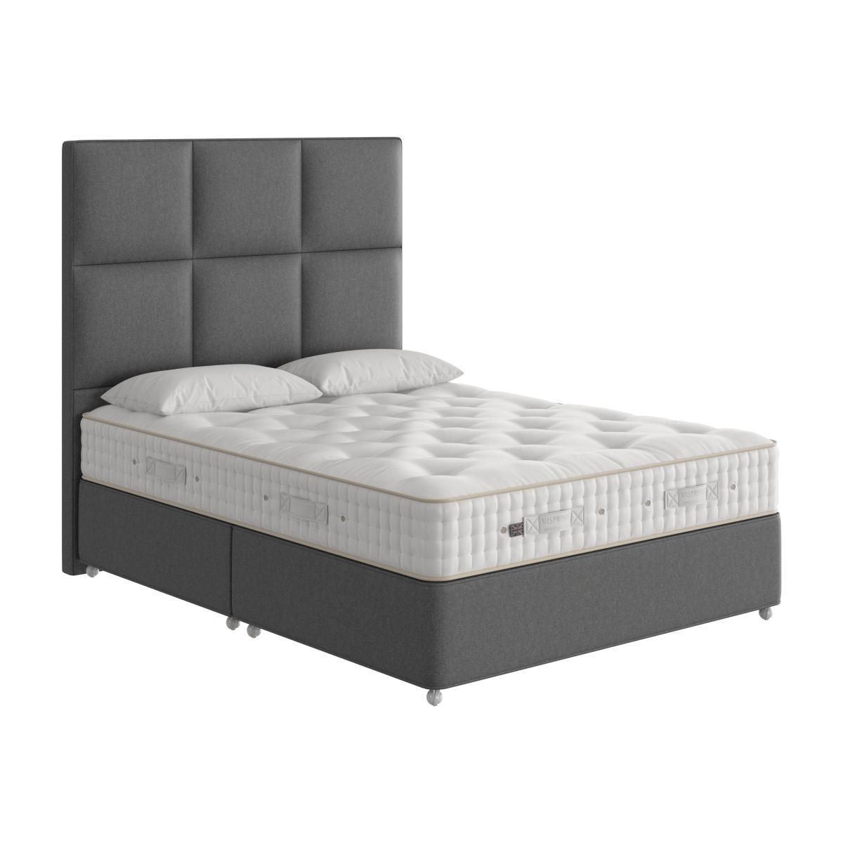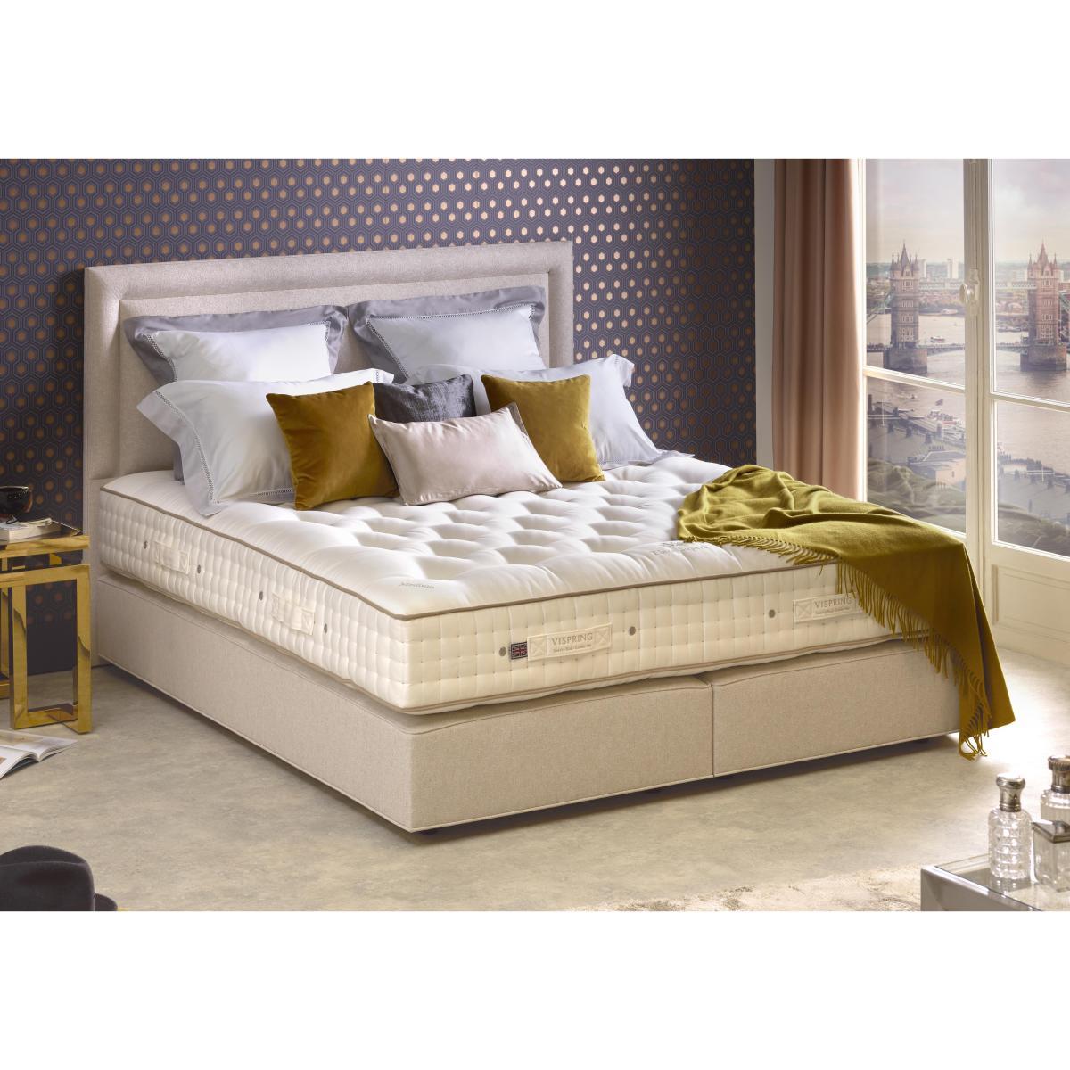 The Tiara Superb from Vispring is a divan bed that takes comfort to a whole new level. The mattress is luxuriously soft yet supportive, with fillings of horsetail, cotton and Shetland wool. Within the mattress, two layers of Vispring’s famous 6 turn vanadium steel springs offer responsive support. The mattress rests on a solid timber sprung base in your choice of fine upholstery. Headboard is an optional extra. The ultimate in luxury. There’s no other way to describe the Vispring Tiara Superb divan set. This handcrafted bed features a wonderfully responsive 23 cm mattress with a traditional, softly supportive feel. It’s superbly comfortable thanks to the combination of fillings, which include horsetail, cotton and Shetland wool, and the superior pocket spring construction. There are 2242 six-coil vanadium steel pocket springs in king size, hand-nested in calico and arranged in two layers for precise support. Covered in high-quality ticking, this mattress has hand-tied woollen tufts and three rows of hand side stitching. Upholstered borders have air vents and horizontal handles. The timber base has 1344 springs in king size, hand-nested in calico. It’s filled with coir and blended British fleece and cotton. Shown here in. Touch Rose- (2116. ) The Vispring Tiara Superb divan set is part of the British-made Vispring Tiara Superb collection. Product images are representative. Find out more. Please note. The mattress should be aired for four hours after delivery to freshen and remove any aroma from storage. It may take time for your mattress to attain its full size once the springs have settled to the correct position. This is due to the mattress being upright during transit. Settlement of fillings and indentations caused by body weight compressing the fillings are natural and not considered defects. This can be minimised by regular rotating (unless yours is a dual tension mattress).