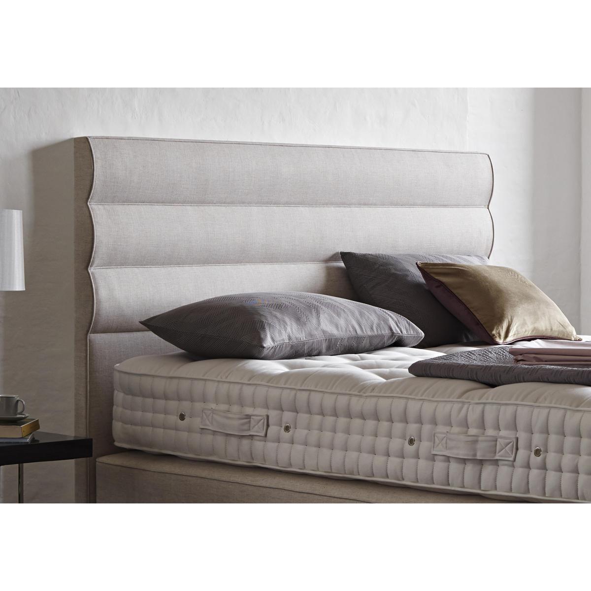 With its simple, horizontally fluted design, the Vispring Triton headboard suits the contemporary bedroom. It’s beautifully handcrafted by Vispring, to complement their collection of luxury beds, but will fit any standard sized divan. This attractive headboard is luxuriously cushioned and softly upholstered in a wide choice of gorgeous fabrics and colours. Contemporary, handcrafted headboard from Vispring. Simple fluting creates three horizontal cushioned panels. Upholstered in a choice of fabrics and on trend colours. 100% wool, faux suedes, velvet mixes, satins, canvas and linen weaves. Attaches with ease to any Vispring divan. Only available as a Euro style headboard, extending to the base of the divan. Colour displayed is. Gem Shell 2024.