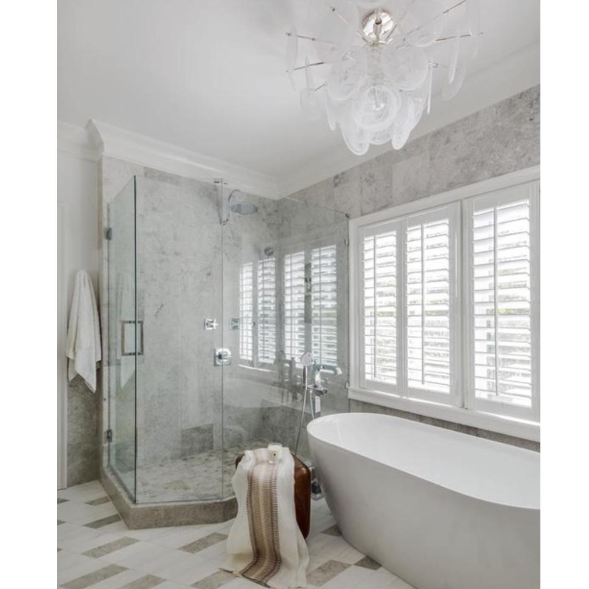 I love this chandelier for its bold yet versatile aesthetic. The polished nickel finish adds a contemporary edge, making it suitable for modern interiors, while the glass orbs introduce a playful texture that works well in eclectic or transitional spaces. It's particularly effective in dining rooms or high-ceilinged living areas where it can create a statement without overwhelming the room. Practical styling tips include balancing it with understated furniture to highlight its sculptural quality, and pairing with soft, warm lighting to complement the reflective surfaces. Keep the surrounding decor simple to let the chandelier be the focal point, and consider adjusting the height for optimal visual impact and functionality.