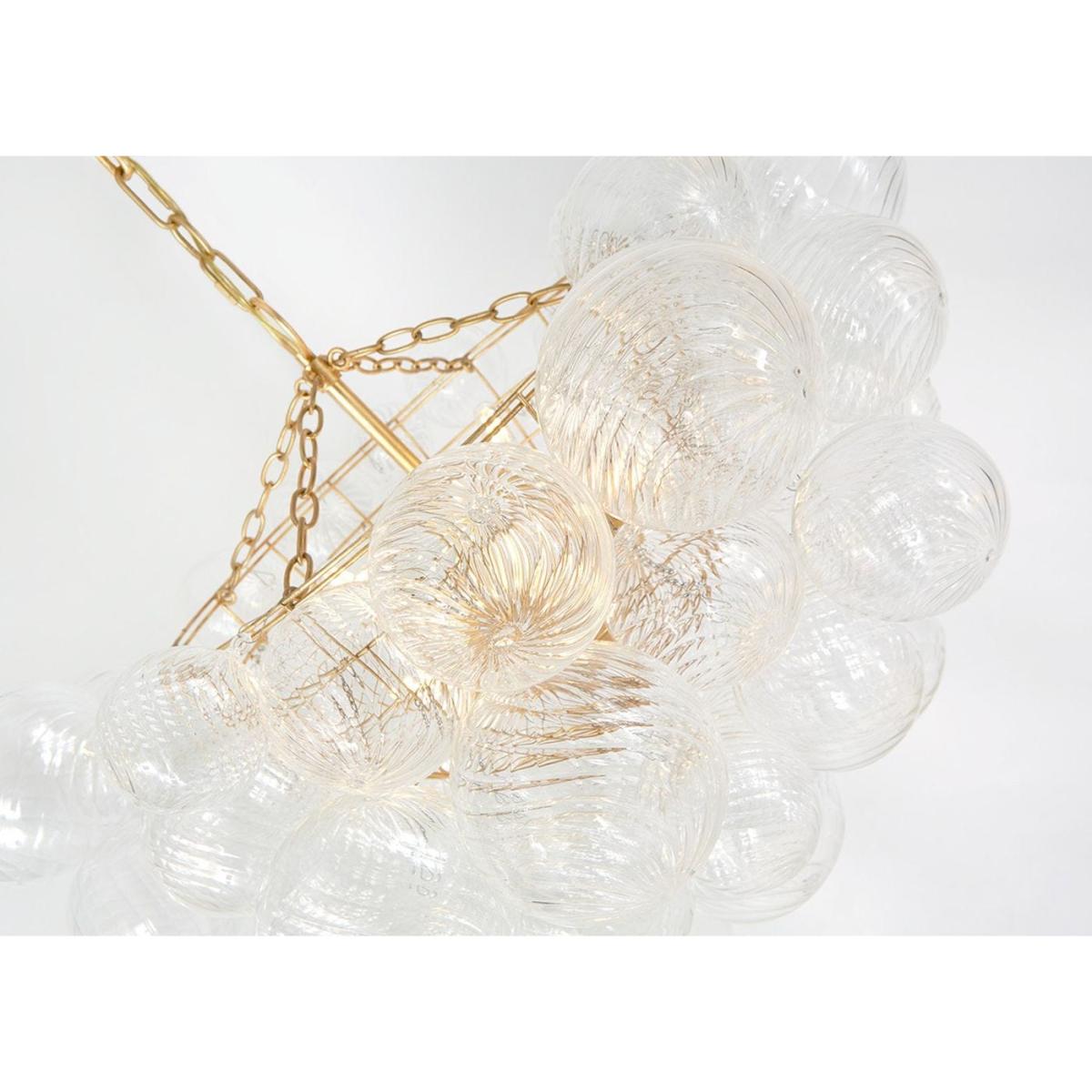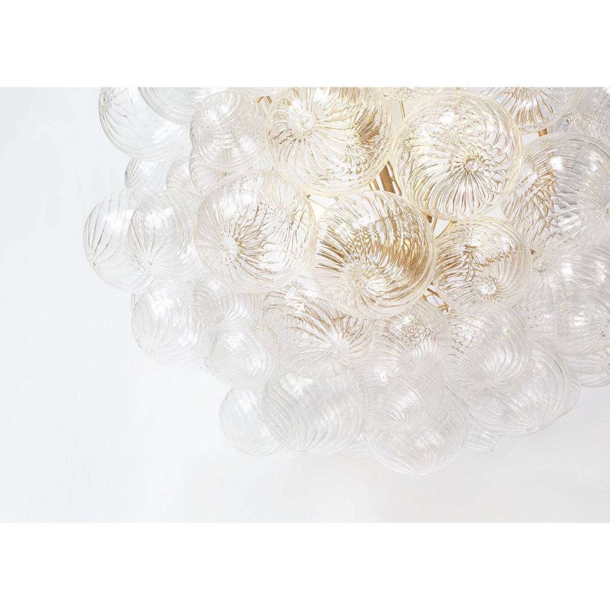 Artisanal glass elevates the Talia chandelier by Julie Neill for a new take on the simple glass globe light fixture. Light shimmers through multiple swirled glass orbs attached to metal baskets, creating a whimsical flourish. Talia adds a dynamic mix of sparkling glass, rounded forms, and bright metals to any interior. Choose a chandelier for entryways and dining areas, and add a playful, feminine touch to any space.