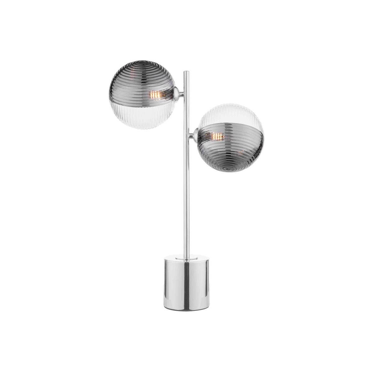 The combination of polished chrome finish and smoked and clear glass light shades in this table lamp is so creative. It’s the perfect lamp for a contemporary living space. Why you'll love it Distinctive modern design with an on-trend urban aesthetic. 2 oversized glass shades with contrast ribbing. Each shade is half clear glass and half smoked glass. Base has a polished chrome finish. This table lamp is part of the Furniture Village lighting collection. What you need to know Metal base. Glass shades. Inline rocker switch. Supplied with 150 cm of clear cable. Requires 2 x G9 max. 40 W bulbs (not included). Dimensions Height: 48 cm (19 in). Diameter: 32 cm (13 in). Shade dimensions Height: 15 cm (6 in). Diameter: 15 cm (6 in).