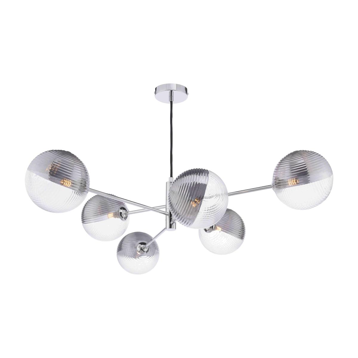 This stylish modern ceiling light fitting draws the eye and creates lovely ambient light thanks to the contrast between each shade’s clear and smoked glass, and linear and radial ribbing. Why you'll love it Distinctive modern design with an on-trend urban aesthetic. 6 oversized glass shades with contrast ribbing. Each shade is half clear glass and half smoked glass. Arms and ceiling plate have a polished chrome finish. Height adjustable. This pendant ceiling light is part of the Furniture Village lighting collection. What you need to know Metal with glass shades. Black braided cable. Height adjustable on installation 32cm min – 110cm max. Requires 6 x G9 max. 40 W bulbs (not included). Professional installation recommended. Dimensions Height: from 32 cm (13 in) to a maximum of 110 cm (43 in). Diameter: 125 cm (50 in). Shade dimensions Height: 15 cm (6 in). Diameter: 15 cm (6 in).