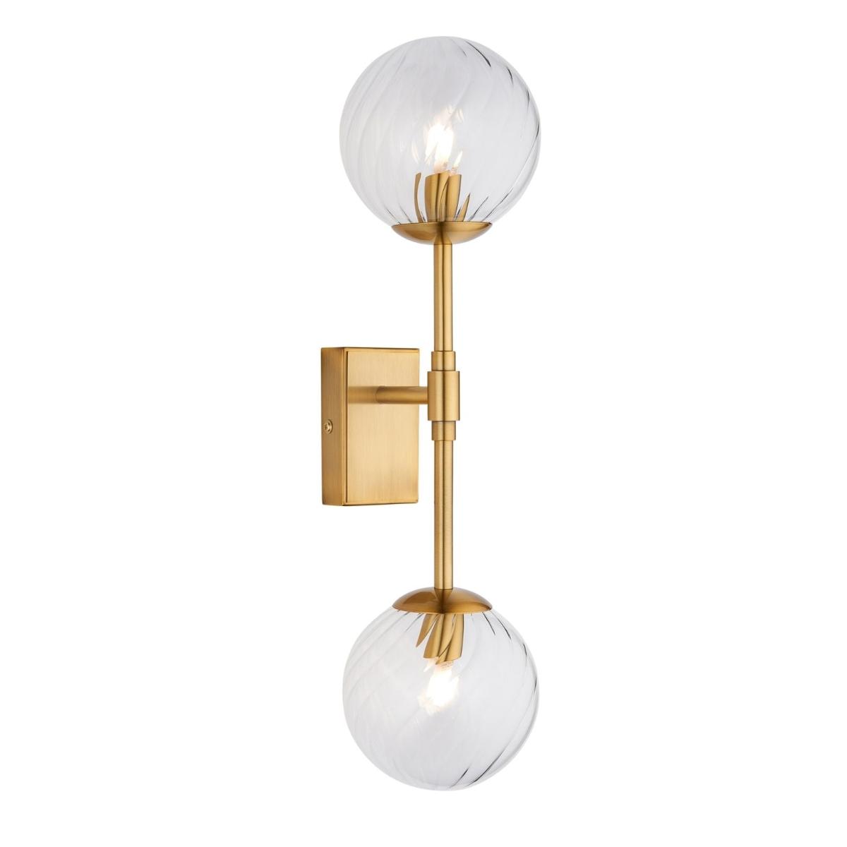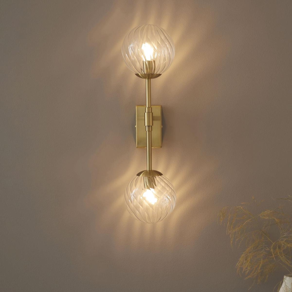 Vitali 2-light wall light, featuring brushed, aged brass-plated metalwork and spherical shades made from clear twisted-patterned glass. The Vitali 2-light wall light is a refined and elegant lighting solution, blending vintage charm with modern sophistication. Crafted with aged brass-plated metalwork, this fixture features a slender vertical stem that supports two spherical shades, each made from twisted-patterned glass. The intricate glass design softly diffuses light, casting a warm and inviting glow. Its sleek and minimalist silhouette makes it a versatile choice for a variety of spaces, whether used as a stylish bedside light, an accent piece in a hallway or to complement the Vitali pendant lights in a living or dining area. The vertical design adds a sense of height and structure, making it ideal for modern and classic interiors alike. Vitali 2-light wall light, featuring brushed, aged brass-plated metalwork and spherical shades made from clear twisted-patterned glass. The Vitali 2-light wall light is a refined and elegant lighting solution, blending vintage charm with modern sophistication. Crafted with aged brass-plated metalwork, this fixture features a slender vertical stem that supports two spherical shades, each made from twisted-patterned glass. The intricate glass design softly diffuses light, casting a warm and inviting glow. Its sleek and minimalist silhouette makes it a versatile choice for a variety of spaces, whether used as a stylish bedside light, an accent piece in a hallway or to complement the Vitali pendant lights in a living or dining area. The vertical design adds a sense of height and structure, making it ideal for modern and classic interiors alike.
