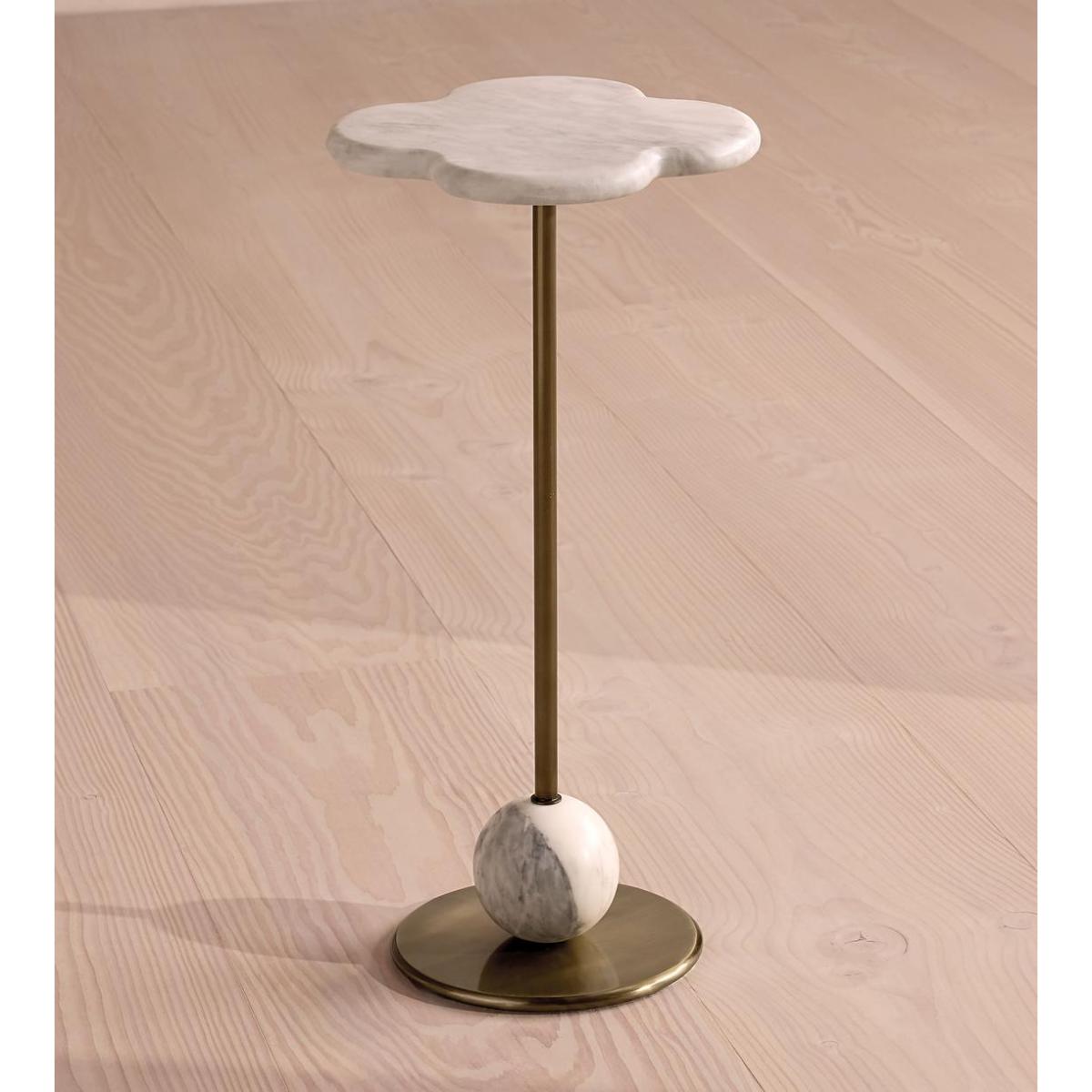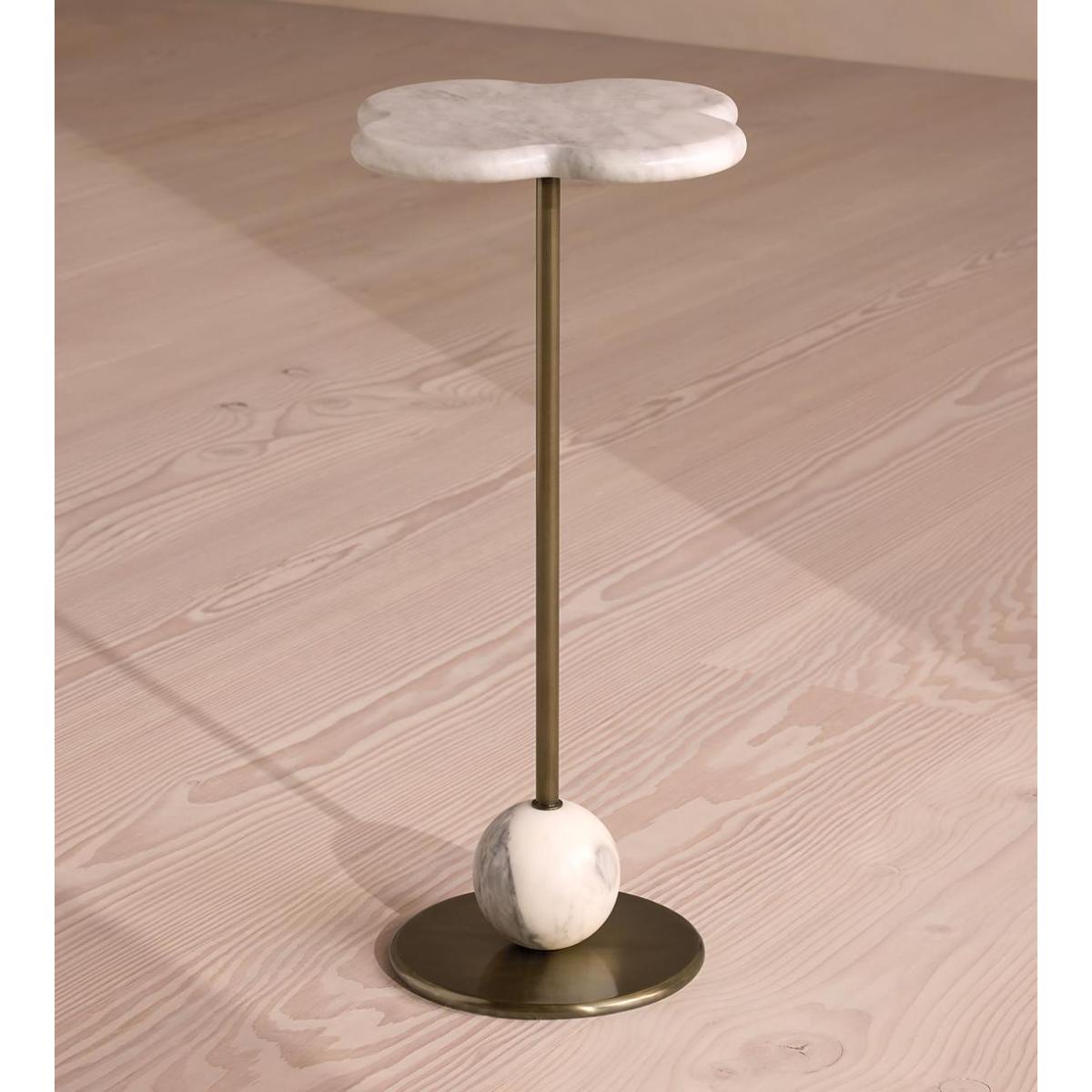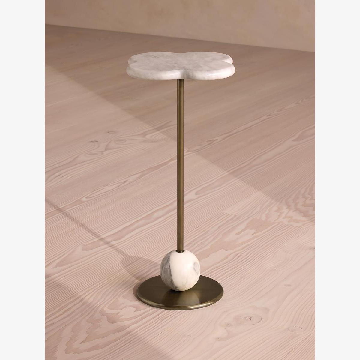 Solid Arabescato marble at the top and base creates a subtly architectural silhouette. Held up by a slender stem and circular base, solid Arabescato marble creates the unique, clover-shaped top of our Vito side table, as well as the complementary orb detailing at the base.