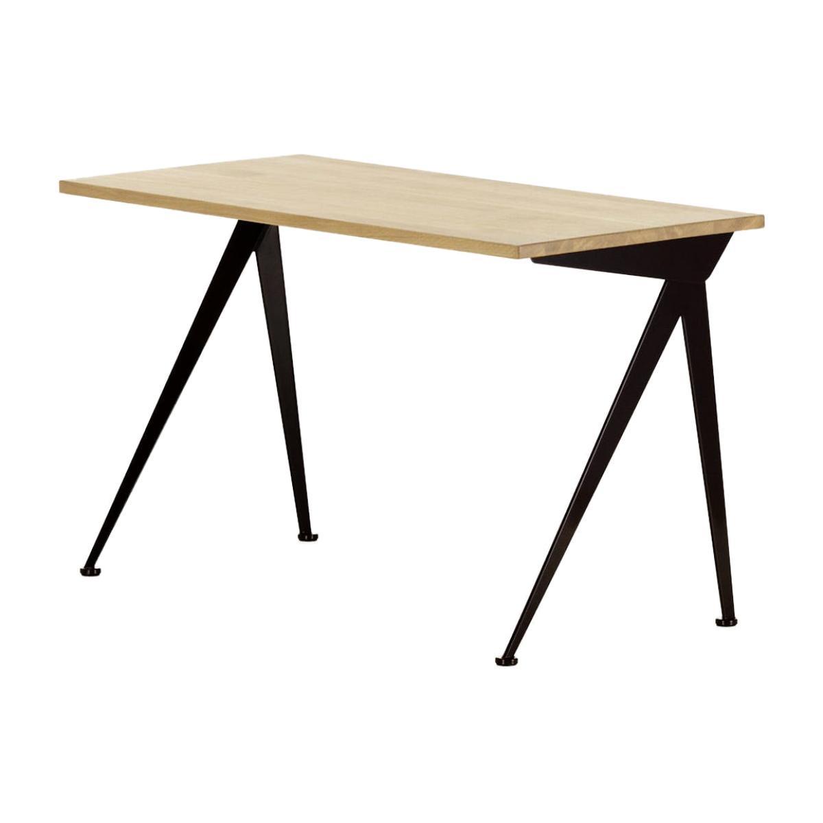 I usually just call this the compass desk. I love its clean lines and slim black steel legs, which make it a perfect fit for minimalist, Scandi or light-industrial interiors. The pale wood top brings warmth without overpowering a room, while the angular base gives a subtle architectural edge. For styling, keep the surface uncluttered: a slim LED desk lamp, a small plant in a ceramic pot and a tidy pencil cup are all you need. If you’re working from home, add a cable‐management tray underneath to preserve the desk’s crisp look. Pair it with a simple upholstered task chair and a floating shelf or two above, and you’ve got a workspace that feels calm, organised and contemporary.
