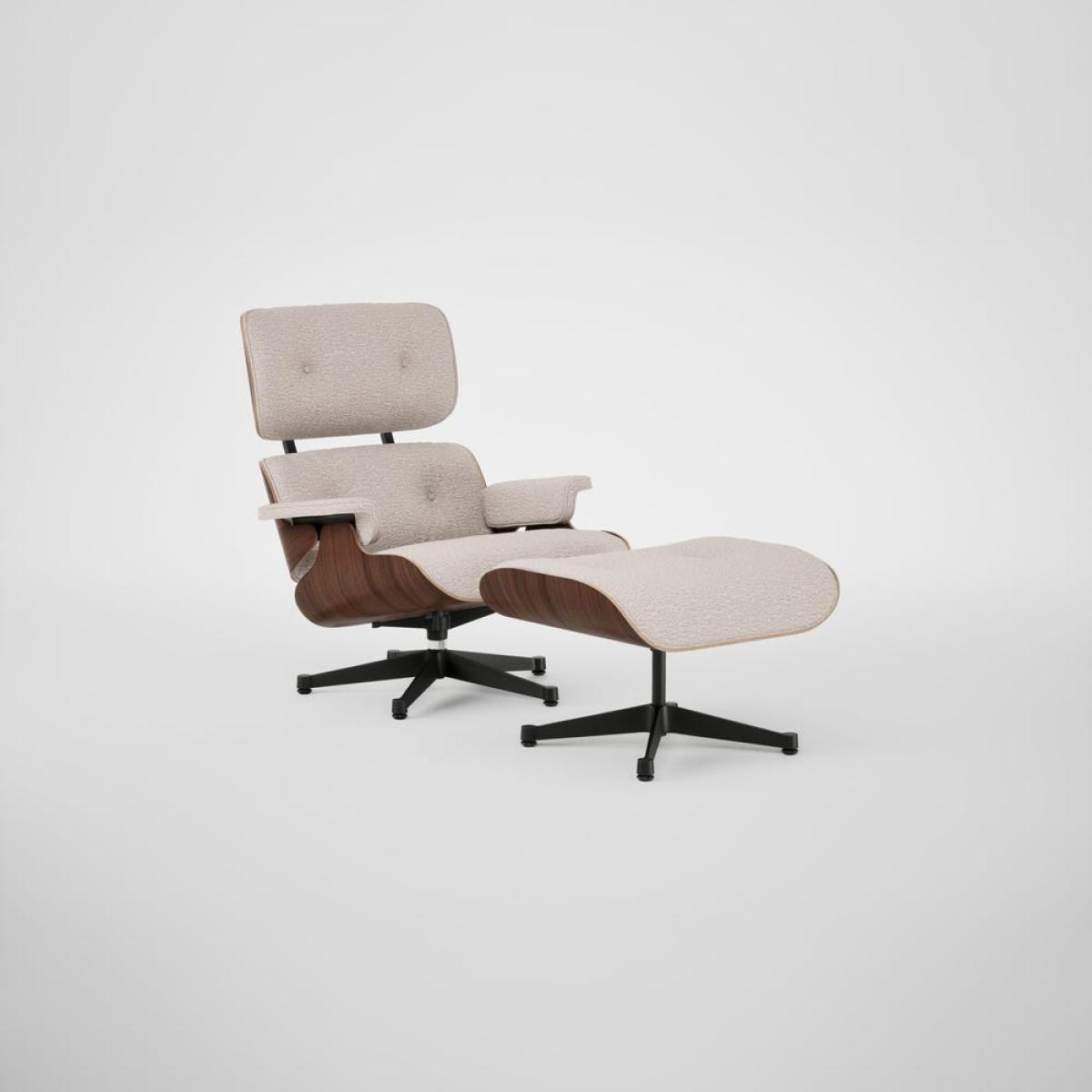 Vitra Eames Lounge Chair & Ottoman Walnut Dark New Dims Nubia 01 Ivory Pearl Black Base 05