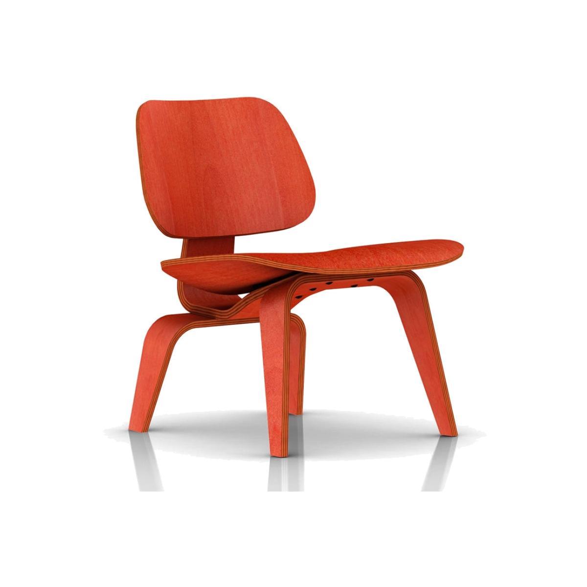 Moulded from multiple layers of thin plywood that is then steam pressed together, the organic shape of these durable back and seat shells has a light and flexible quality. Each piece is formed to the natural contours of the body with a gentle recline that provides an extremely comfortable sit. For the base, curving strips of plywood have been bent to simply screw together forming a support frame and legs that has plenty of give. Alongside models with no upholstery, the Eames's also designed versions with cowhide covers - the beautiful brown and white hide rests on a thin wedge of foam to provide additional padding and support.
