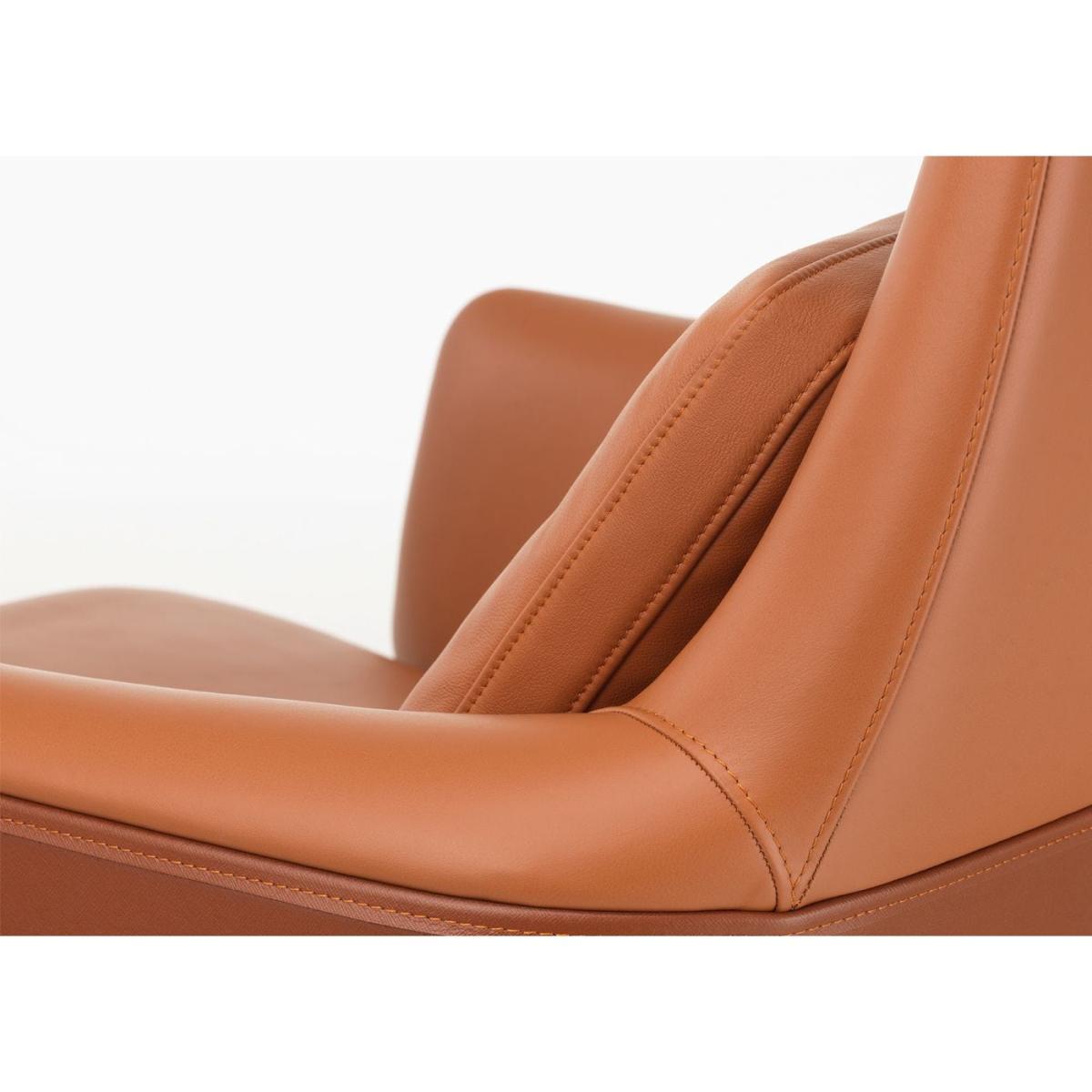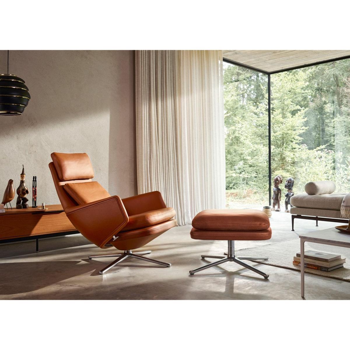 Grand Relax is a luxurious reclining lounge chair combining outstanding comfort with compact dimensions and a classic understated aesthetic. The exceptional seating experience offered by this chair stems from the harmonious interplay of diverse elements and its conception as a leather-upholstered furnishing. High-quality leather covers encase the soft seat and back cushions, to sink slowly into the cushions, while a concealed integrated mechanism absorbs the weight and moves the chair into a reclined position. The matching ottoman can be used as a footrest or additional seating option.