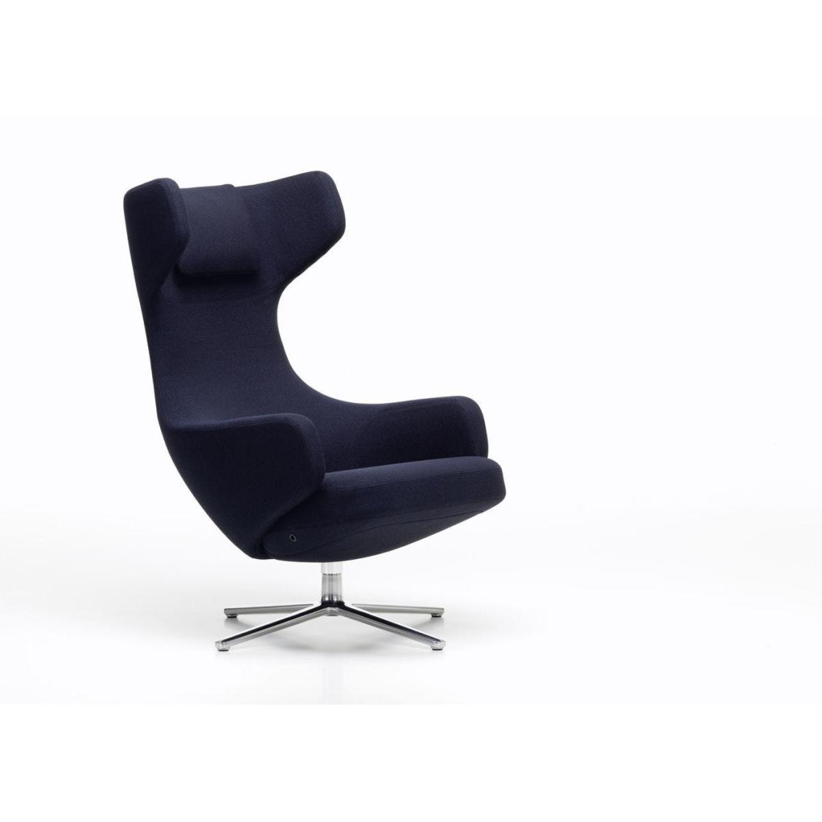 Jointly developed by Vitra and Antonio Citterio, the lounge chairs Grand Repos introduce a new level of comfort and flexibility to the home environment: with their generous padding, inviting armrests and high backrest, these elegant swivel-based lounge chairs impart an image of supreme comfort. Thanks to the synchronised mechanism concealed beneath the upholstery, sitters can move from an upright posture to a reclined angle for resting and lock the backrest in any position. The resistance of the backrest can be manually adjusted to the user's weight. This ensures great comfort and optimal spinal support across the entire range of movement.