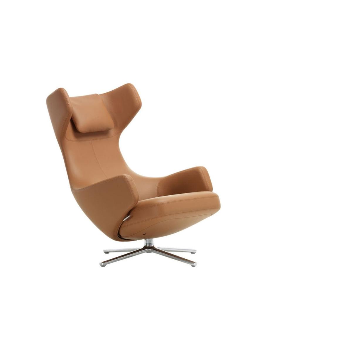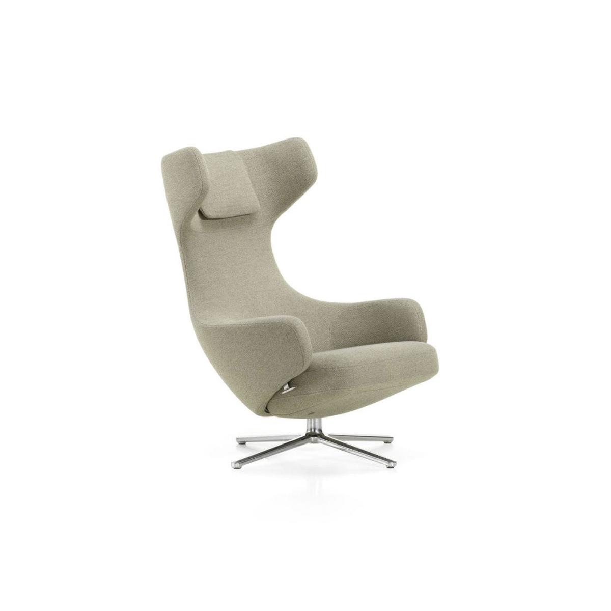 Jointly developed by Vitra and Antonio Citterio, the lounge chairs Grand Repos introduce a new level of comfort and flexibility to the home environment: with their generous padding, inviting armrests and high backrest, these elegant swivel-based lounge chairs impart an image of supreme comfort. Thanks to the synchronised mechanism concealed beneath the upholstery, sitters can move from an upright posture to a reclined angle for resting and lock the backrest in any position. The resistance of the backrest can be manually adjusted to the user's weight. This ensures great comfort and optimal spinal support across the entire range of movement.