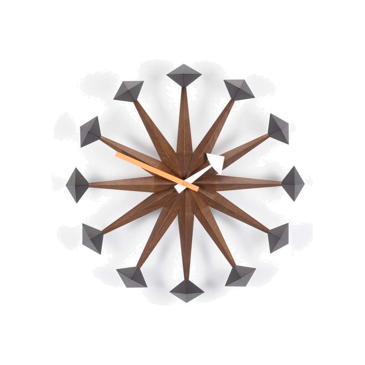 Polygon Clock by George Nelson. Determined to bring modern design into everyday American homes, George Nelson's clock range embodies the joie de vivre of the mid-century period. Despite being designed in the 1950s, the sharp silhouette of the Polygon Wall Clock remains a refreshing alternative to run-of-the-mill timekeepers carving geometric forms from dark stained wood.