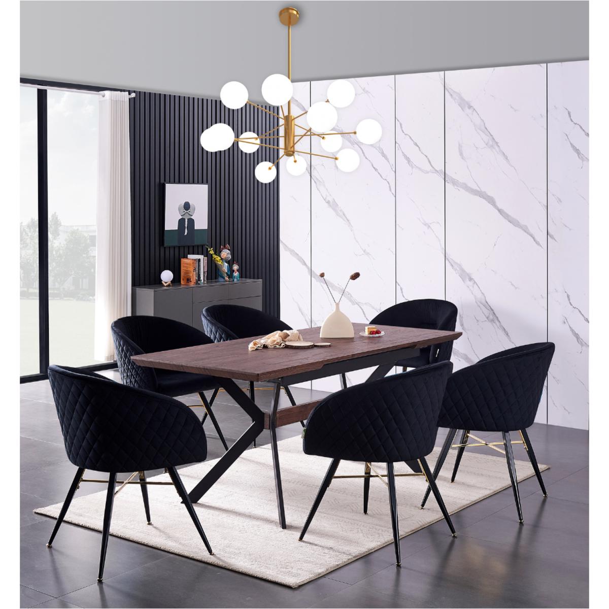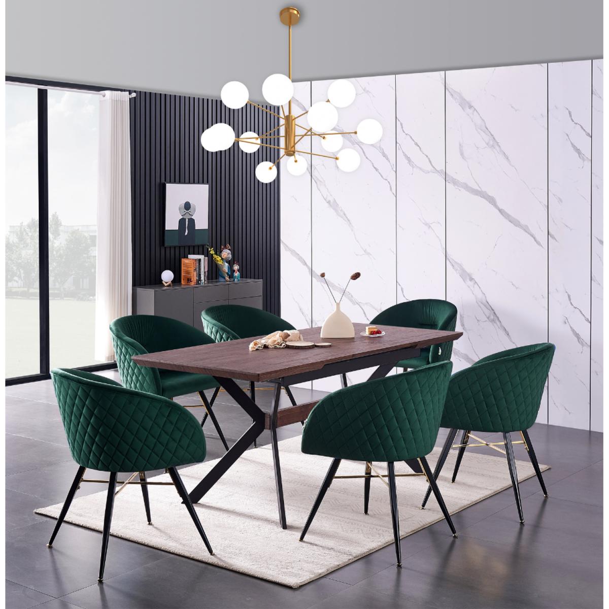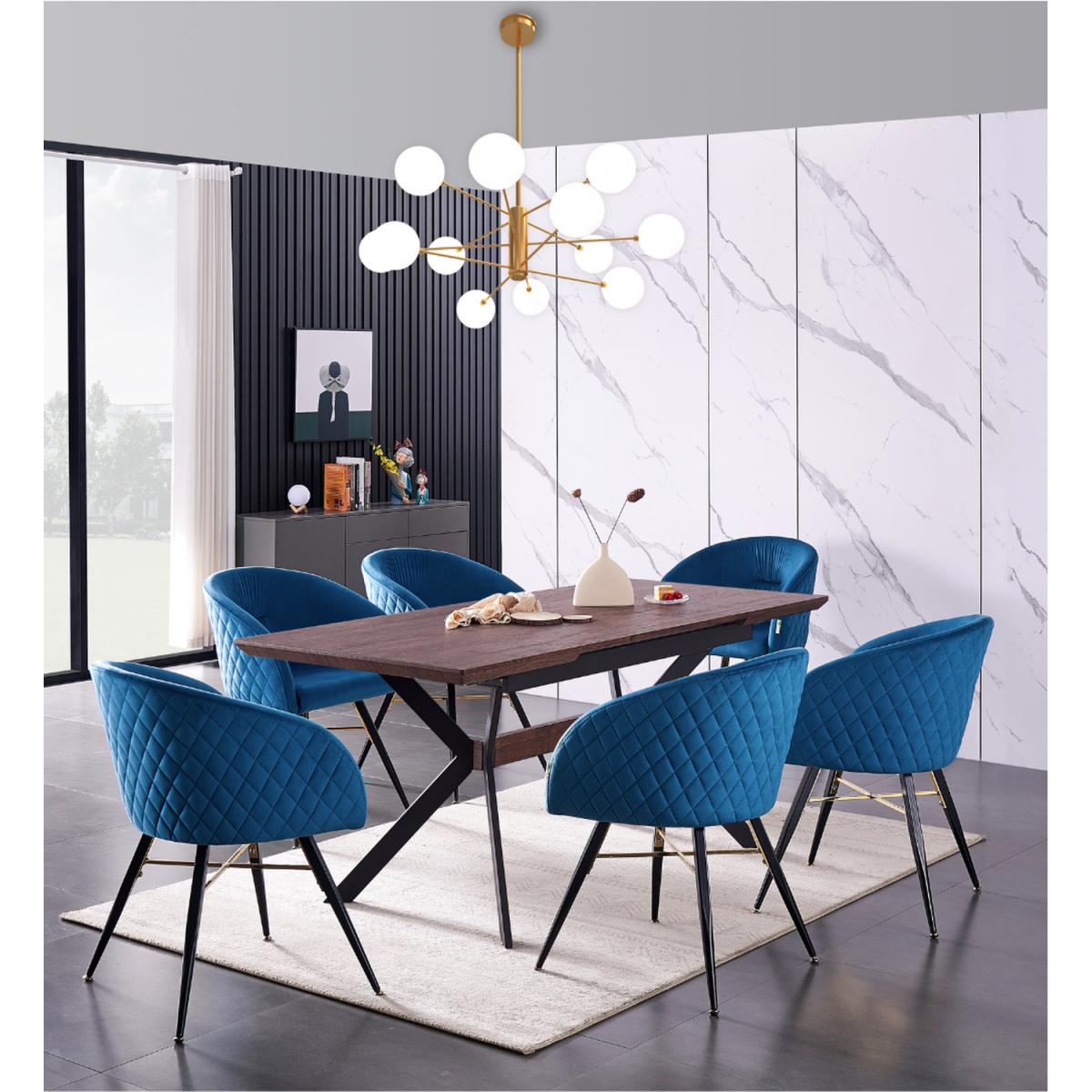 We are introducing the Vittorio Blaze dining set of 6 that includes a Blaze Rectangle Dining Table, which features an evergreen aesthetic and functionality of iconic mid-century modern furniture. Simply pull the table ends apart and an extra leaf pops into place allowing you to seat six with ease. The base is the sculptural cross-shaped design of legs in powder-coated MDF. The chic and innovative table to pass the test of time and help you live better. Comes with the Vittorio chairs that are the epitome of style and sophistication as well as offering superior comfort, perfect for making that LUX statement in any space. The dinette chairs are velvet upholstered, curved back, and are supported by four metal legs that provide enduring strength and sturdiness. The chair legs are equipped with floor protector end caps to shield your floor from scratching, in the meantime make these upholstered chairs anti-slip, and anti-noise and enhance their stability.