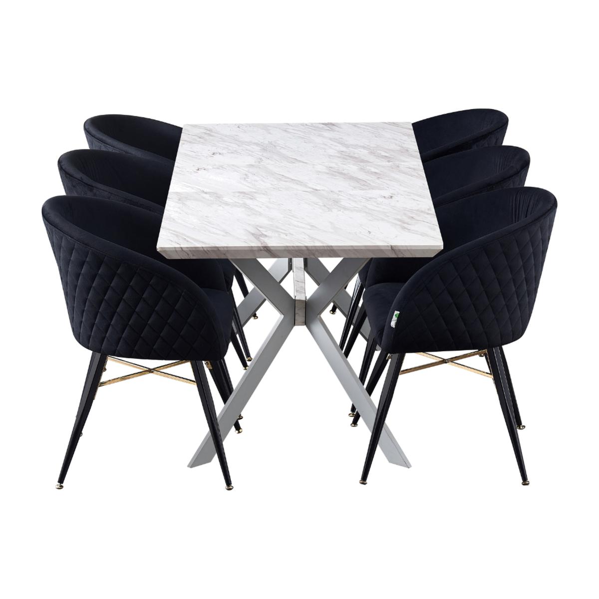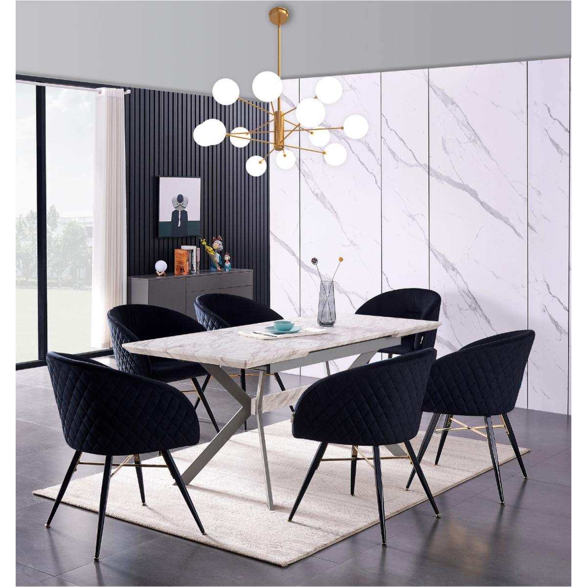 We are introducing the Vittorio Blaze dining set of 6 that includes a Blaze Rectangle Dining Table, which features an evergreen aesthetic and functionality of iconic mid-century modern furniture. Simply pull the table ends apart and an extra leaf pops into place allowing you to seat six with ease. The base is the sculptural cross-shaped design of legs in powder-coated MDF. The chic and innovative table to pass the test of time and help you live better. Comes with the Vittorio chairs that are the epitome of style and sophistication as well as offering superior comfort, perfect for making that LUX statement in any space. The dinette chairs are velvet upholstered, curved back, and are supported by four metal legs that provide enduring strength and sturdiness. The chair legs are equipped with floor protector end caps to shield your floor from scratching, in the meantime make these upholstered chairs anti-slip, and anti-noise and enhance their stability.
