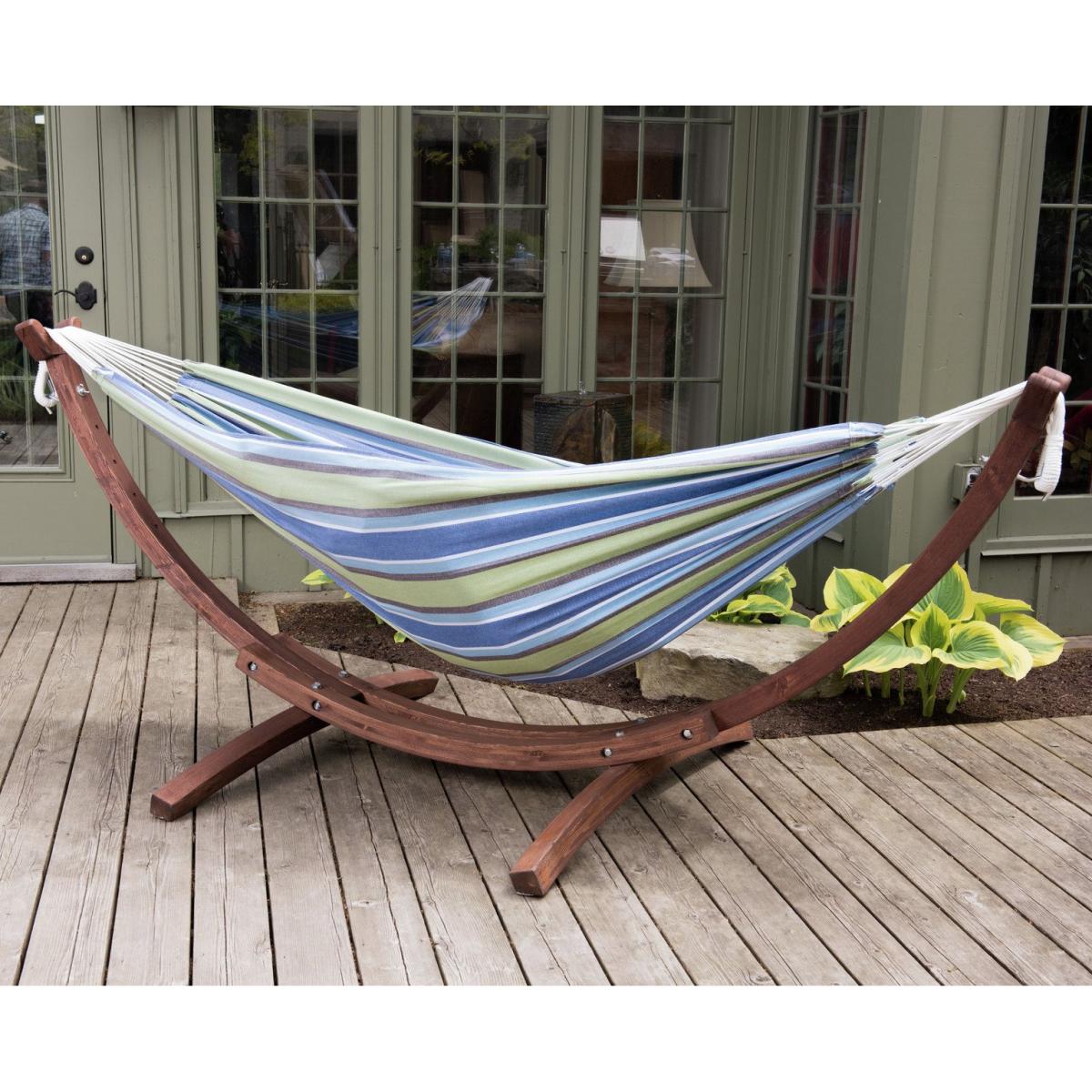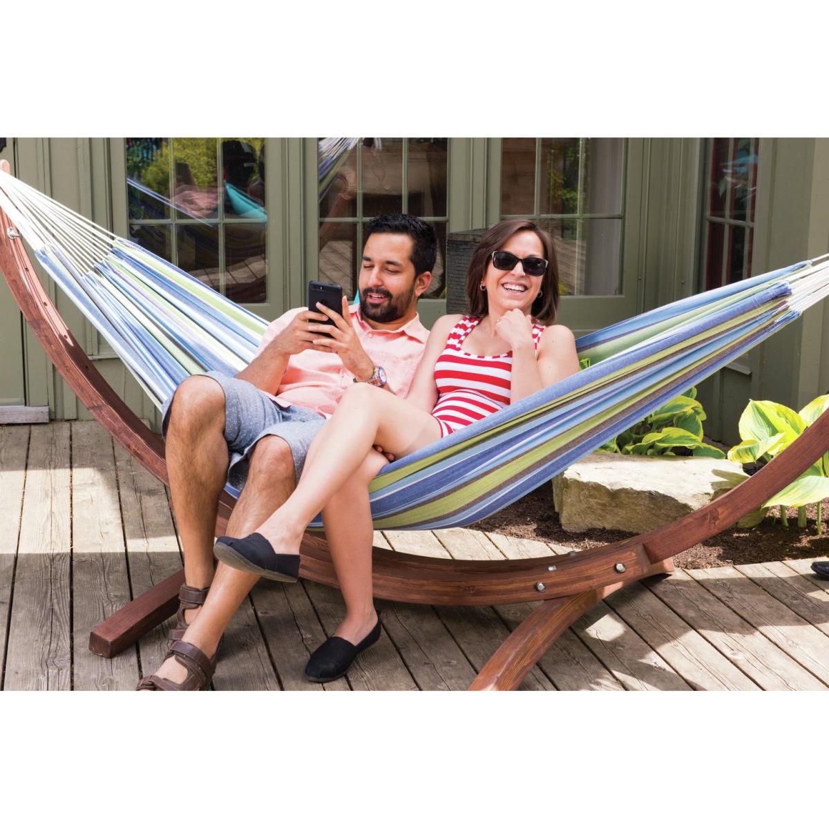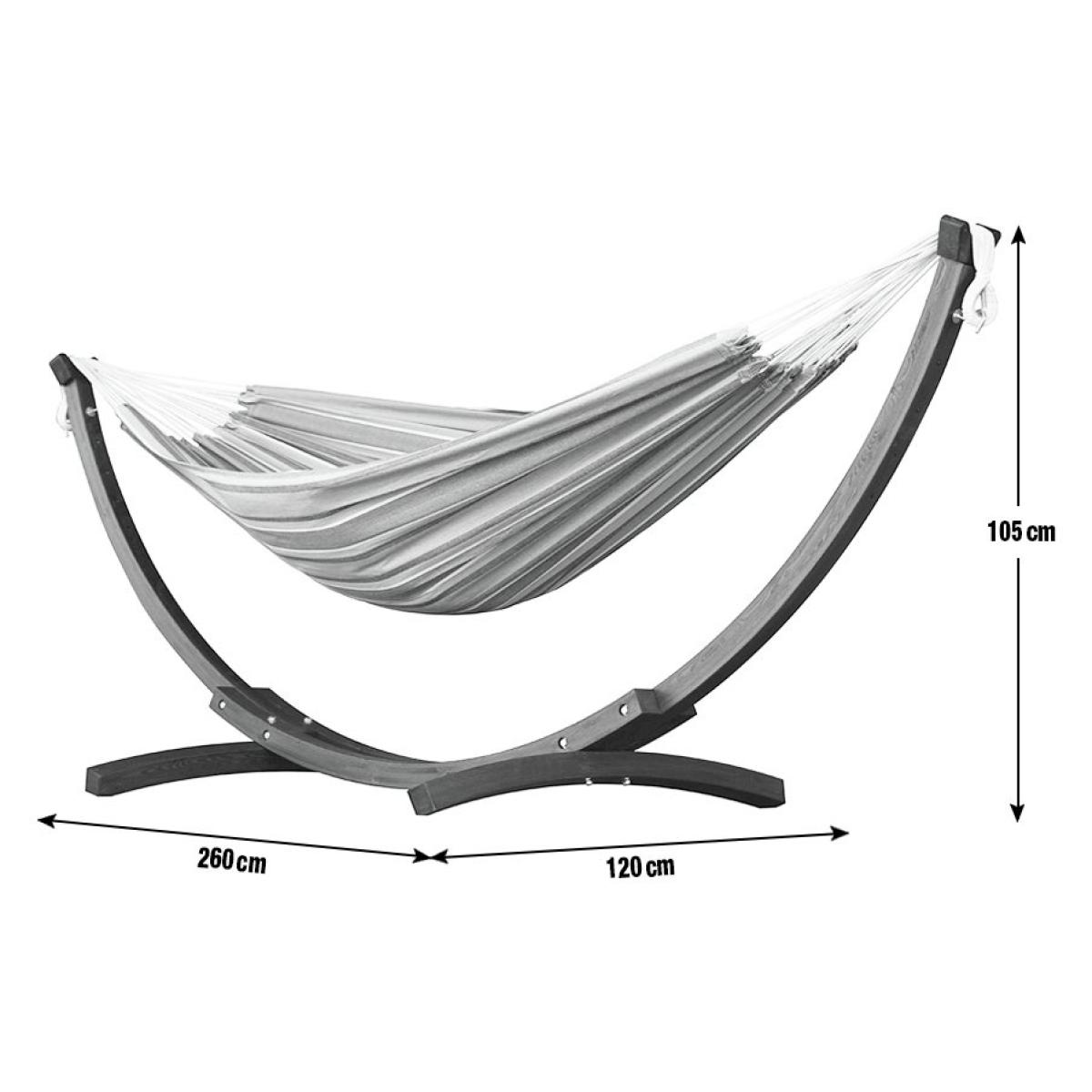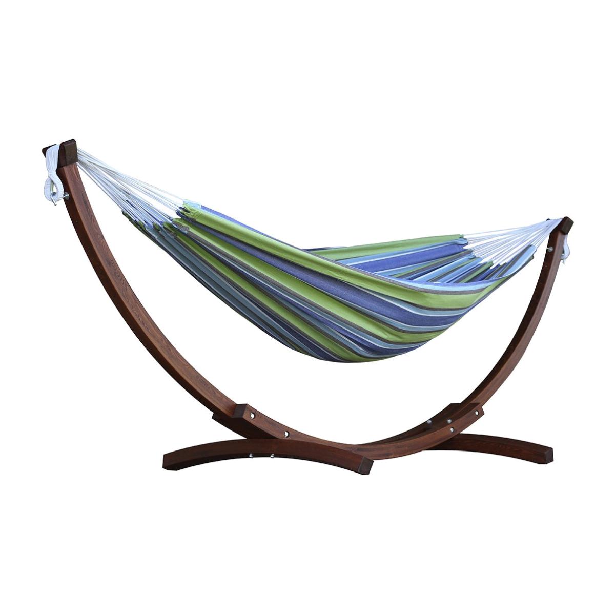 The eye-catching solid wood frames sets this double cotton hammock with solid pine stand apart from the crowd. It is a natural choice for a rugged design aesthetic and compliments an immaculate manicured space. The solid pine stand provides durability, and the densely woven double cotton hammock comes in the spectacular Vivere colours. Made from wood. Fabric made from cotton. Cushions not included. Dimensions: Size H105, W260, D120cm. Weight 20kg. Maximum user weight: 200kg. Package Dimensions: Package 1 dimensions: H14, W34, D129cm. Package 1 weight:22.5kg. General information: Self-assembly. Store hammock inside when not in use. Cover or store inside in winter months to prolong life of the product. Manufacturer's 1 year guarantee.