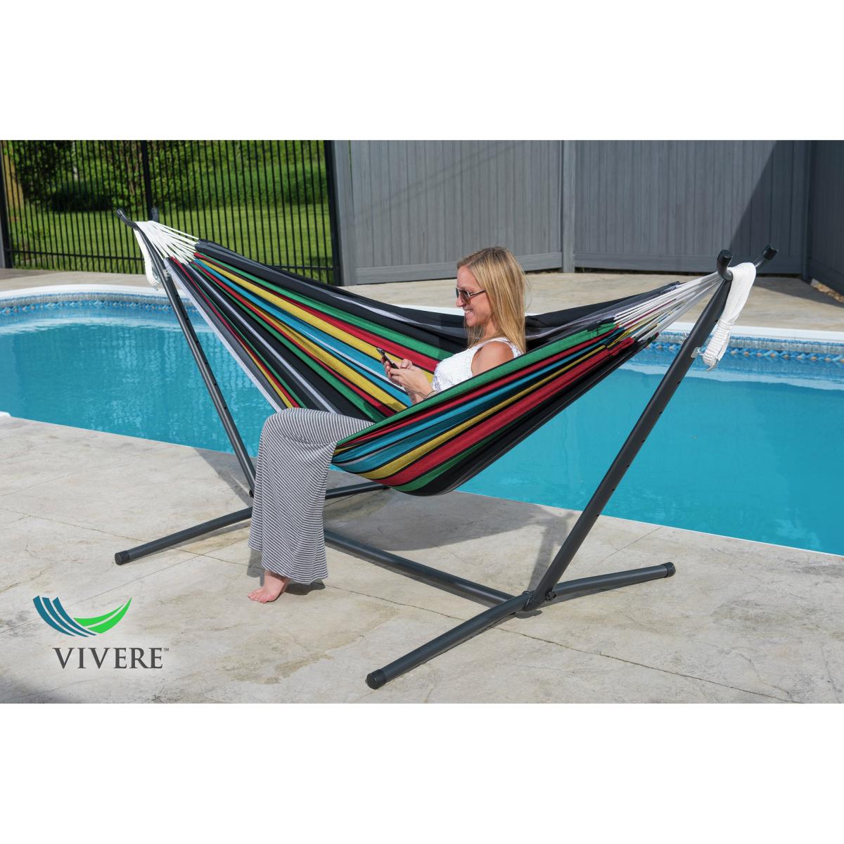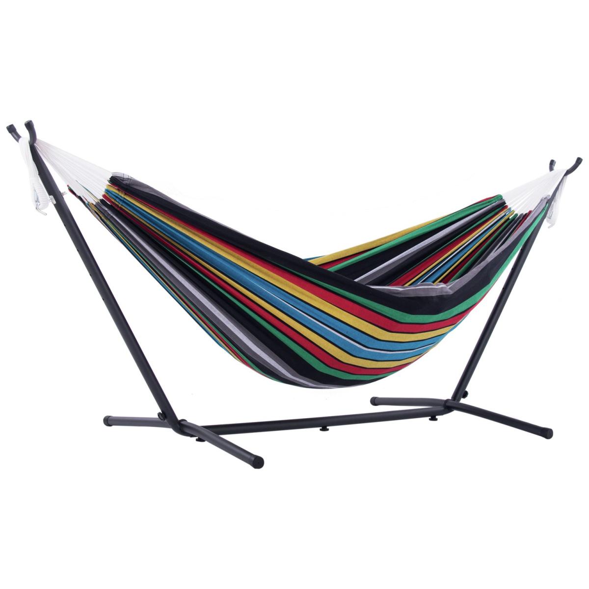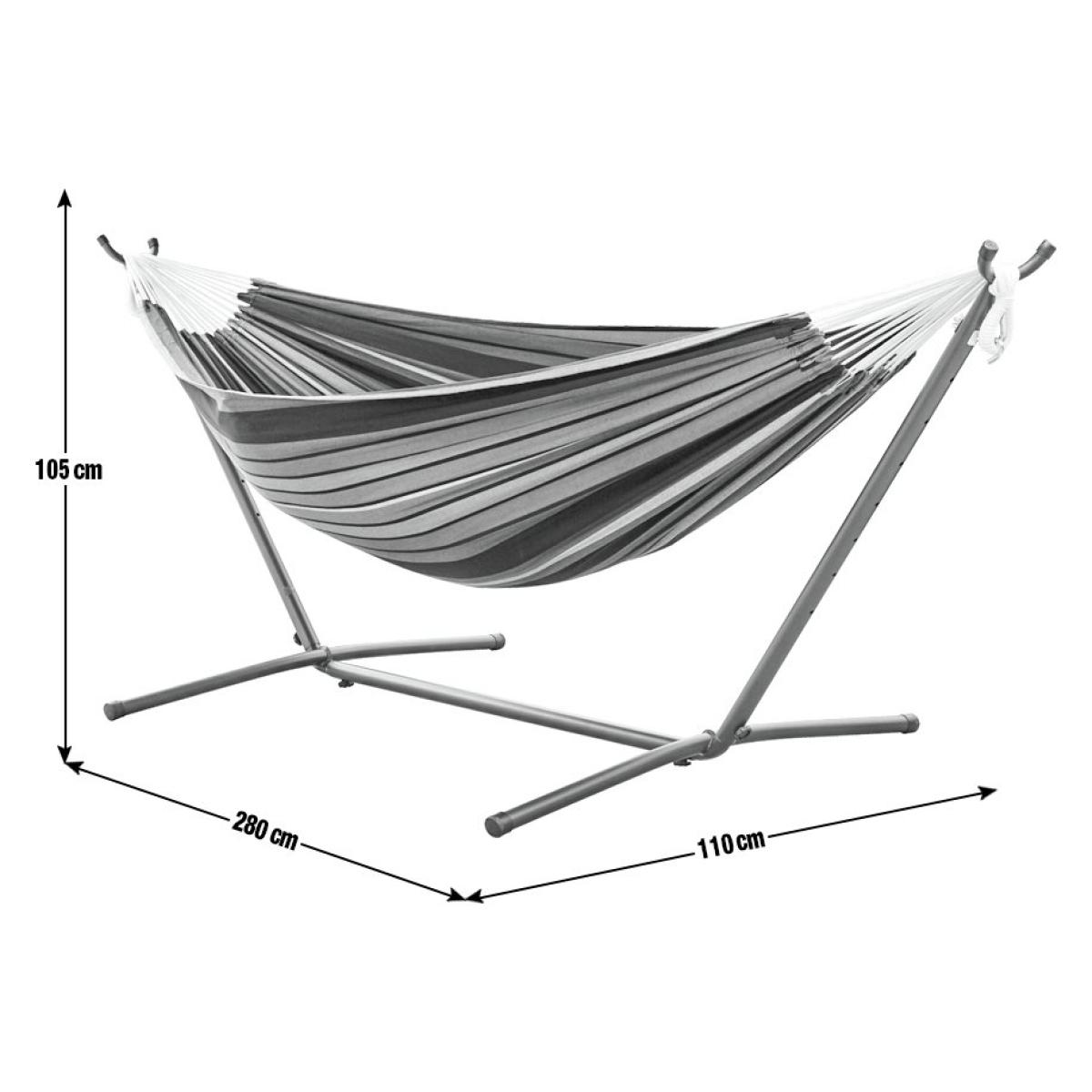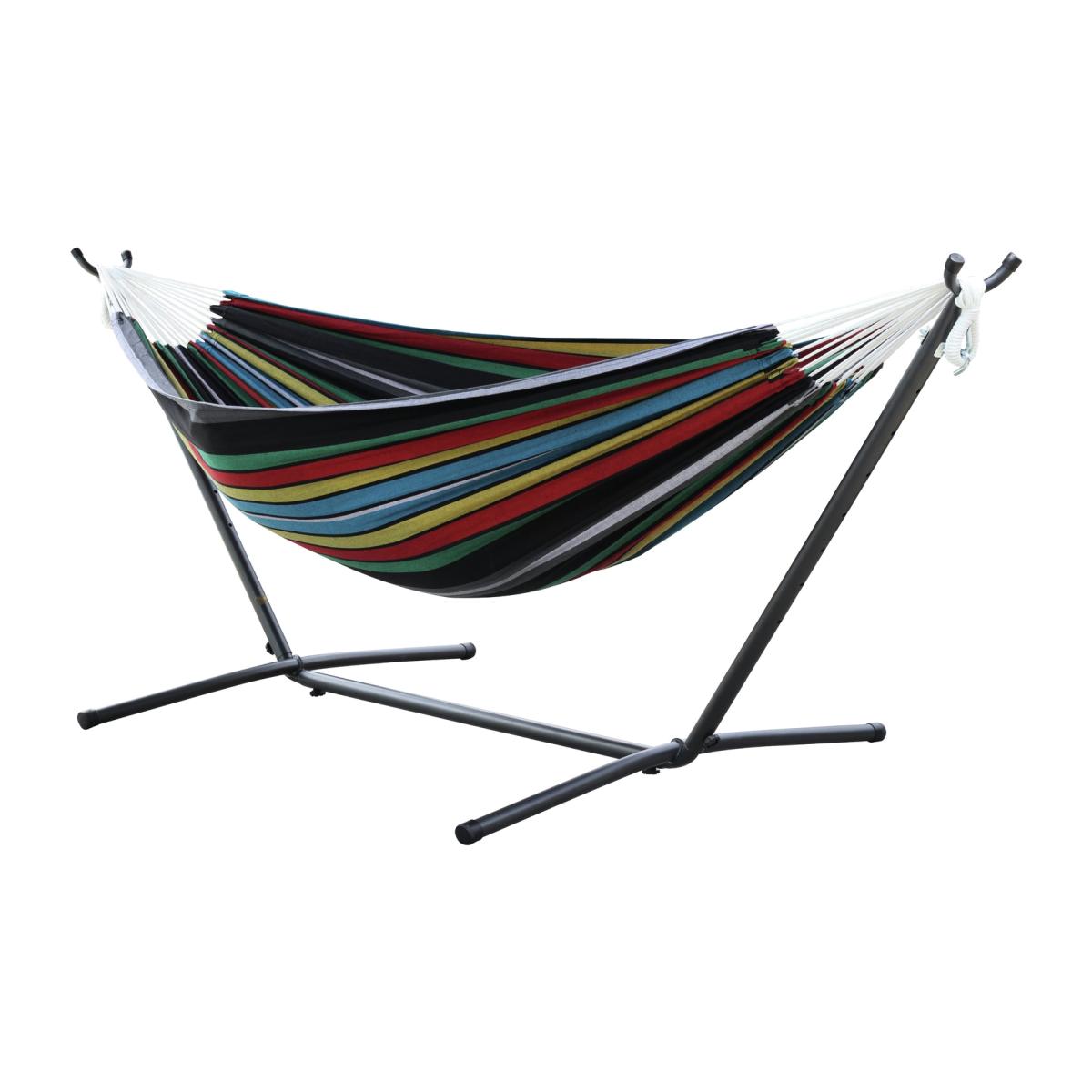 Hammock is 100% cotton, tightly woven and richly coloured. Space-saving 8-foot stand is constructed of heavy duty steel and assembles in minutes without any tools. Carrying case is included. Hammock bed is 83 x 59 inches, with a total length of 120 inches; accommodates two adults. Vivere double hammock with space-saving stand the vivere hammock combo comes with a space-saving steel stand and a double hammock in cotton fabric. Made from powder coated steel. Fabric made from cotton. Cushions not included. Dimensions: Size H105, W280, D110cm. Weight 12kg. Maximum user weight: 200kg. Package Dimensions: Package 1 dimensions: H18, W23, D120cm. Package 1 weight:14kg. General information: Self-assembly. Store hammock inside when not in use. Frame easily dismantles for storage. Cover or store inside in winter months to prolong life of the product. Manufacturer's 1 year guarantee.