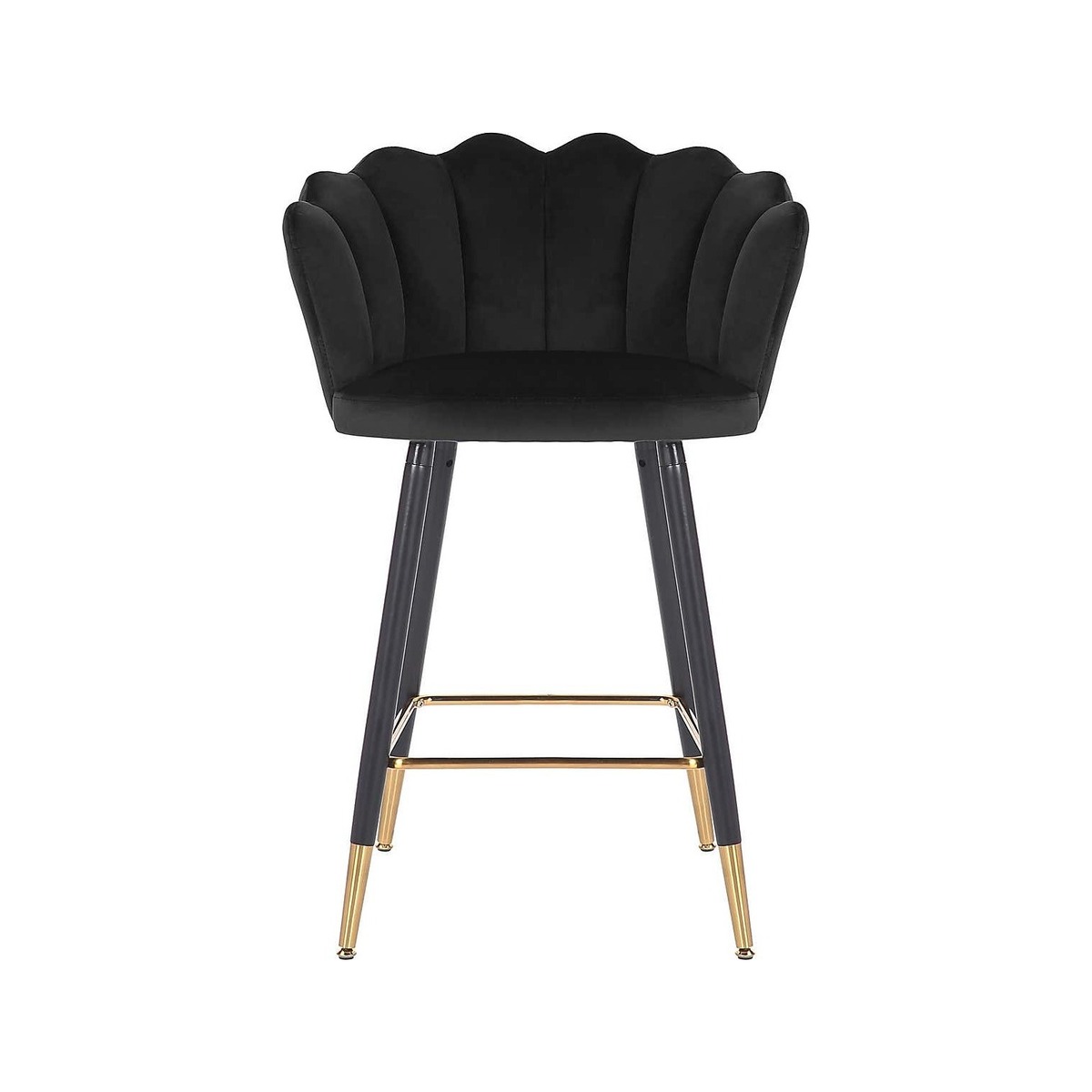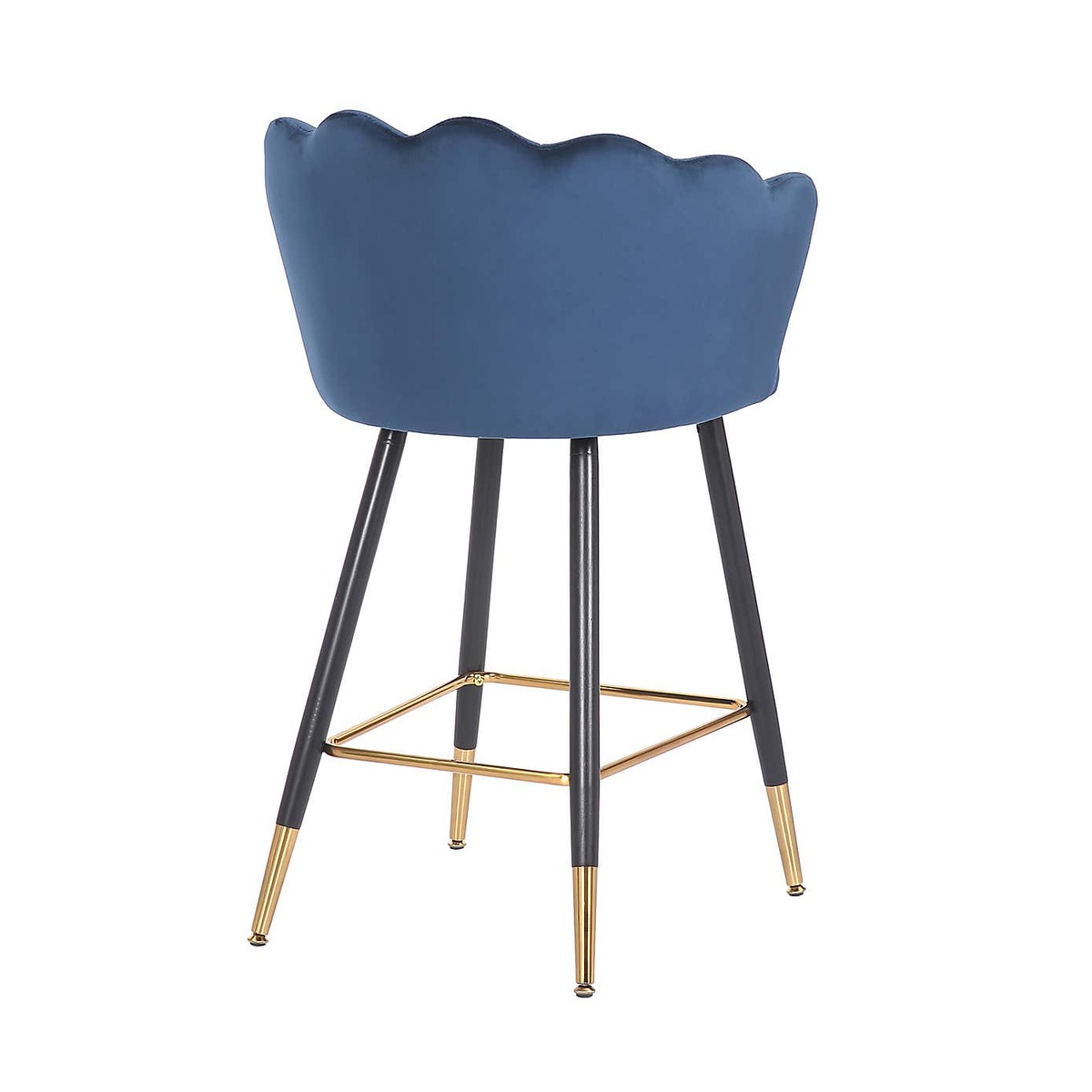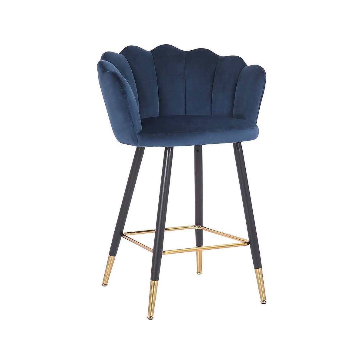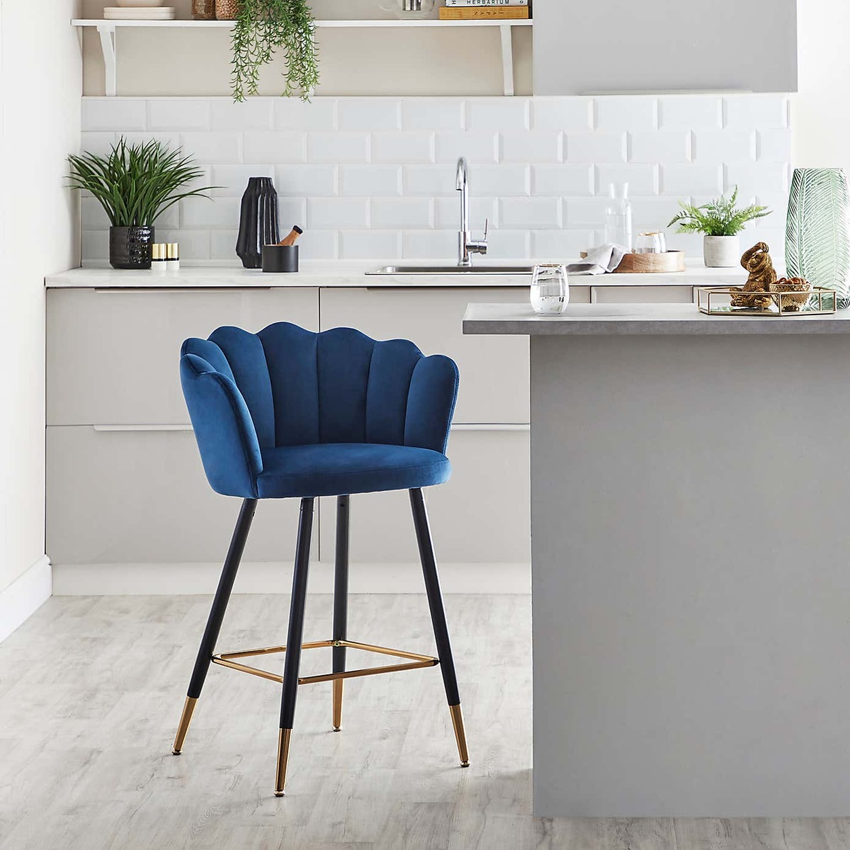 I love this velvet bar stool for its chic and sophisticated look, making it an excellent choice for both modern and vintage-inspired interiors. The dark navy colour adds a touch of elegance, while the scalloped shell shape of the backrest introduces a soft, inviting feel. It works particularly well in eclectic kitchens, stylish home bars, or creative cafe spaces where a bold statement piece is desired. For styling tips, pair it with sleek marble or wooden surfaces to highlight its plush fabric and metallic accents. A practical approach is to keep the surrounding decor minimal to let the stool stand out, and consider mixing it with other textures-like brass or matte black hardware-to create visual interest.