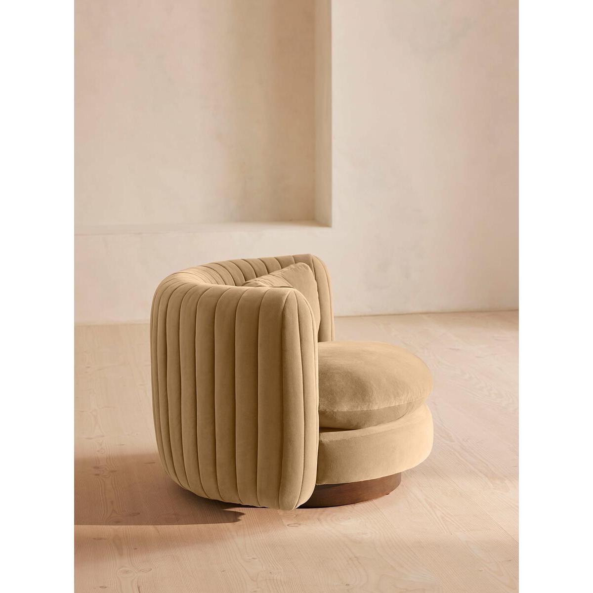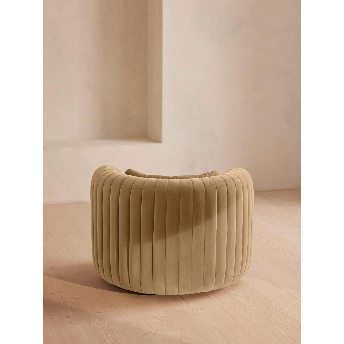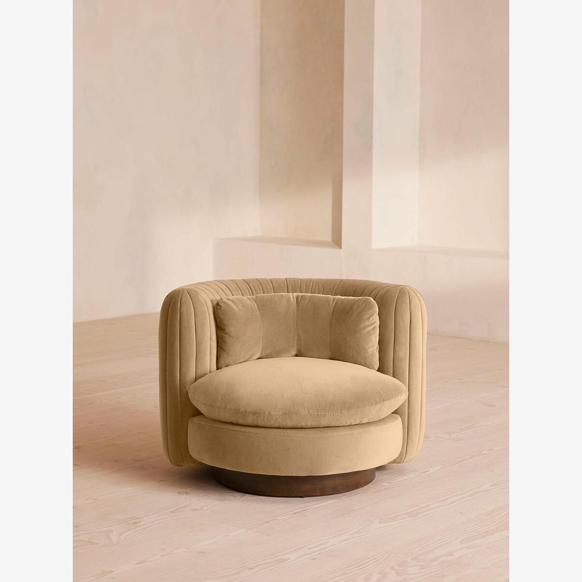 An extension of our Vivienne range, this swivel armchair takes its inspiration from the 1960s-inspired interiors of White City House. Upholstered in a cotton velvet fabric, pleated stitch detailing to the back of the chair makes it a versatile piece to sit in any area of the living room while adding a tactile point of interest. The oversized curved shape is an elevated take on the classic tub armchair, created for cozy, conversational moments in mind. Swivel armchair An extension of the Vivienne range Curved silhouette Upholstered in velvet Pleated stitch detailing Birch swivel base Inspired by White City House