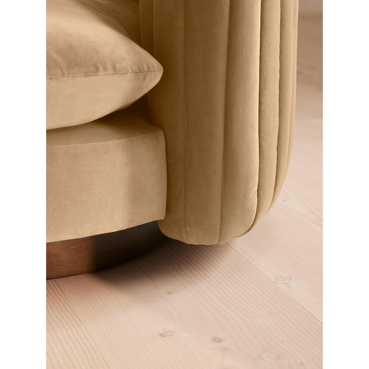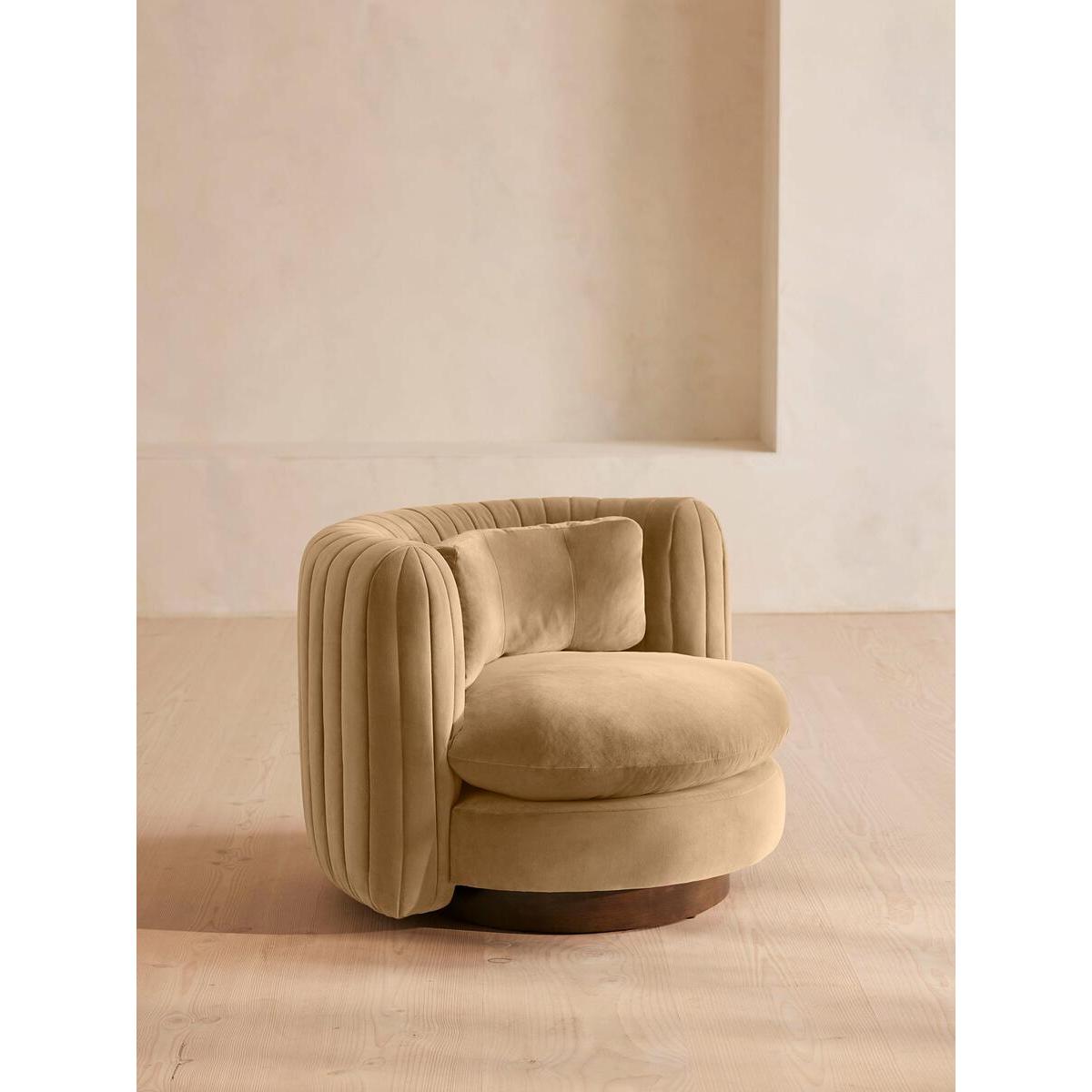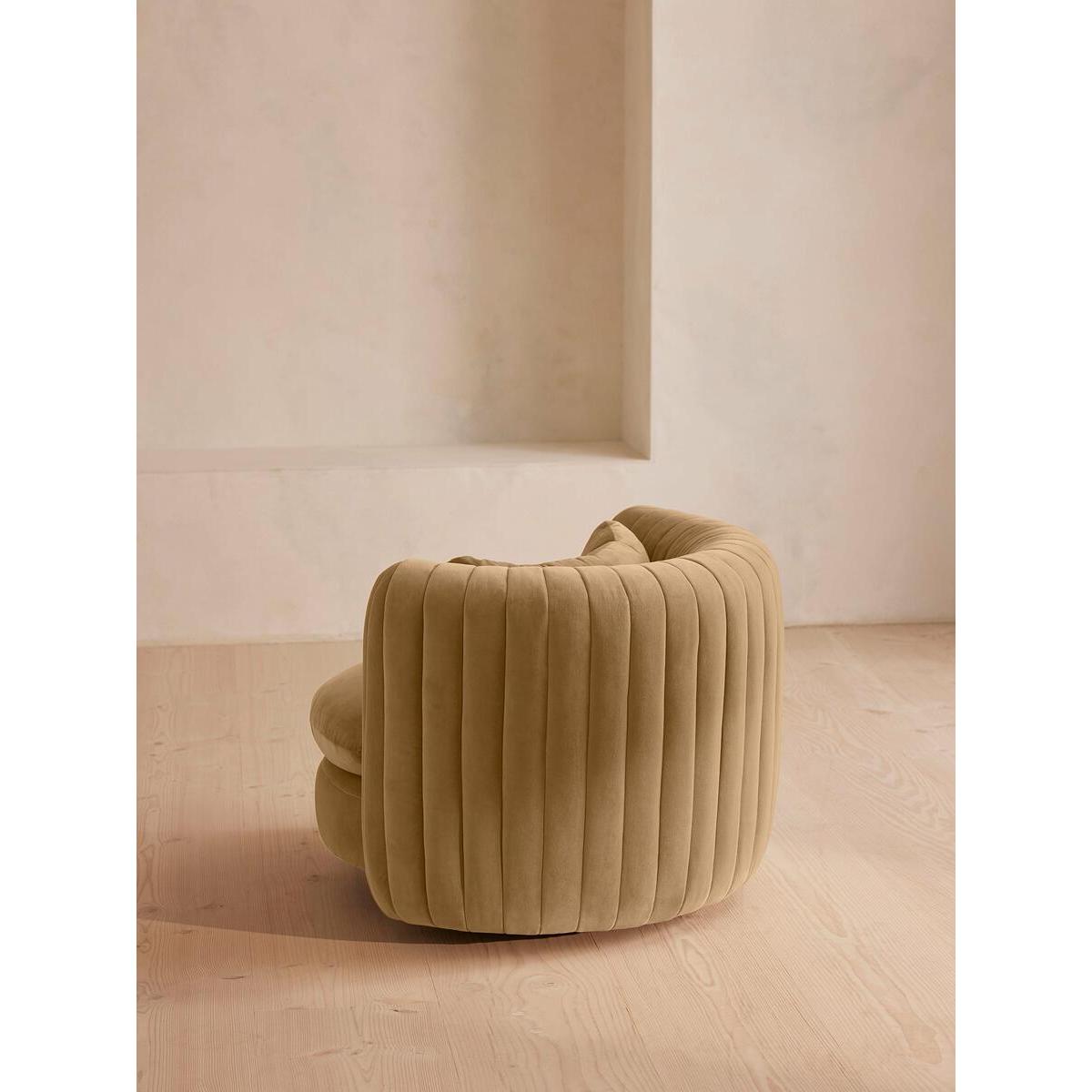 An extension of our Vivienne range, this swivel armchair takes its inspiration from the 1960s-inspired interiors of White City House. Upholstered in a cotton velvet fabric, pleated stitch detailing to the back of the chair makes it a versatile piece to sit in any area of the living room while adding a tactile point of interest. The oversized curved shape is an elevated take on the classic tub armchair, created for cozy, conversational moments in mind. Swivel armchair An extension of the Vivienne range Curved silhouette Upholstered in velvet Pleated stitch detailing Birch swivel base Inspired by White City House