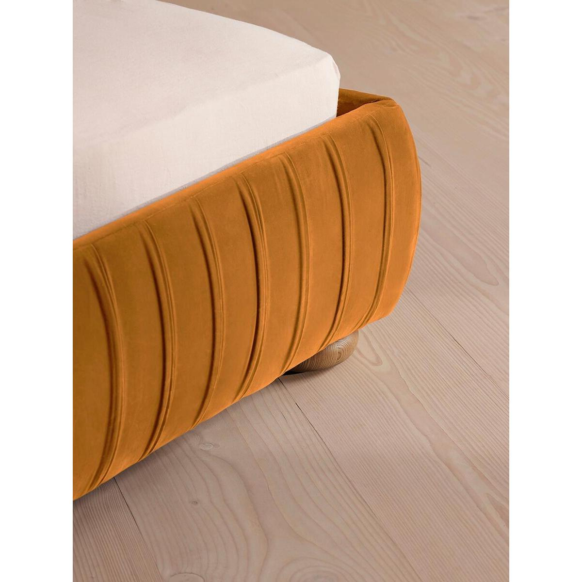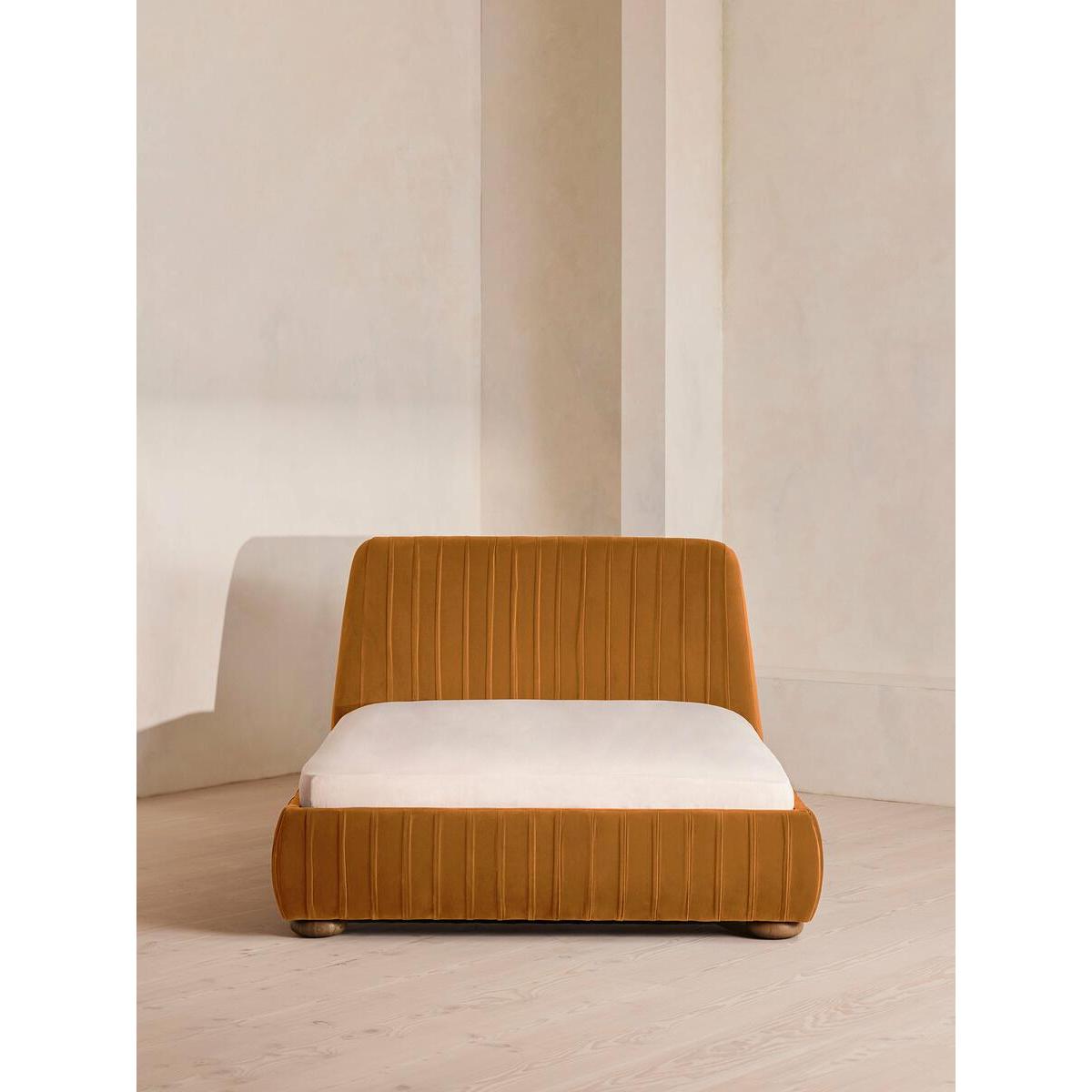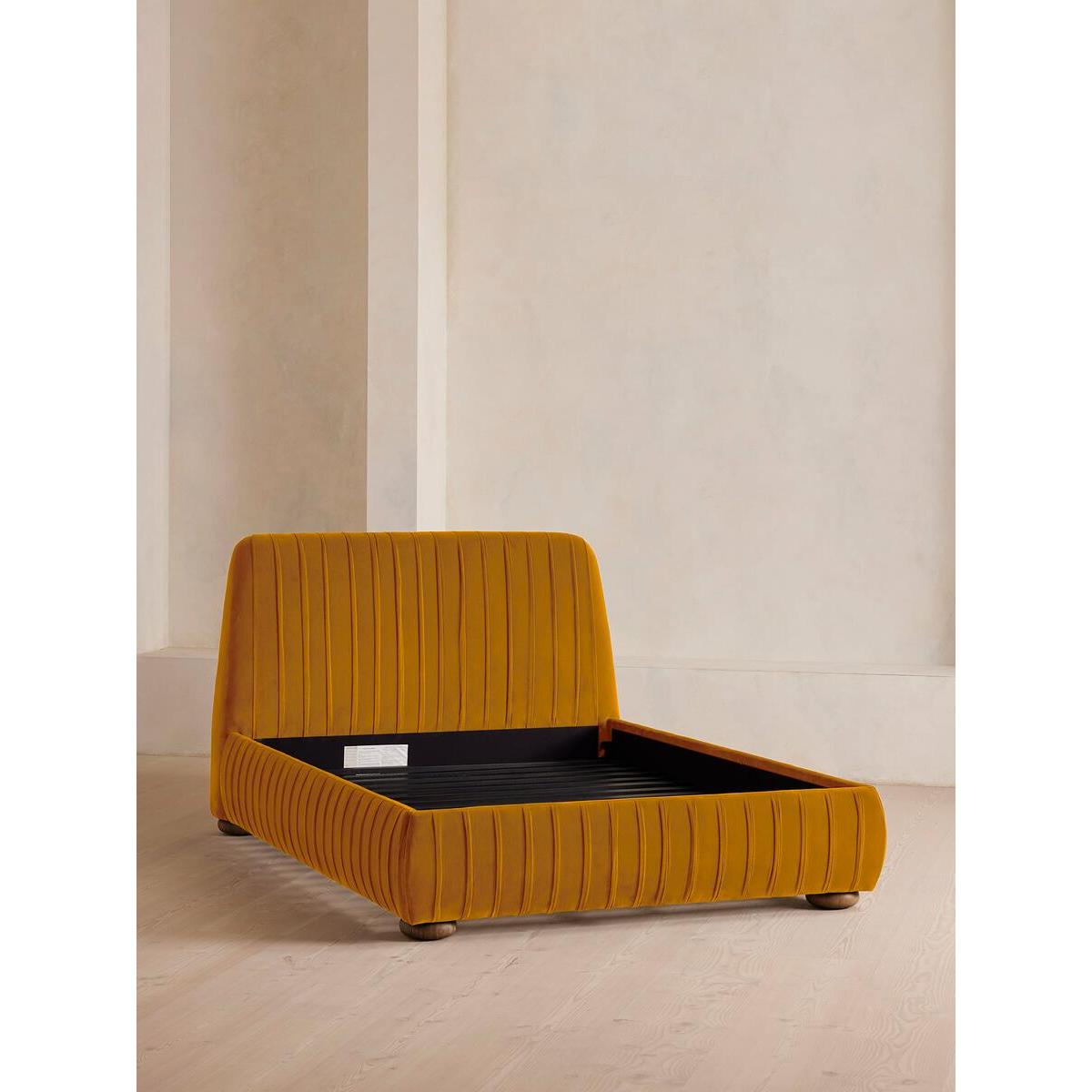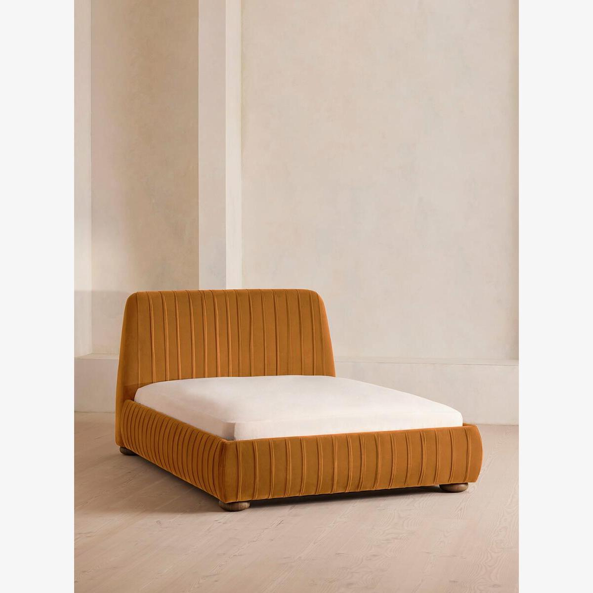 I love this bed for its bold and luxurious velvet upholstery in a striking mustard hue, which instantly adds warmth and personality to a bedroom. It works particularly well in eclectic, contemporary, or mid-century inspired interiors, where its rich colour can be complemented with contrasting cushions, throws, or metallic accents. As a stylist, I recommend keeping the bedding and accessories relatively simple and neutral to let the mustard pop, or pairing it with earthy tones for a cosy, inviting feel. Practical styling tips include placing it against a feature wall or near natural light to highlight the fabric’s texture and colour, and accessorising with textured cushions or a statement headboard to create a personalised and stylish oasis.