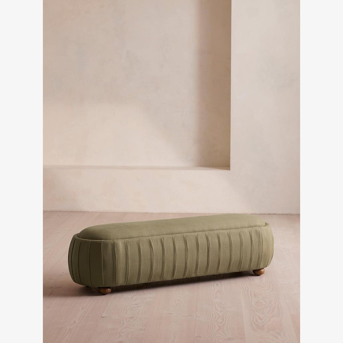 A rounded silhouette upholstered in linen is designed as an extension of our House favourite Vivienne rang Inspired by our members' favourite Vivienne sofa on the eighth floor of White City House, this bench is designed to perfectly complement the Vivienne bed. Its rounded silhouette comes fully upholstered in linen in a range of bespoke colours.