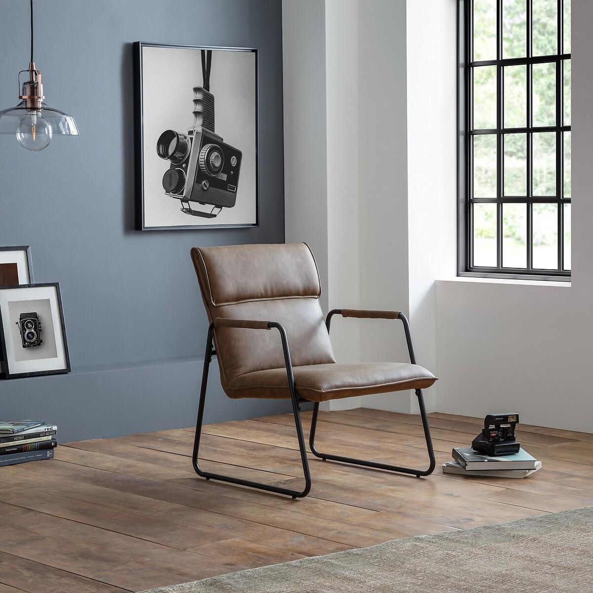 Inspired by a modern, industrial styling, the Vivienne chair is upholstered in a soft faux leather fabric finished in a brown colourway. To chair is designed with a sturdy black metal frame, with a comfortable padded headrest to ensure maximum support. The Vivienne Chair is sure to make a dream scenario in any living space. Product details• Upholstered in soft touch faux leather• Sturdy black metal frame• Padded headrest• Foam fillings• Medium comfort• Full assembly required• 1 year manufacturers warranty. Product Composition - 25% Wood, 25% Foam, 25% Fabric, 25% Metal. Product Dimensions - 60 cm x73 cm x82 cm , Weight - 11.3 KGPackage Dimensions - 89 cm x 58 cm x 44 cm, Weight -14 KGThis product will be dispatched by one of our trusted suppliers. You’ll be contacted by their selected courier about your delivery. Please note: this product cannot be delivered to all Offshore Islands, Northern Ireland or Republic of Ireland. JULIA01