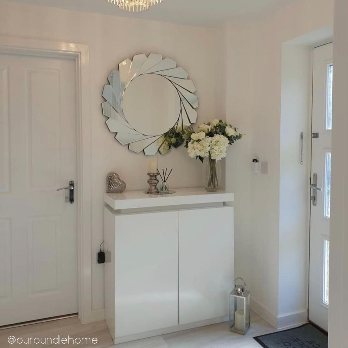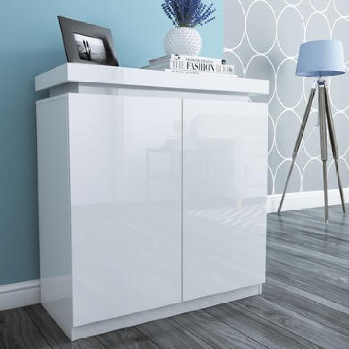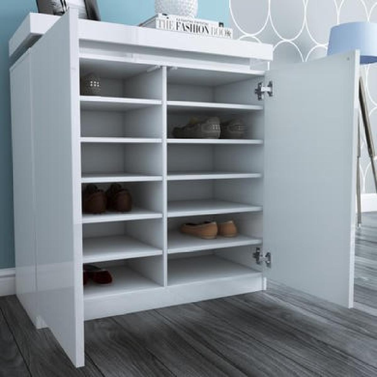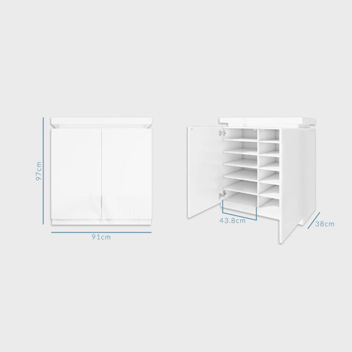 FEATURES. Contemporary storage solution Feature RGB LED lighting trim with remote control. Space enhancing high gloss white finish. Stores up to 24 pairs of shoes10 Removable and adjustable interior shelves. Store shoes of all sizes and shape. Seamless push catch open cupboard doors2 Rear ventilation holes. Super smooth easy clean finish. Durable metal fixtures and fittings. Constructed from a strong wood combination. Can be wall mounted for enhanced stability Assembly required easy step by step instructions included FEATURE LED RGB LIGHTING. CONTEMPORARY TOUCH Sleek and linear the Vivienne high gloss white shoe cabinet is the perfect contemporary finishing touch. The narrow design at 38cm has a seamless appearance with push catch doors and a feature LED lighting trim. The super sleek glossy finish in crisp bright white has a natural shine enhancing the feel of light and space. ILLUMINATE YOUR SPACE Featuring an ultra-modern LED lighting trim the shoe cabinet emits a contemporary glow. Switch between red green and blue and create an ambiance to suit your mood. The cabinet will need to be plugged into the mains but a remote control is included for easy operation. STYLISH STORAGE SOLUTION Hidden behind the seamless push catch double doors are ten shelves storing an impressive 24 pairs of shoes. Whether you're storing boots heels or flats all the shelves can be removed or height adjusted with multiple slots available making it easy for you to configure the design to suit your shoe collection. . SUPER SLEEK The Vivienne shoe cabinet has a strong design constructed from a tough wood combination with a sleek high gloss finish in fresh white. The smooth nature of the modern glossy finish makes the shoe cabinet easy to wipe clean and maintain a pristine appearance. Complete with durable metal fixtures and fittings and push catch doors. It is possible to wall mount the cabinet to enhance stability ideal for high traffic areas of the home such as the hallway. ASSEMBLY REQUIRED Delivered flat packed the Vivienne shoe cabinet will require self-assembly. Assembly can be managed by one person and shouldn't take up too much time with easy to follow step by step instructions includedDIMENSION S. H97 X W91 X D38 CM ..