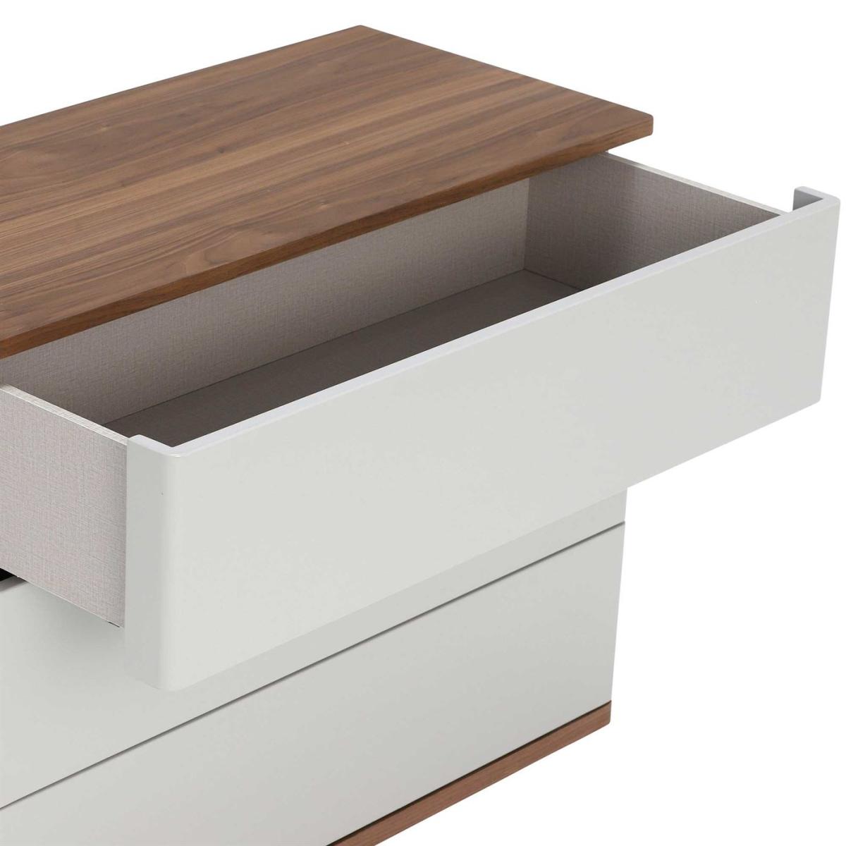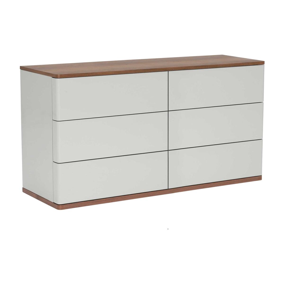 Design. Sitting beautifully alongside other pieces from the range, the Vivika 6 drawer wide chest brings modern style to any bedroom. Pairing walnut accents with a grey high gloss finish, it complements a wide range of interior schemes. Handleless drawers keep the look clean and simple, with push release mechanisms to allow easy access to what’s inside. Generously sized, the chest of drawers offers plenty of storage for clothing, whilst its spacious top is calling out for accessories and beautiful bits of decoration.