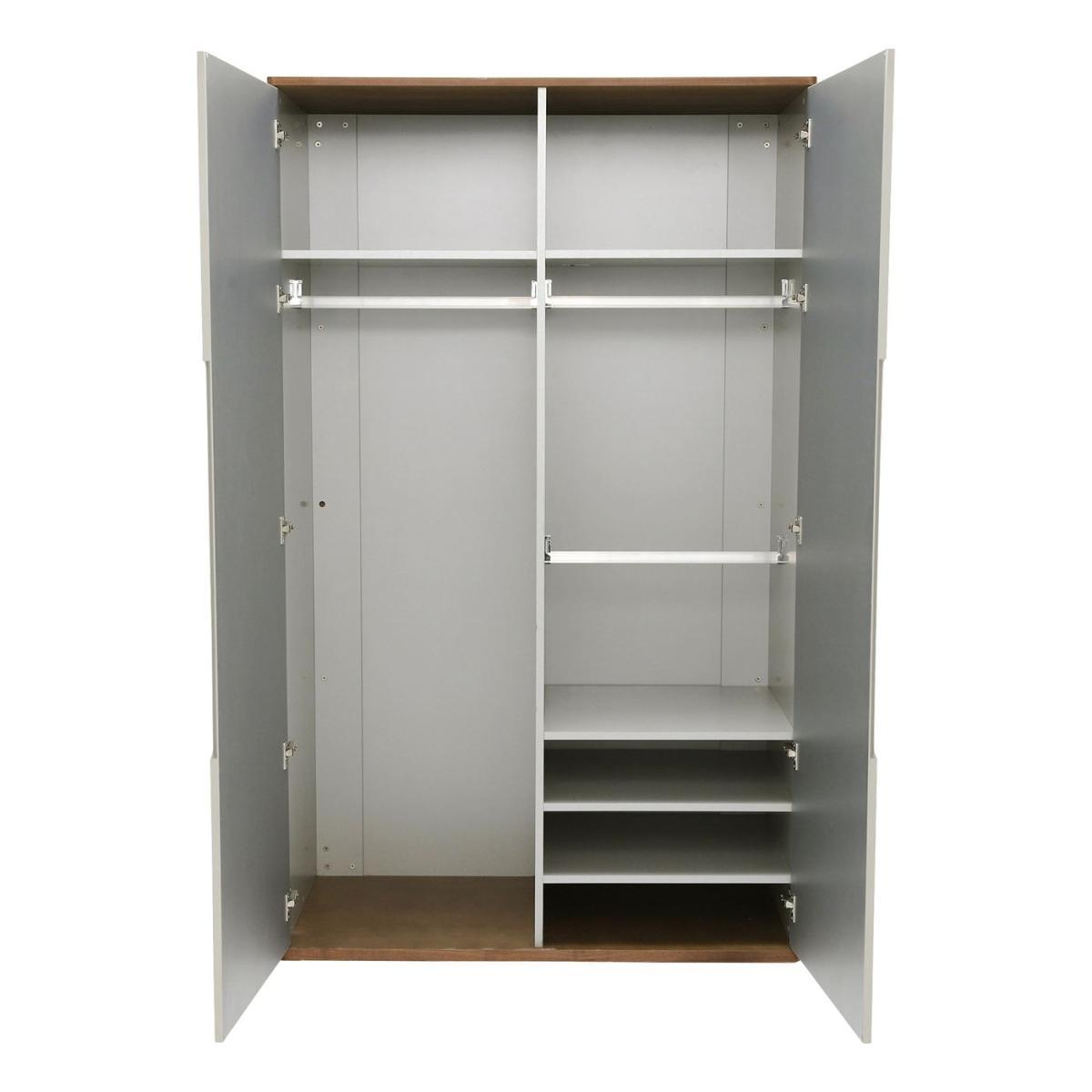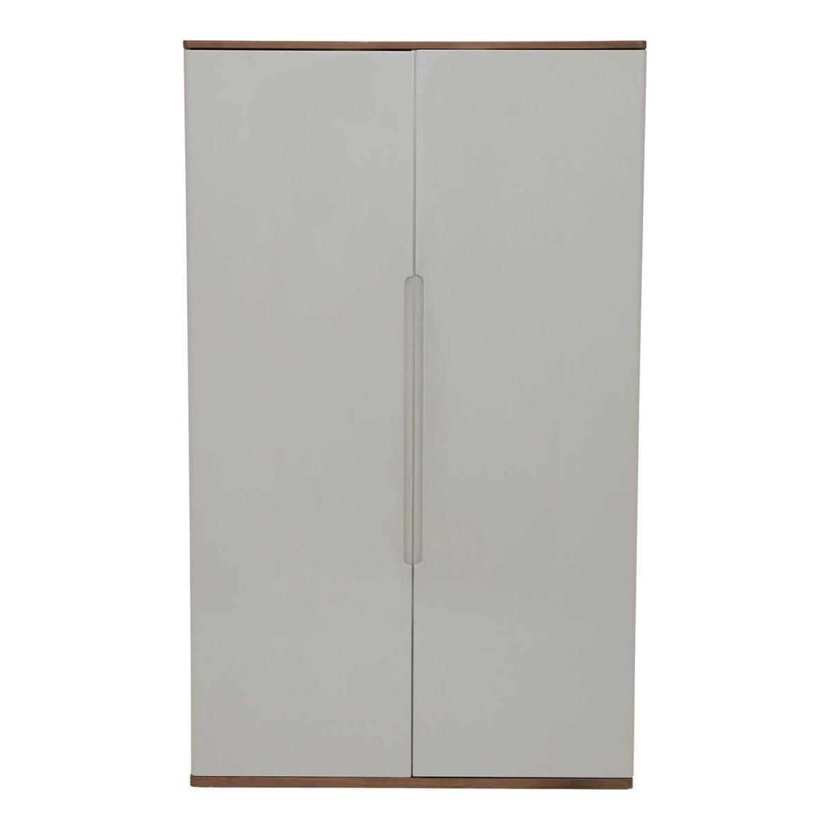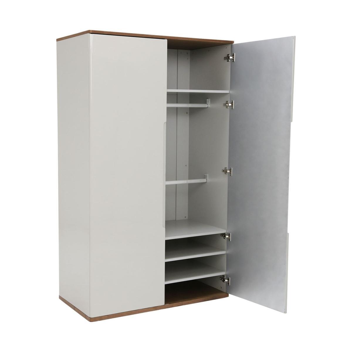 Design. A storage solution with style to spare, the Vivika double wardrobe contains plenty of space for clothing, bedding, shoes and more. Featuring two separate compartments with a configuration of fixed shelves, adjustable shelves and hanging space, the wardrobe is perfect for a wide range of lifestyles. A stunning place to keep your treasured garments, Vivika boasts a modern high gloss finish with smooth rounded corners. A walnut top and base bring character and warmth to the look, contrasting beautifully against the cool grey. Perfect for minimalist interiors, the 2 wardrobe doors are handleless, with inset grooves to grip on to. Also available in the matching Vivika bedroom furniture range are chests of drawers, a bedside table, dressing table, stool and bed frame.