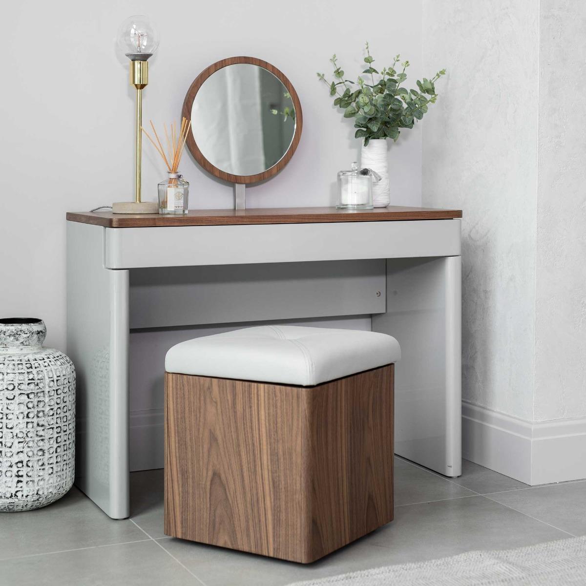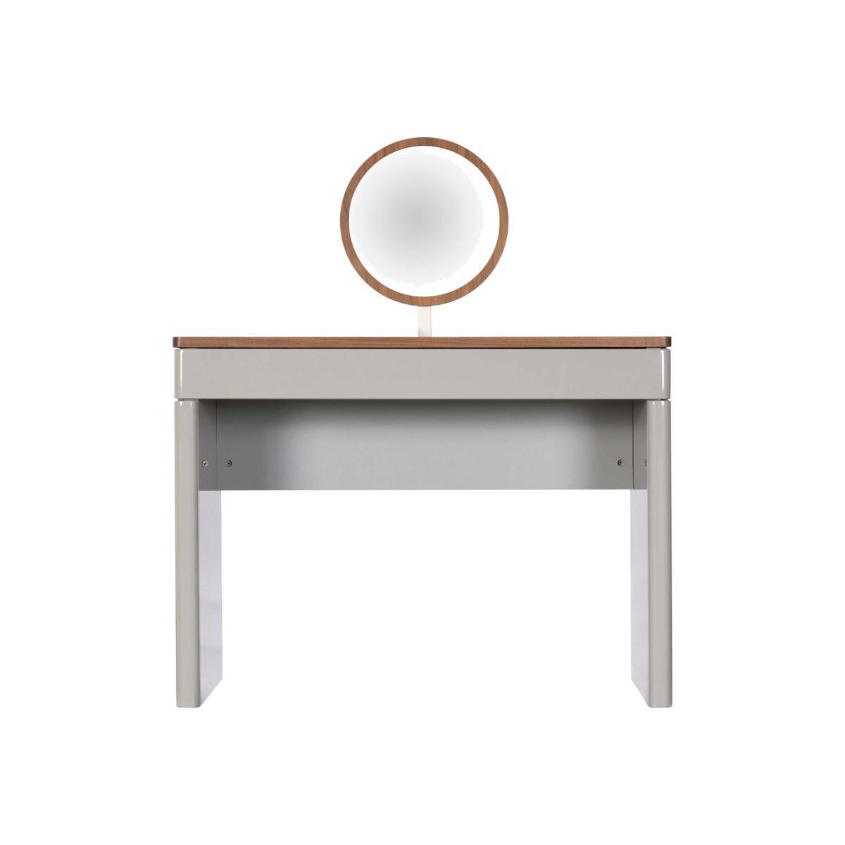 Bringing together rich wood and grey high gloss, the Vivika dressing table achieves contemporary style with a twist. The slim design allows plenty of space for sitting, whilst a wide drawer offers discreet storage for those beauty essentials. A built-in round mirror takes the trouble out of choosing one, wrapped in a walnut finish to match the table top. Featuring rounded edges, Vivika is smooth and modern. Pair with the