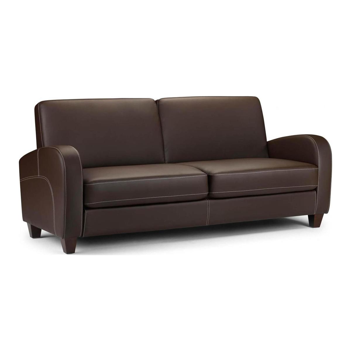 Upholstered in faux leather, the Vivo 3 Seater Faux Leather Sofa features a comfortable deep cushioned seat and foam filled back cushion for a relaxing yet supportive sit. The chestnut brown upholstery is complemented by cream stitching, while the curved arms add a further contemporary touch. Set on sturdy wooden block legs, this sofa is as robust as it is stylish.\n\nPlease note, unfortunately we cannot deliver this item to the Channel Islands.\n\n[Click here](https://www.dunelm.com/infodocs/downloads/Furniture-Sizing-Guide.pdf) to check out our handy sizing guide to help you find out if you’ll be able to get your new furniture into your home.