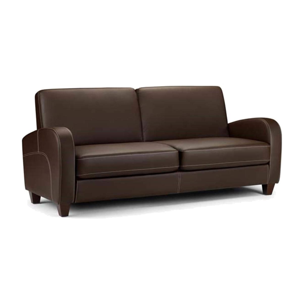 Cosy comfortable and cosmopolitan the Vivo 3 Seater Sofa ticks all the boxes and is the ideal addition to your lounge kitchen or even conservatory. DIMENSIONS. W183 x D79.5 x H83 cm FEATURES. Versatile Style. Adds a sleek accent to any room Rich brown high quality faux leather Solid wooden frame. Easy wipe clean finish. Contrast stitching adds a stylish touch. Comfortable padded design and shape. Minimal easy self-assemblt. Co-ordinating items available. HOW BIG AM I? With a retro inspired design the Vivo sofa has a relaxed spacious shape. Designed to comfortably sit three. A fairly compact design with no chunky pieces enables the Vivo sofa to fit perfectly in to many spaces. HOW DO I LOOK? Rich brown faux leather brings an instant touch of luxury and warmth to your room. Smooth curves from the rounded arms and seat cushions bring in a relaxed styling which compliments the true comfort given by the padded seats. WHAT AM I MADE OF? With a solid wooden frame finished with brown faux leather the Vivo will last the test of time. HOW EASY AM I TO PUT TOGETHER? Arriving in two sections for convenience minimal assembly is required for the Vivo. Easy to follow assembly instructions show you how to screw your two sections together. All the parts and pieces are included so you won't even need your own screw driver!Don't just take our word for it though we have added a copy of the assembly instructions here so that you can see for yourself!. .