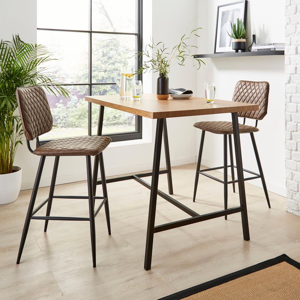 I love how this oak-effect bar table brings a pared-back, modern edge to both compact city flats and open-plan kitchens. Its slim metal frame and warm wood finish work equally well in Scandi-inspired schemes or industrial loft looks, and the generous surface means you can pop out of formal dining and still spread out for breakfast or casual drinks. For styling, pair it with woven or leather-effect stools in contrasting tones, add a simple pendant light overhead and a neat row of herbs or succulents for a touch of greenery. Keep accessories minimal - a set of ceramic tumblers and a slim runner rug underneath will keep the look fresh and inviting.