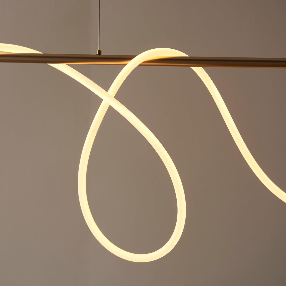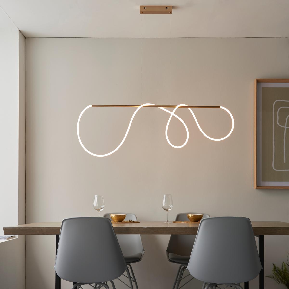 * Unique Look & Design * Flexible Silicone Tube * Height Adjustable - Tailored Ambience * Integrated Warm White LED Make a statement with Vogue Lighting's unique Aletta Modern Adjustable LED Pendant Light. With eye-catching satin gold metalwork; a flexible LED silicone tube; height adjustable capabilities; and a 43 watt integrated LED light, it's your home's newest must-have.