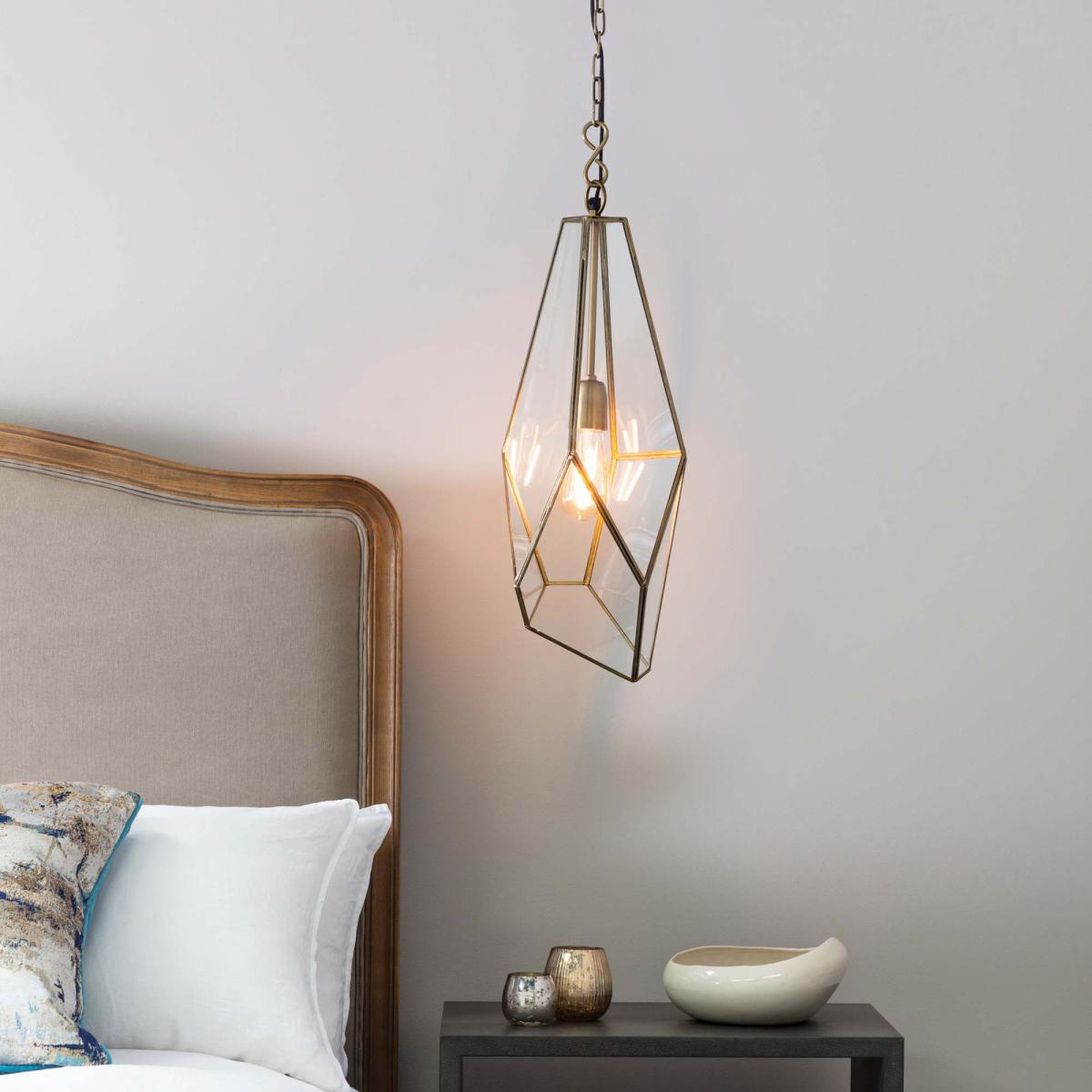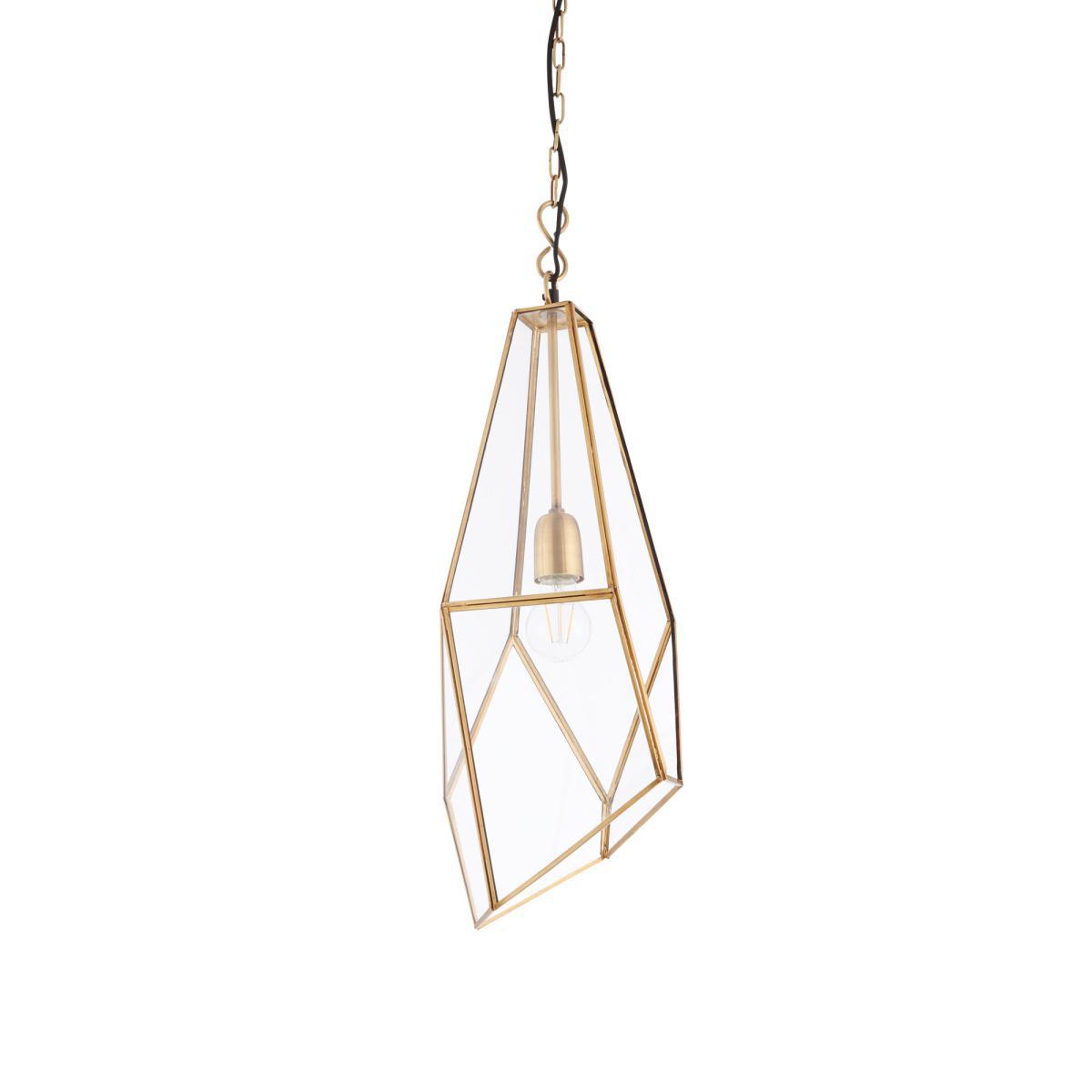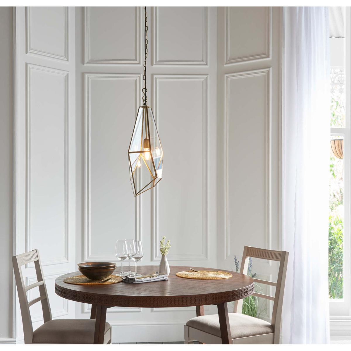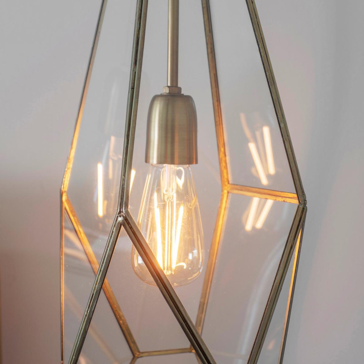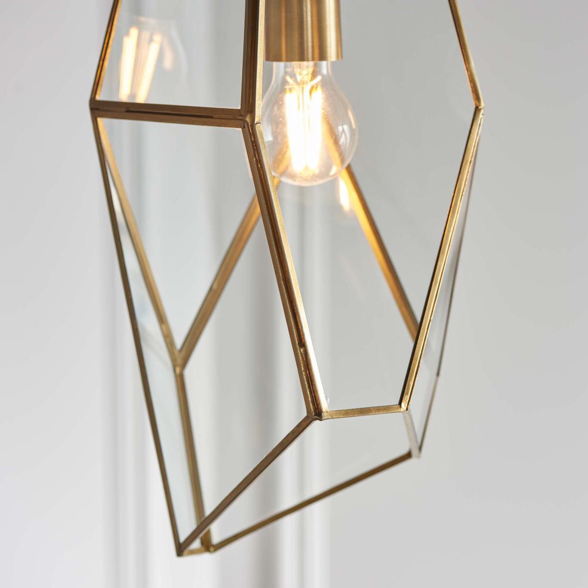 This angular cage single pendant, is ideal for adding that modern touch to your home. With clear glass panels and an antique brass finish, this light combines classic and contemporary to form the perfect light. This light has an adjustable height and it is dimmable.